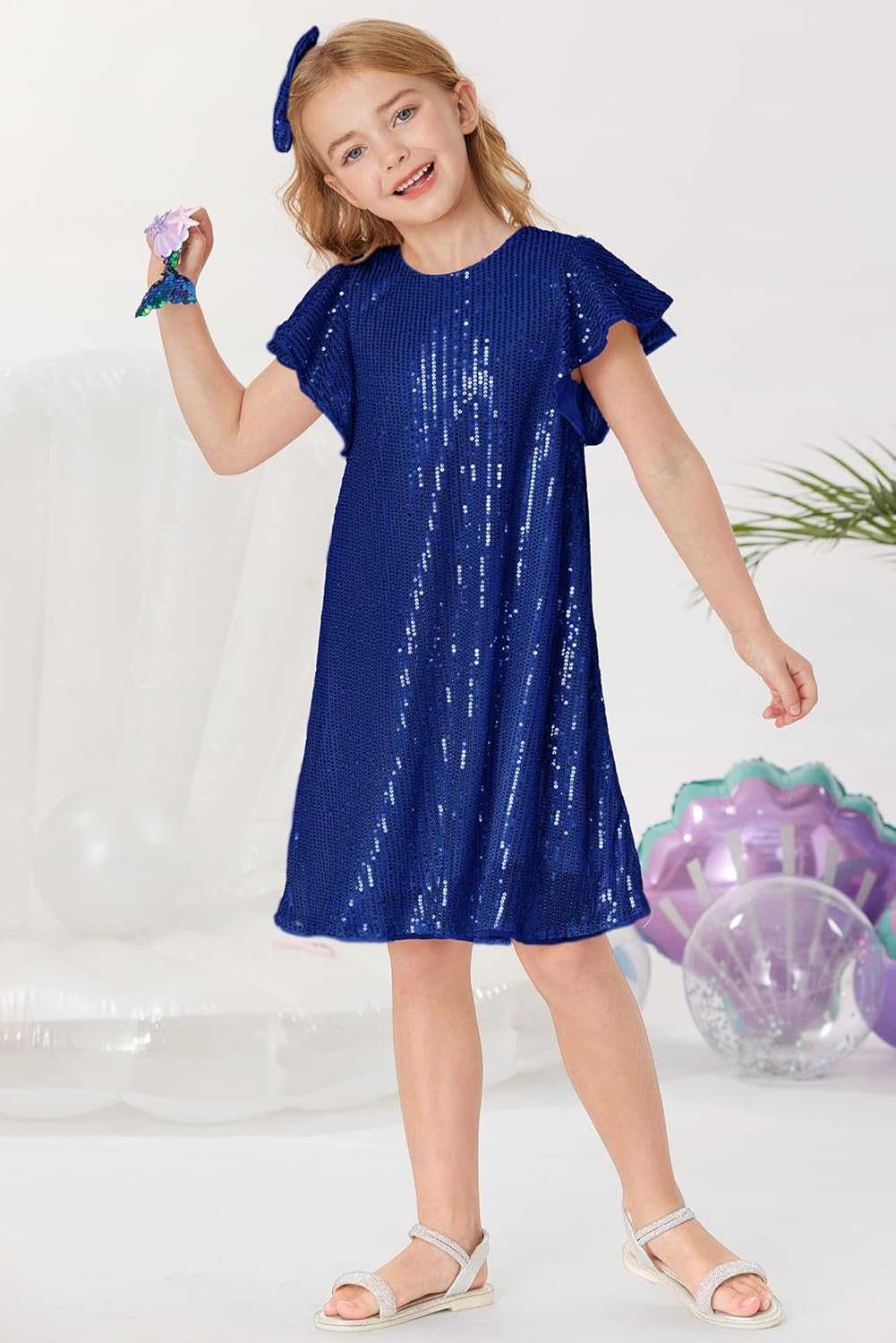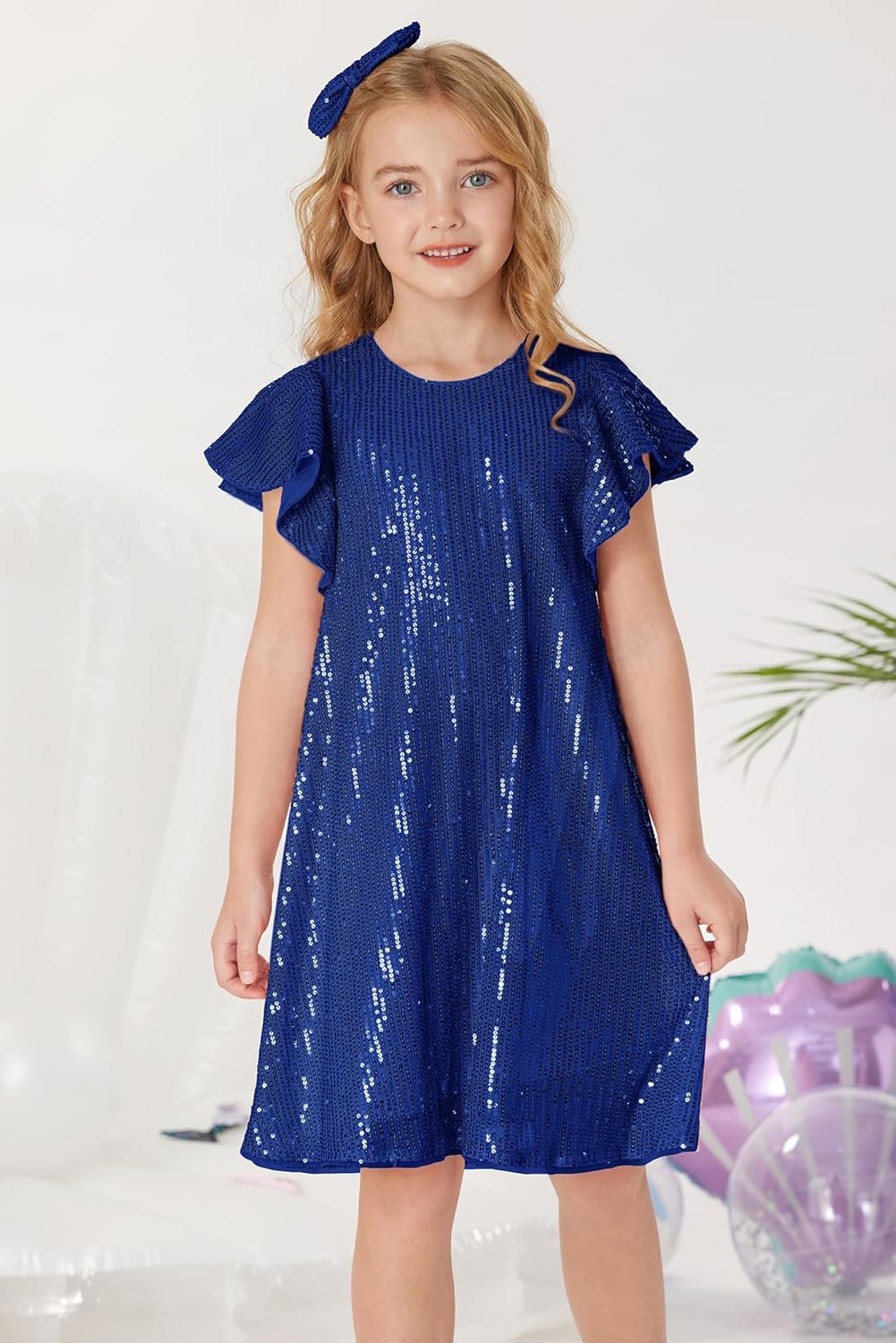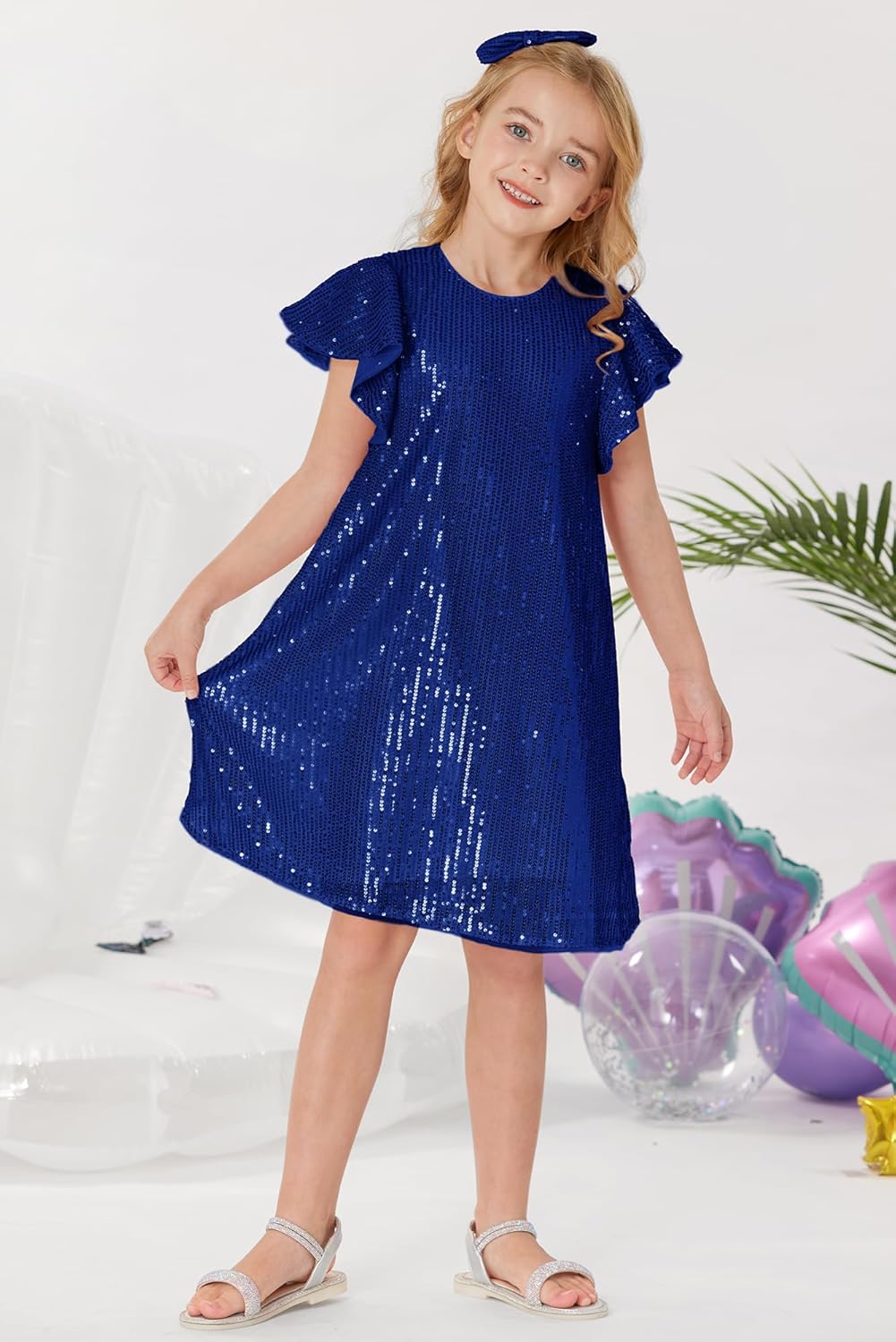 GRACE KARIN Girls Sequin Dress Short Flutter Sleeve Flare Silhouette Midi Dress with Hairbow 5-12Y(Royal Blue)