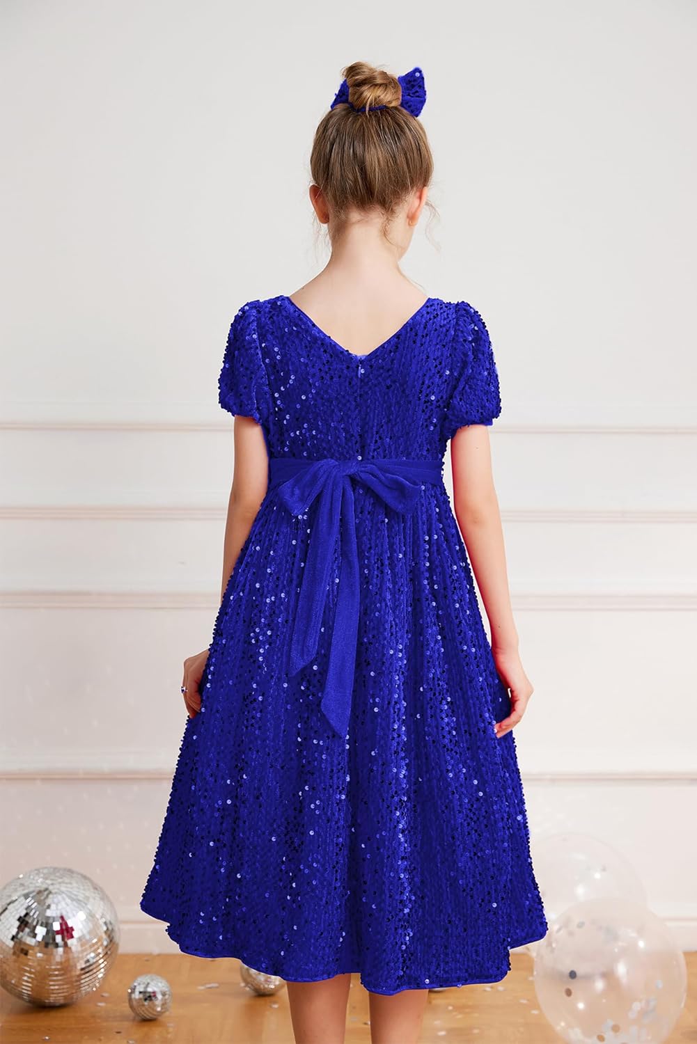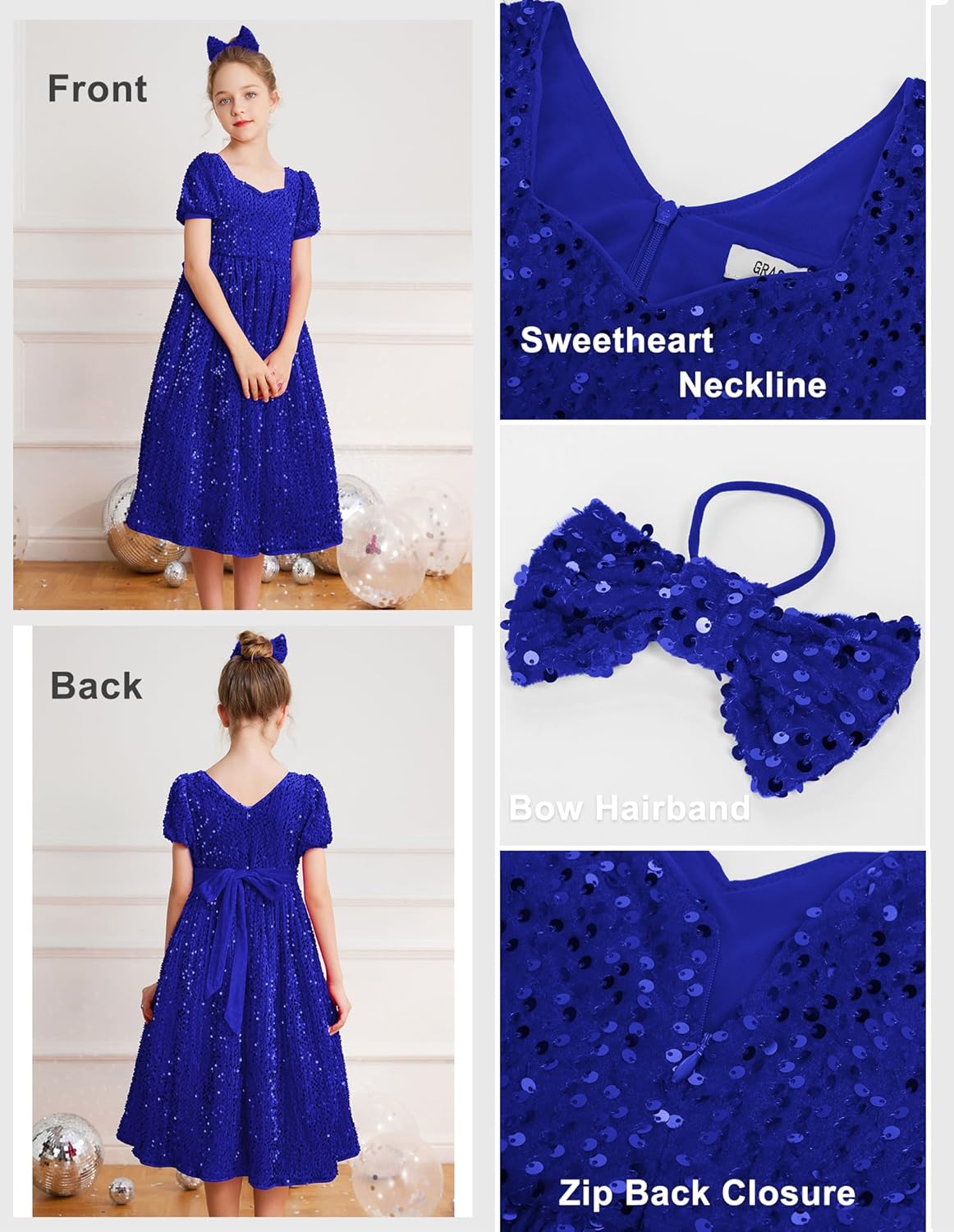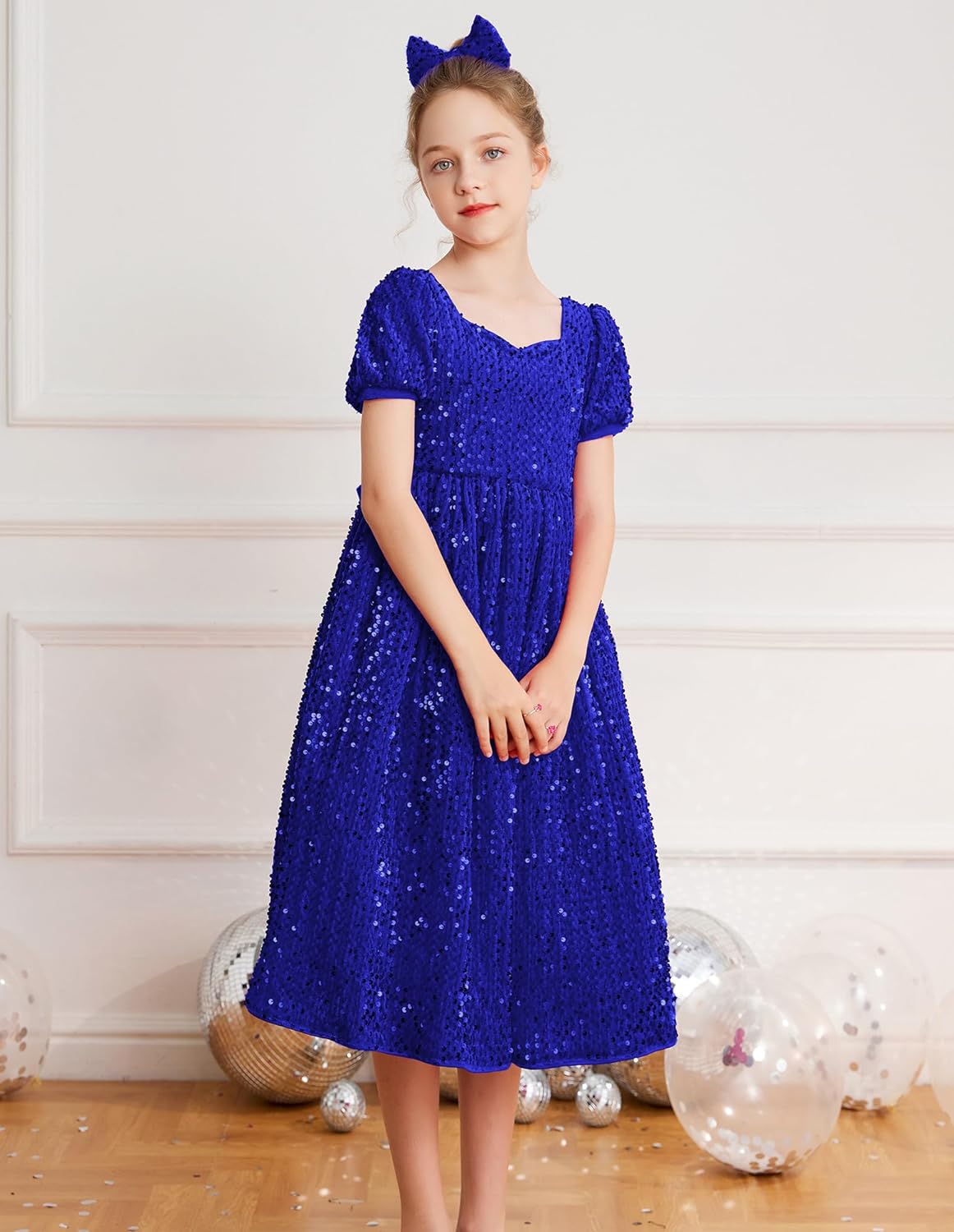 GRACE KARIN Girls Sequin Dress Short Sleeve Sparkly Princess Party Maxi Dress 5-12Y(Royal Blue)