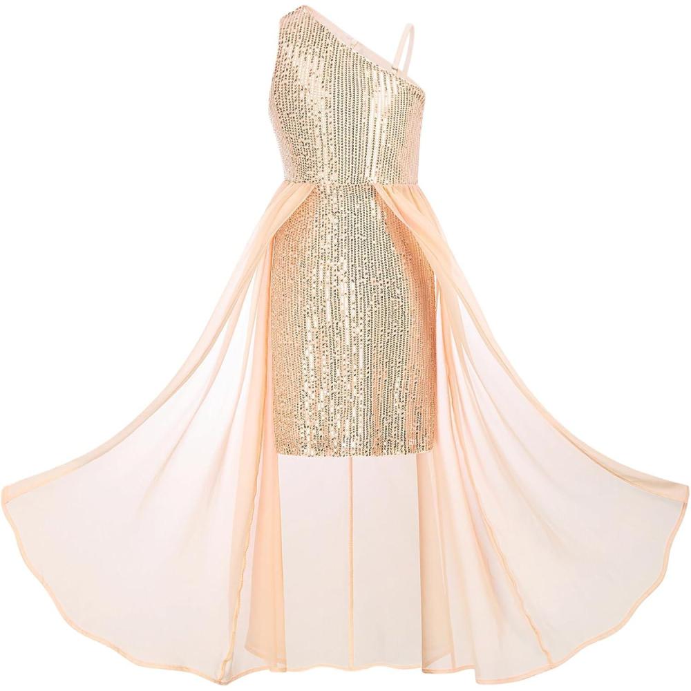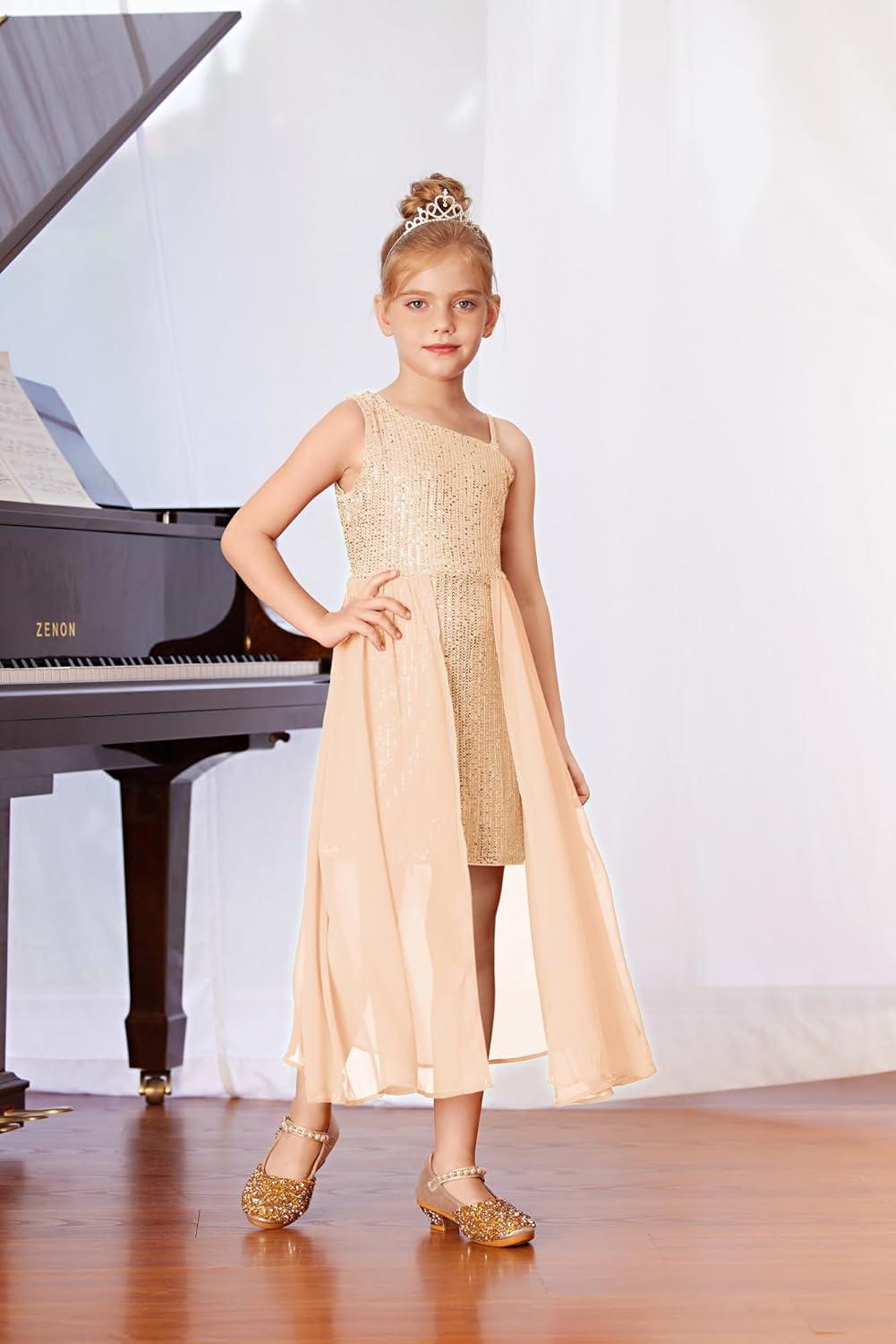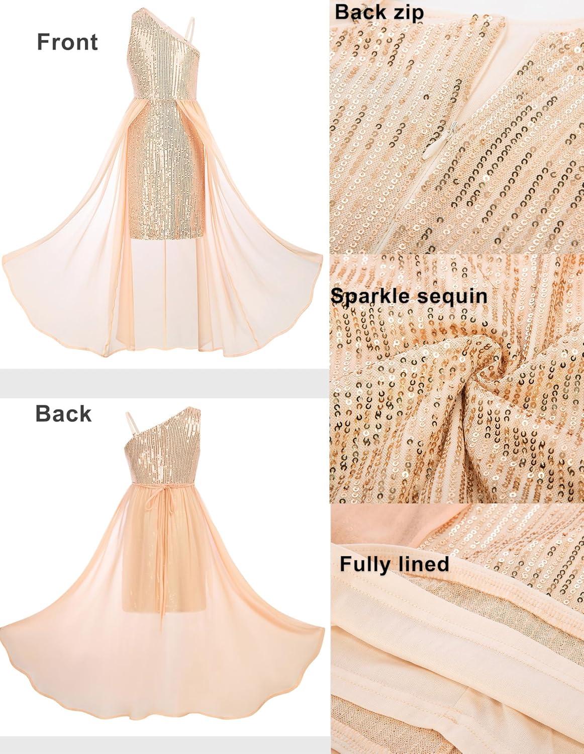 GRACE KARIN Girls Sequin Formal Dress Sequin Pageant Wedding Guest Dresses Birthday Fancy One Shoulder Dress Size 6-14(Champagne)