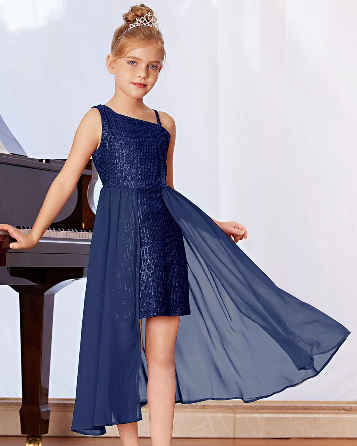GRACE KARIN Girls Sequin Formal Dress Sequin Pageant Wedding Guest Dresses Birthday Fancy One Shoulder Dress Size 6-14(Dark Blue)