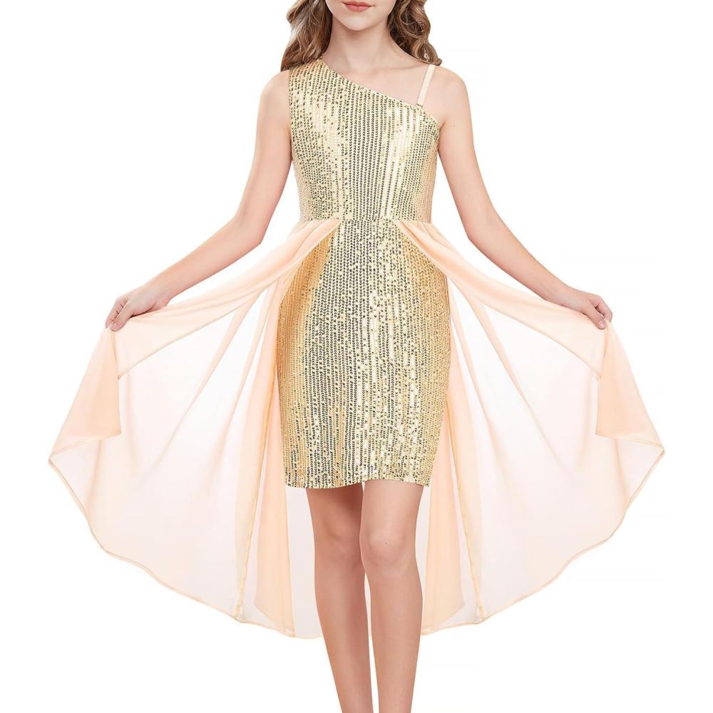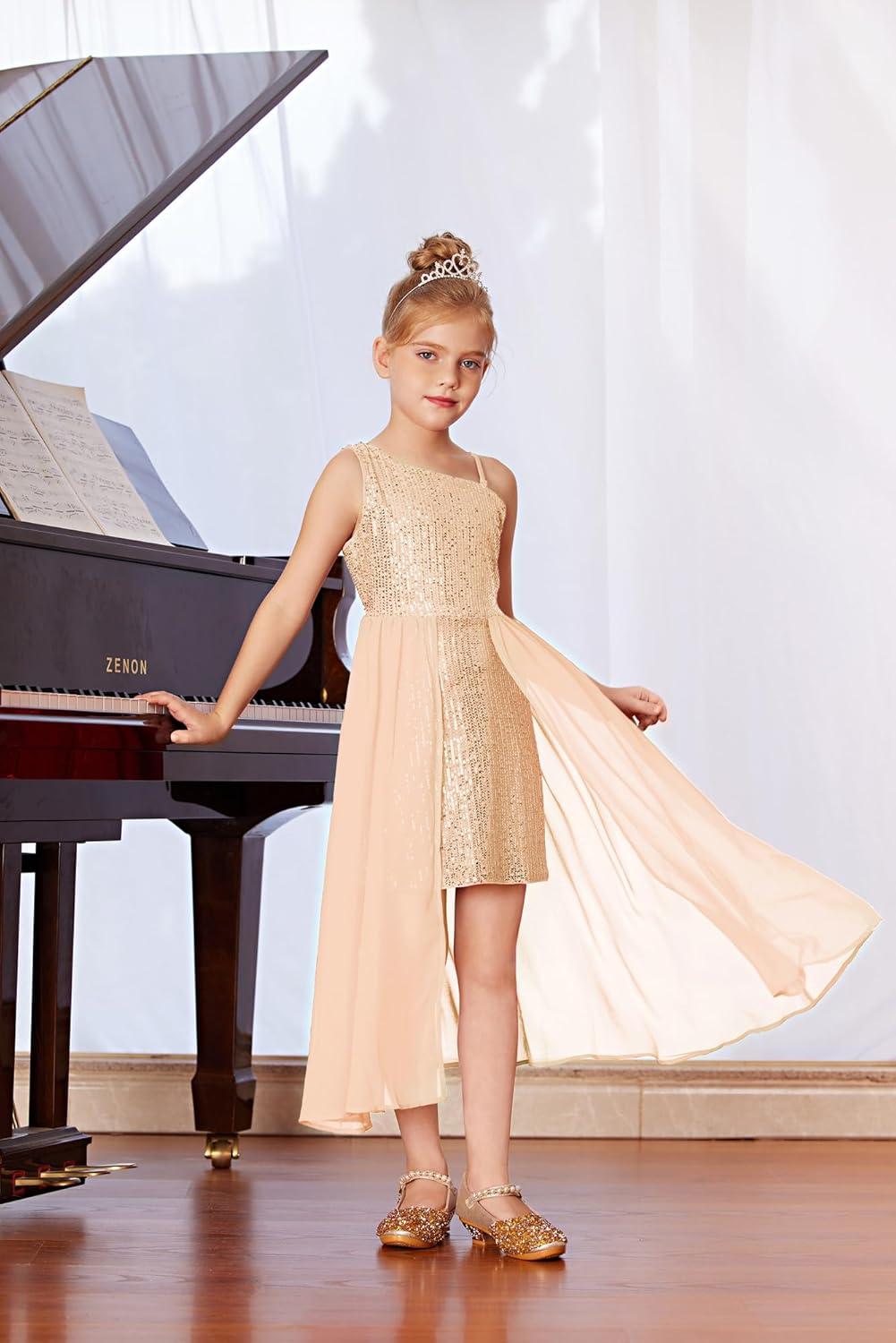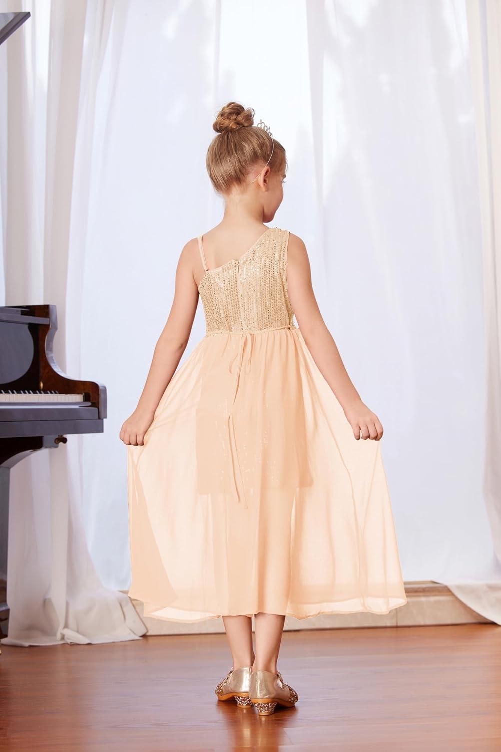 GRACE KARIN Girls Sequin Formal Dress Sequin Pageant Wedding Guest Dresses Birthday Fancy One Shoulder Dress Size 6-14(Gold)