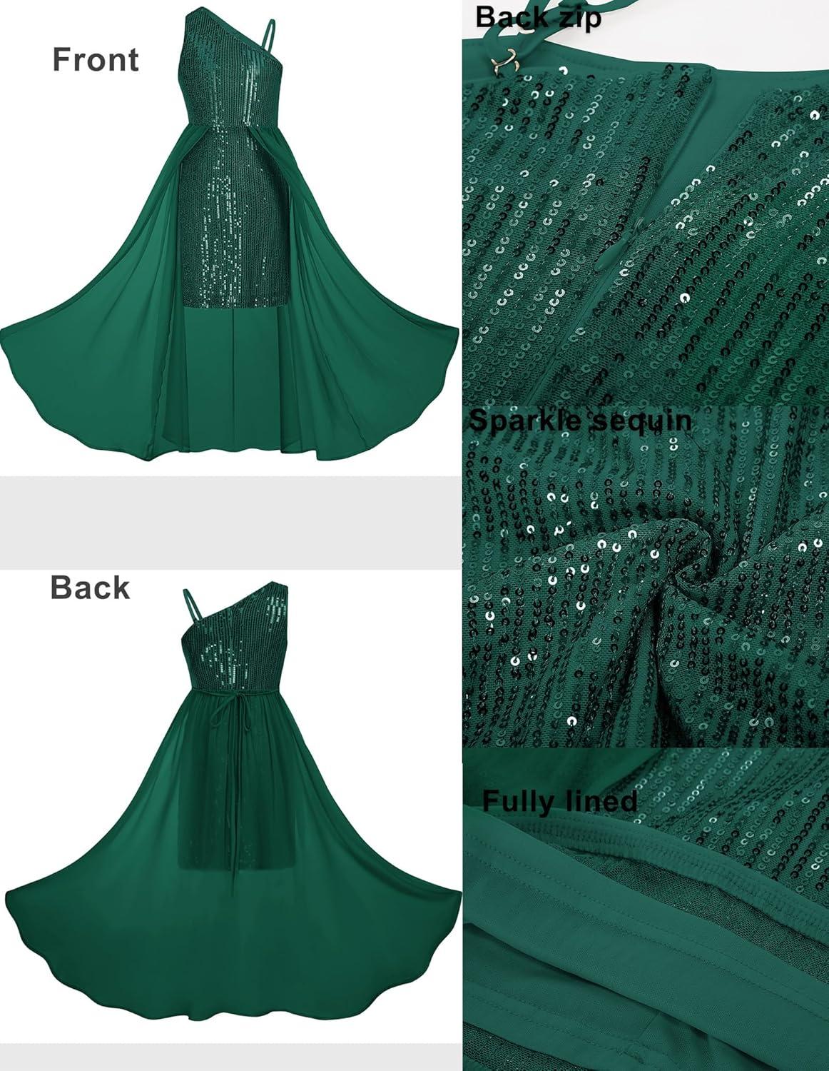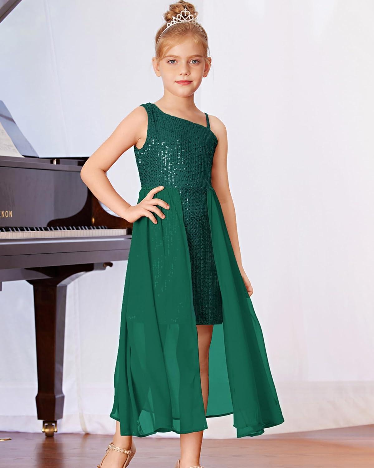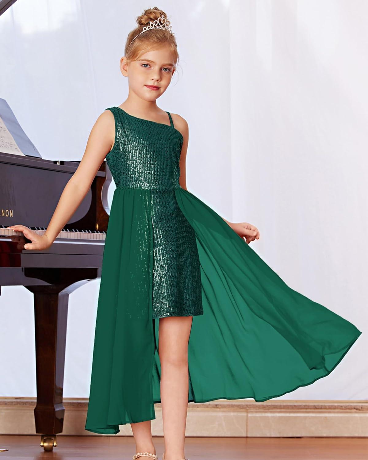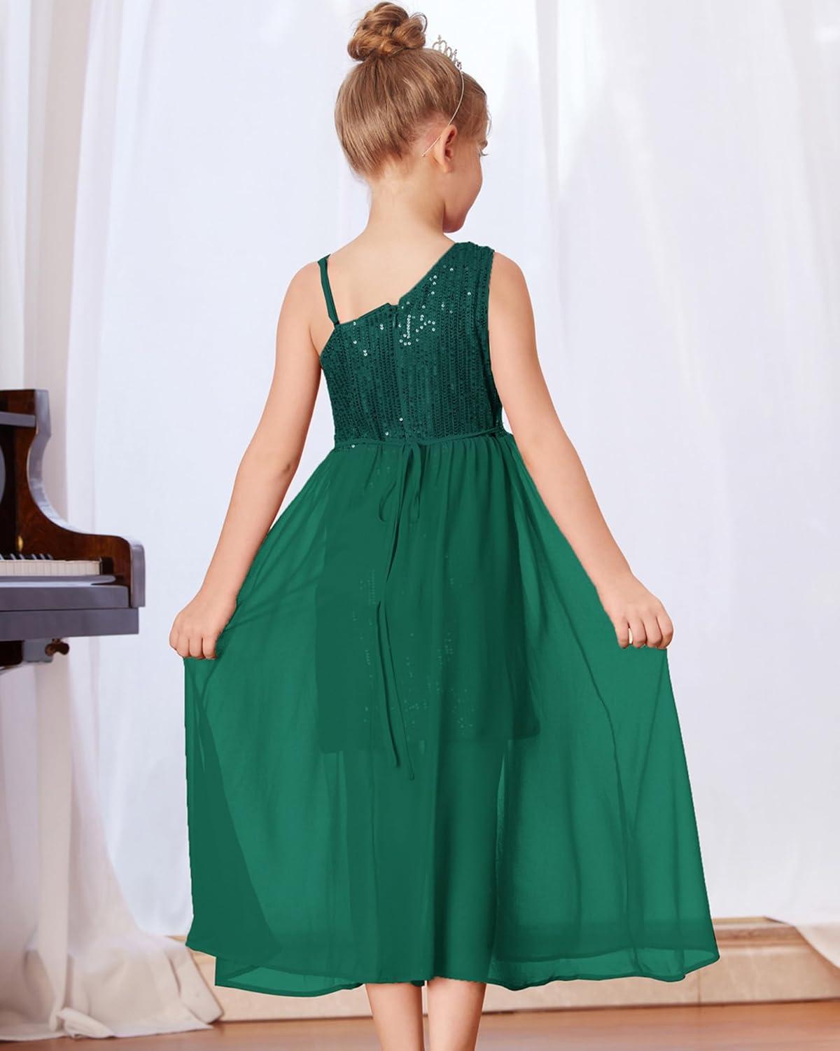 GRACE KARIN Girls Sequin Formal Dress Sequin Pageant Wedding Guest Dresses Birthday Fancy One Shoulder Dress Size 6-14(Green)