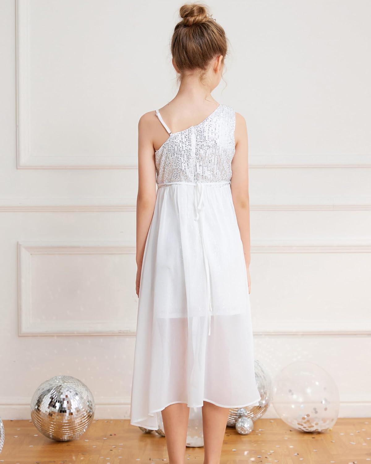GRACE KARIN Girls Sequin Formal Dress Sequin Pageant Wedding Guest Dresses Birthday Fancy One Shoulder Dress Size 6-14(Sliver)