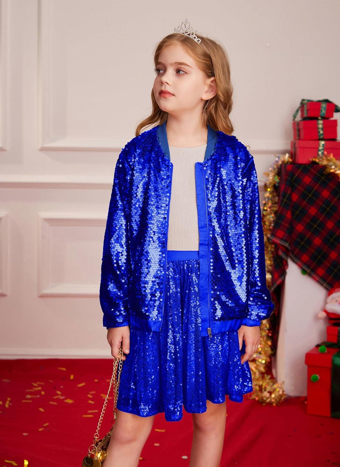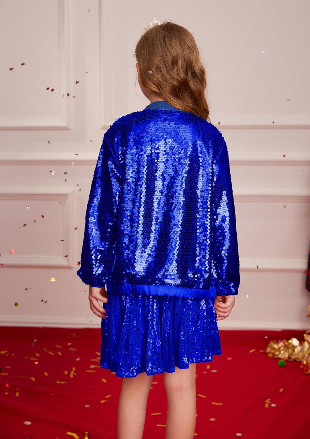GRACE KARIN Girls Sequin Jacket Kids Bomber Zip Outwear Sparkle Fall Costume Top Dress Coat Size 5-14(Royal Blue)
