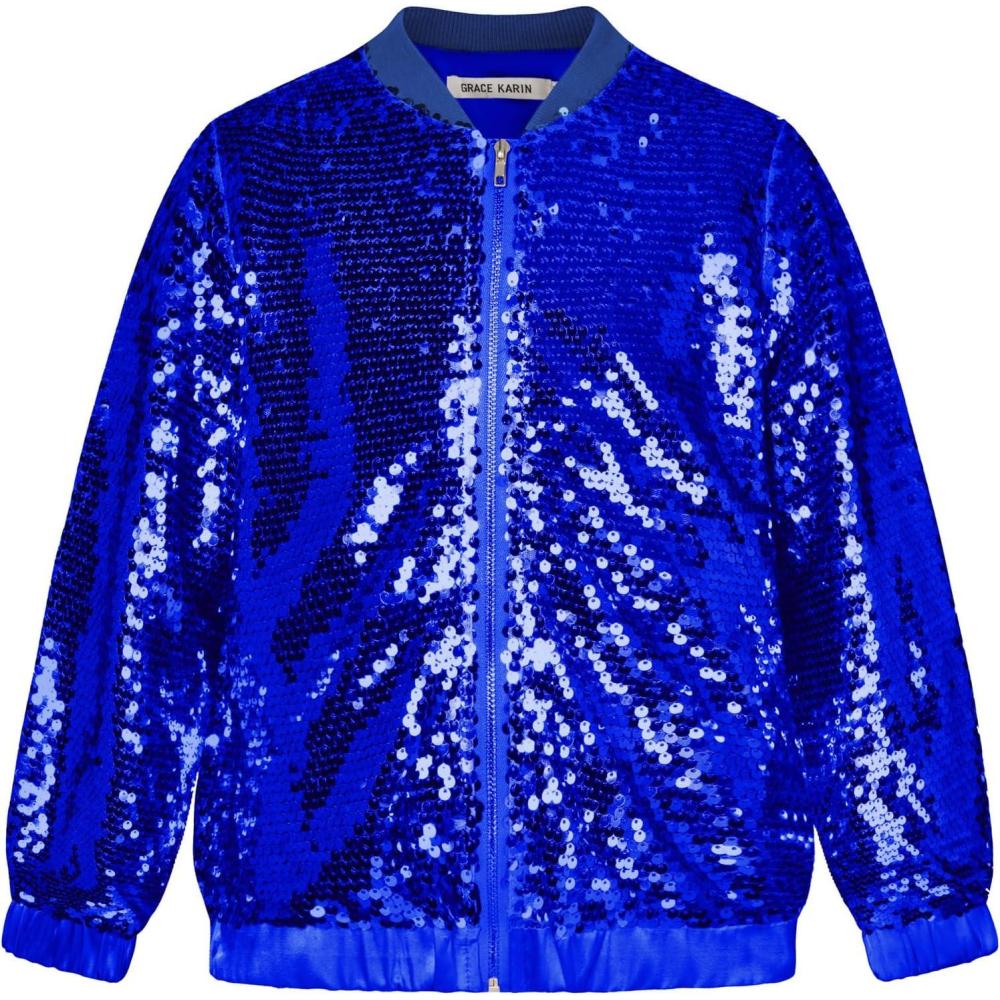 imageGRACE KARIN Girls Sequin Jacket Kids Bomber Zip Outwear Sparkle Fall Costume Top Dress Coat Size 514Royal Blue