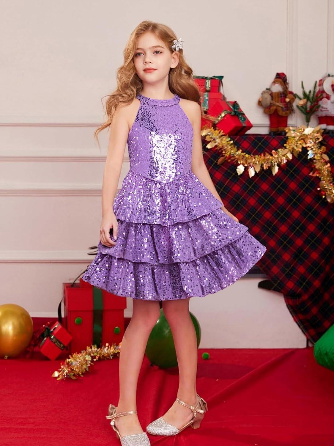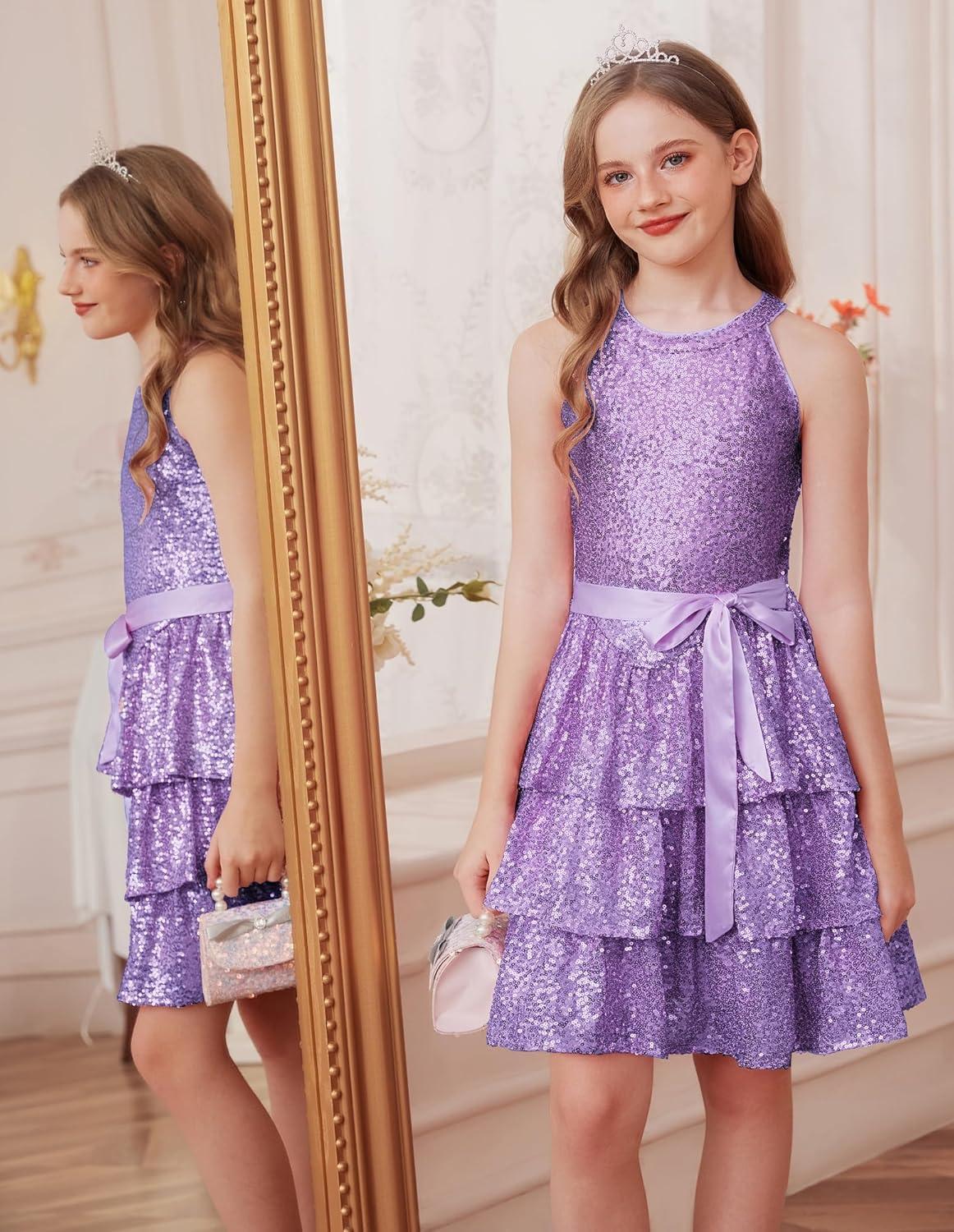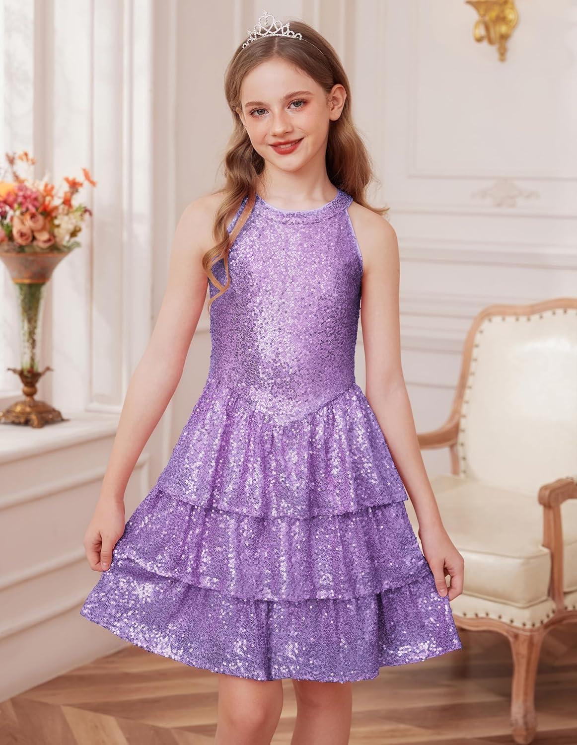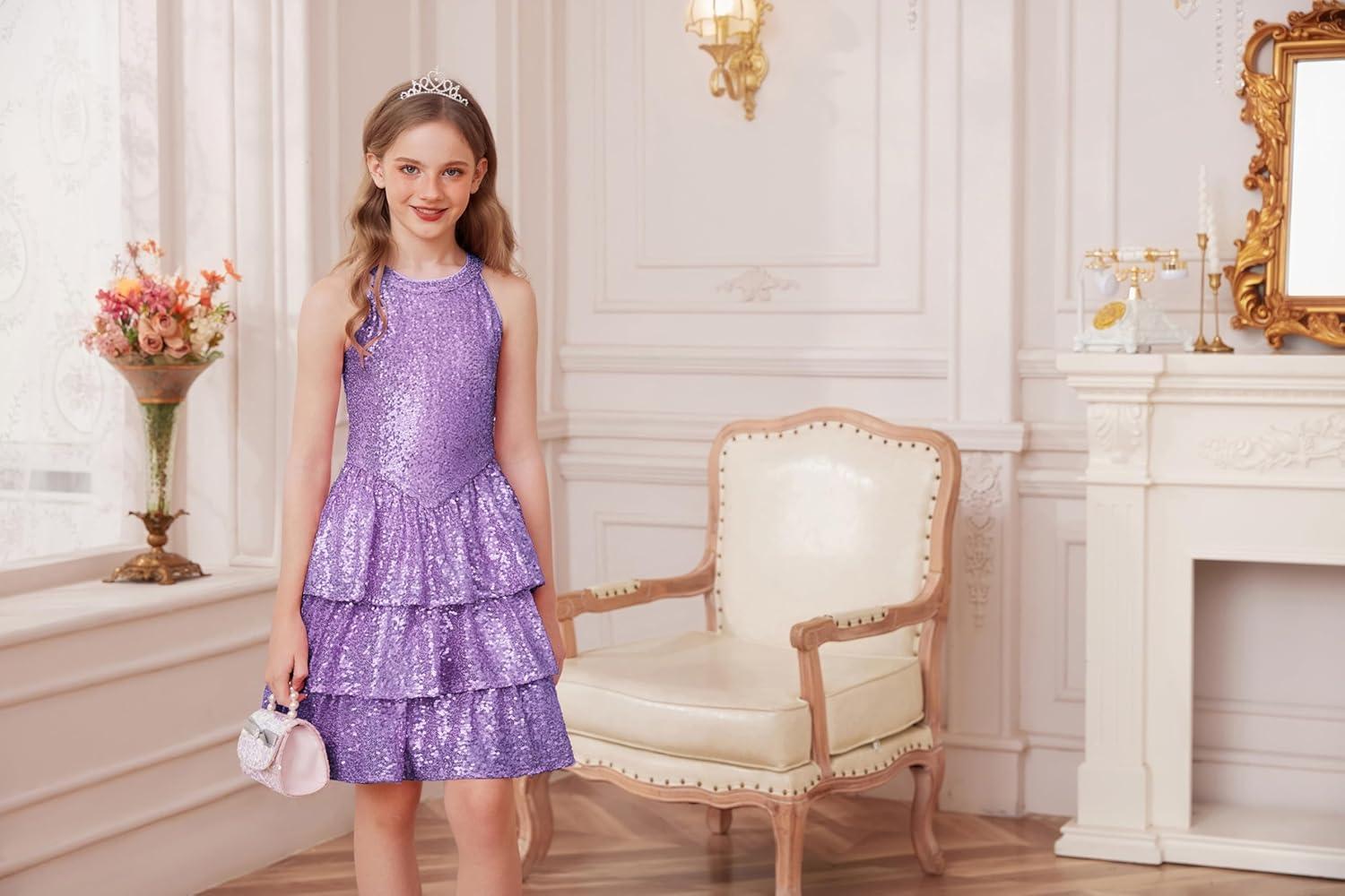 GRACE KARIN Girls Sequin Party Dress Kids Sparkly Formal Birthday Teen Special Occasion Fancy Pageant Dresses Size 6-14(Purple)