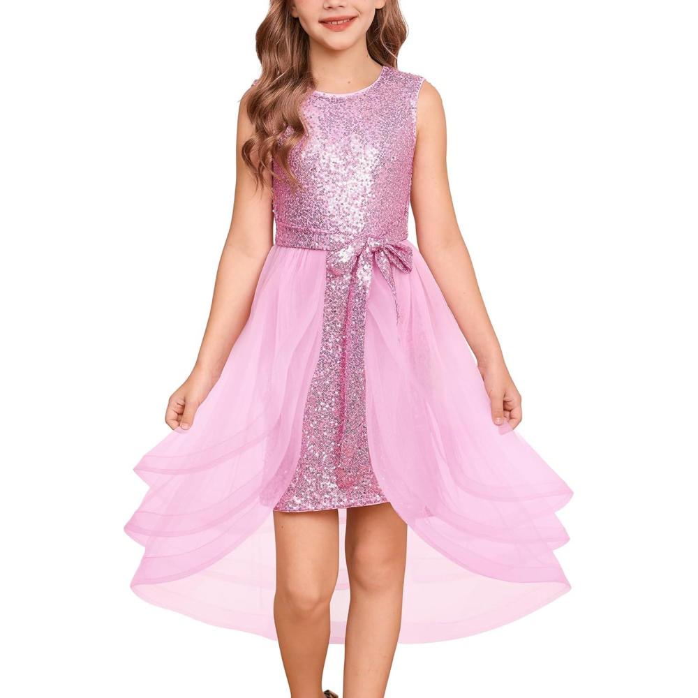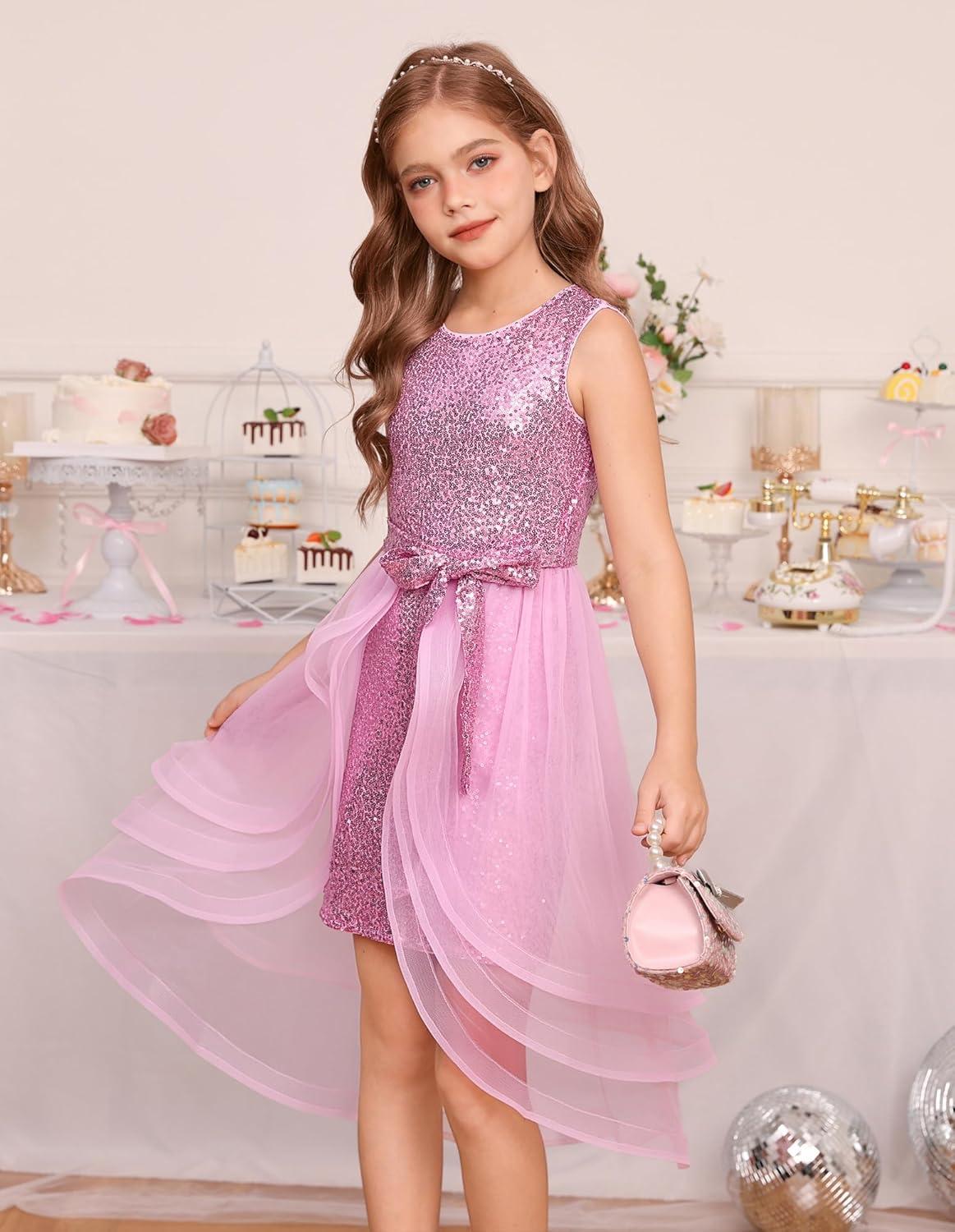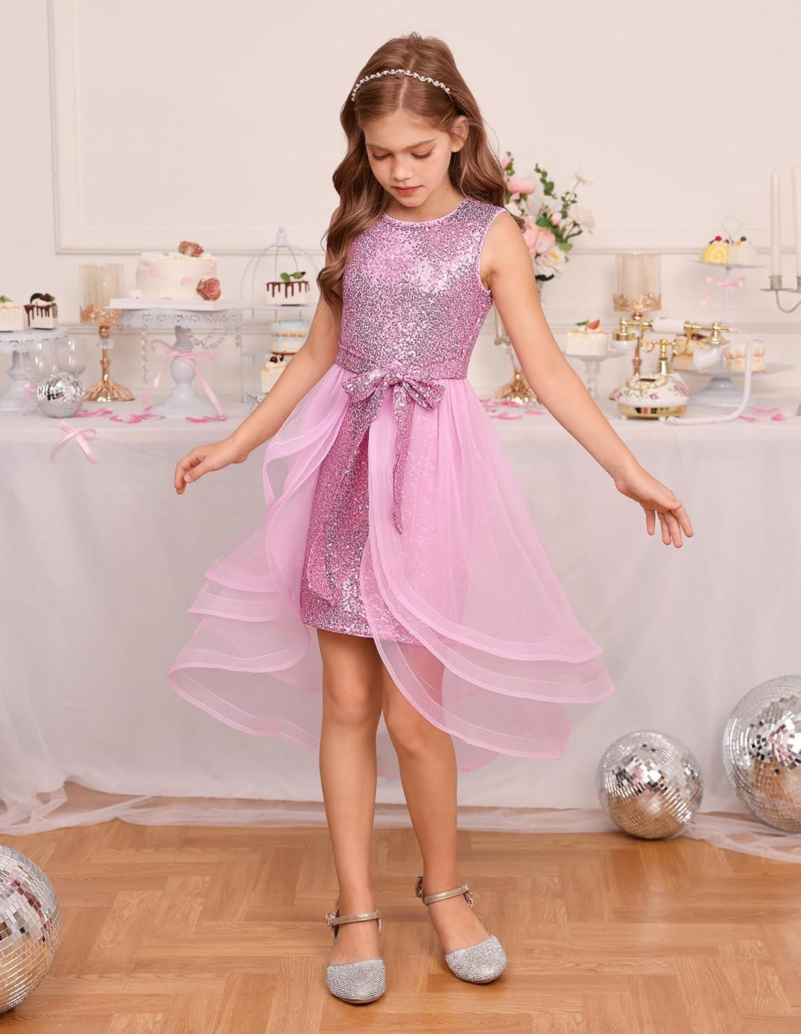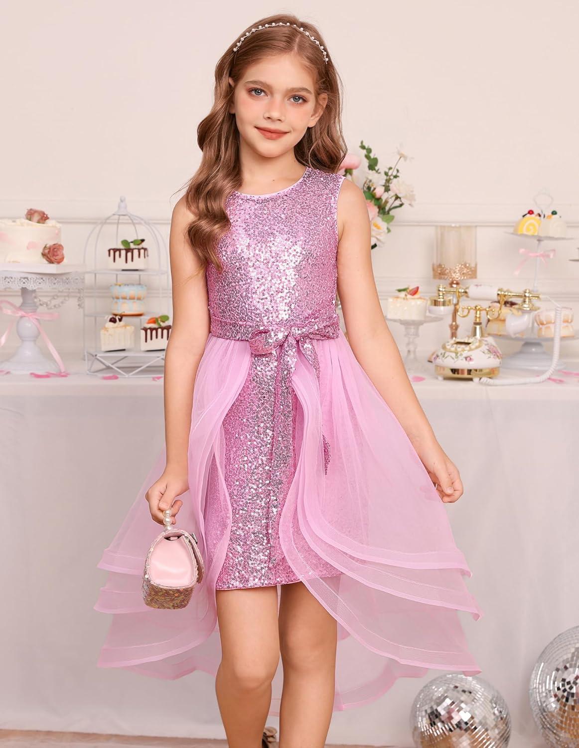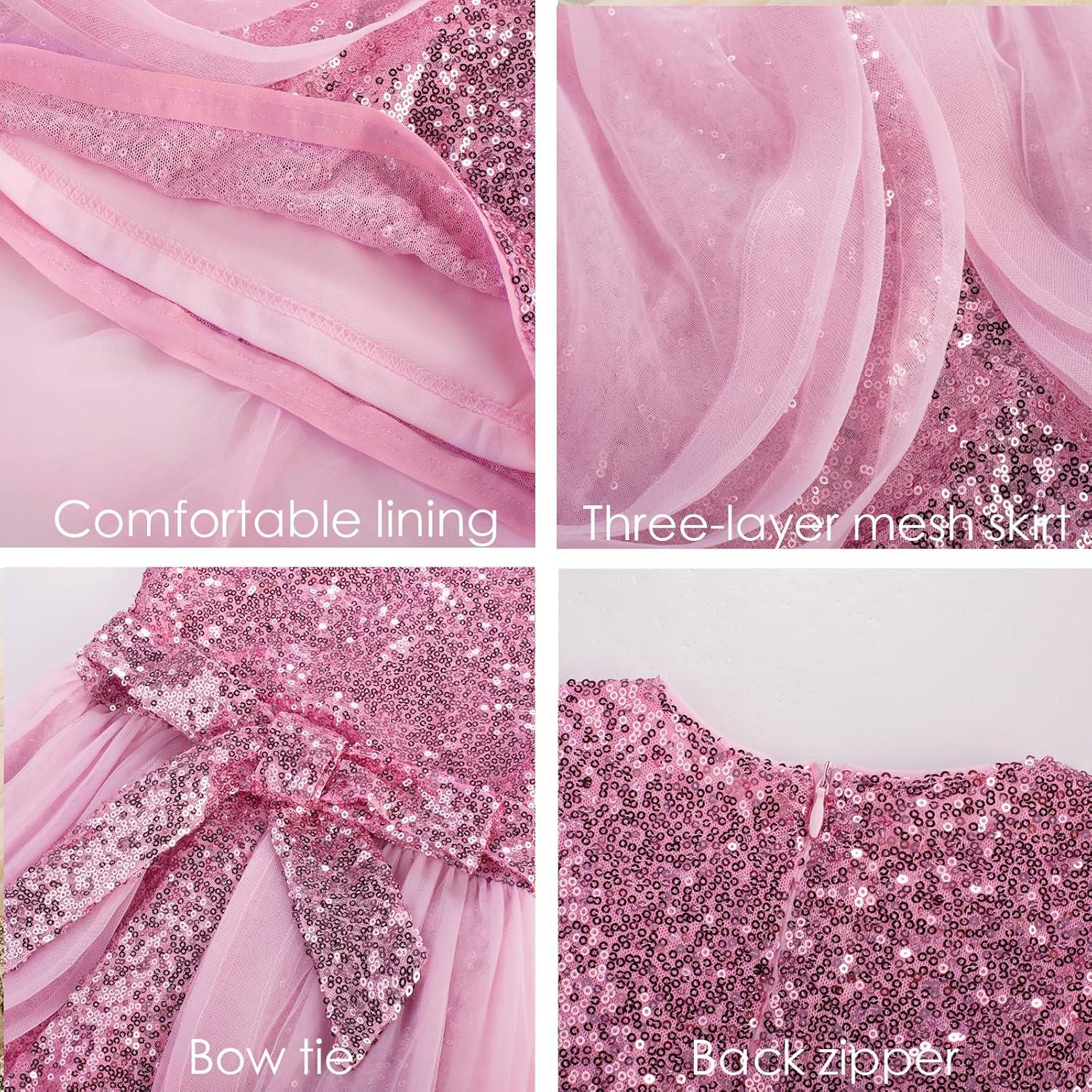 GRACE KARIN Girls Sequin Party Dress Sparkle Formal Birthday Pageant Prom Three-Layer Tulle Midi Dress Size 5-12Y(Pink)