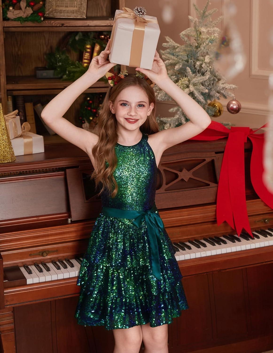 GRACE KARIN Girls Sequin Party Dress Sparkly Formal Birthday Special Occasion Kids Fancy Pageant Teen Dresses Size 6-14(Colorful Green)