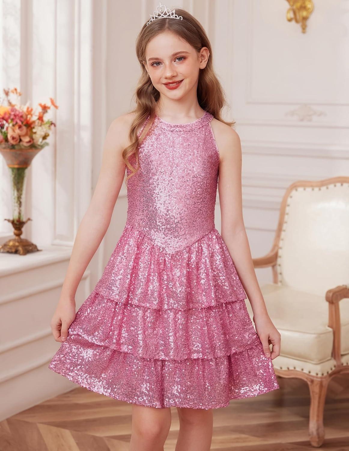 GRACE KARIN Girls Sequin Party Dress Sparkly Formal Birthday Special Occasion Kids Fancy Pageant Teen Dresses Size 6-14(Pink)