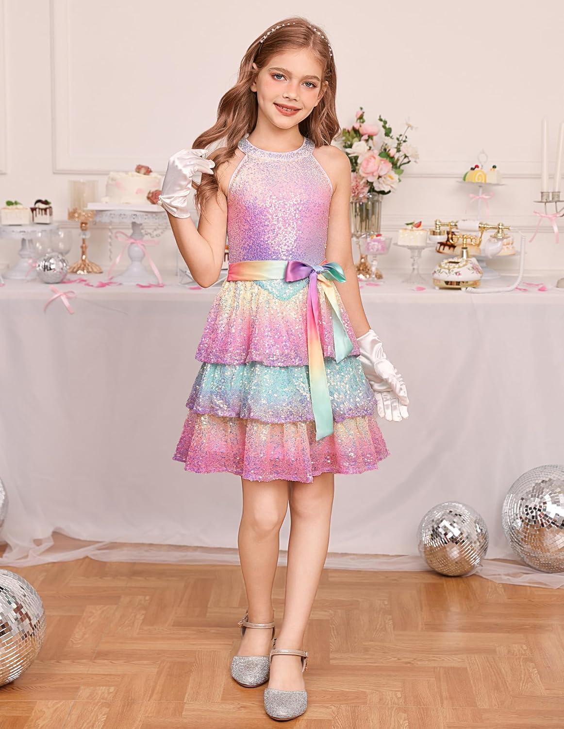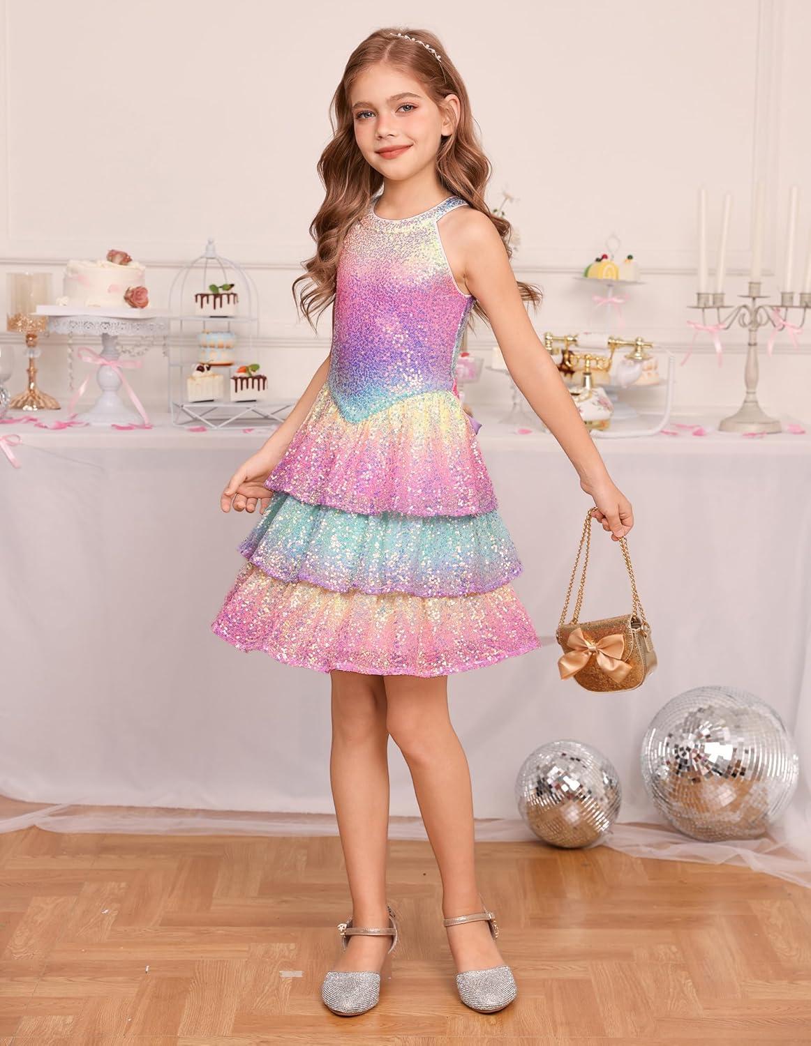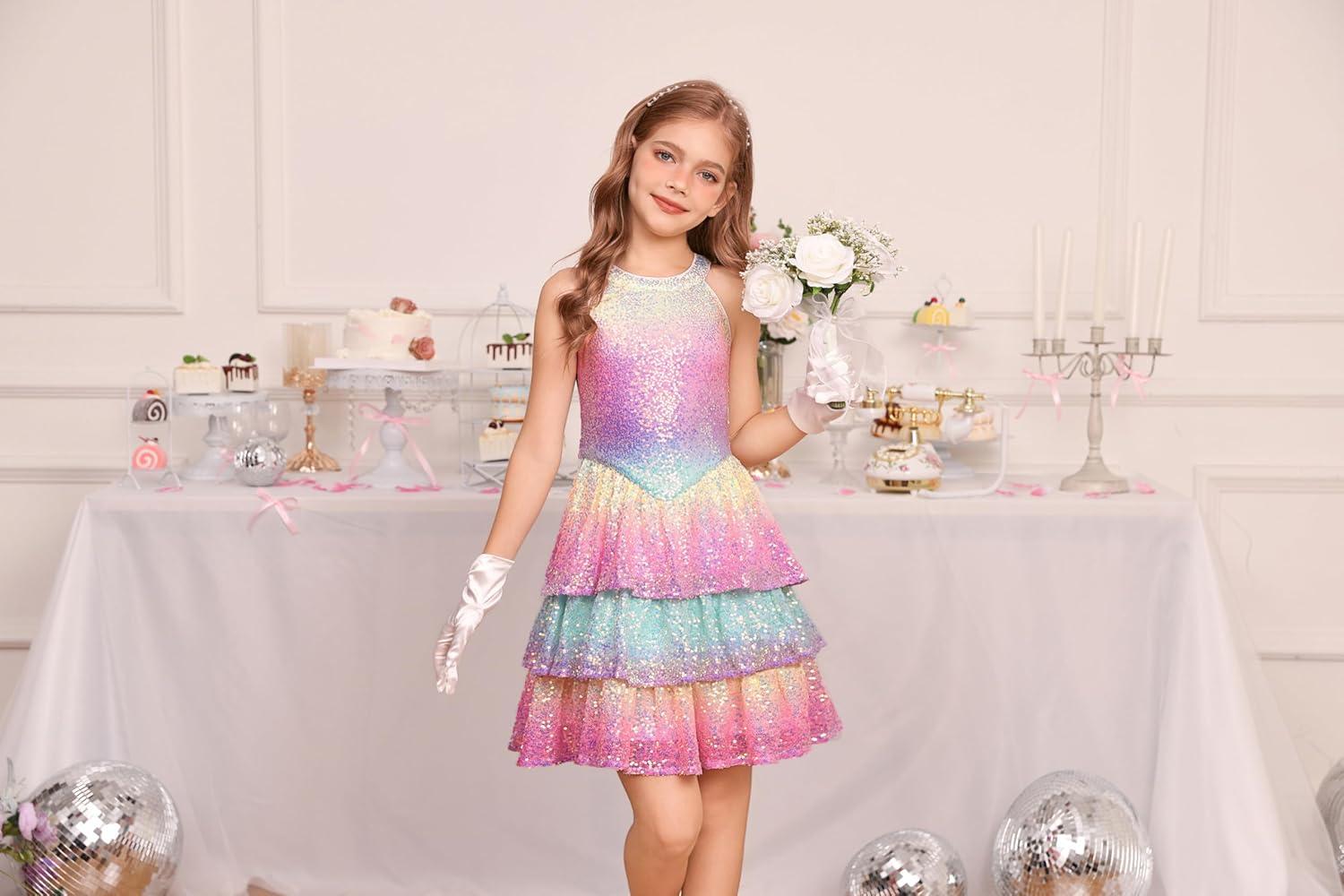 GRACE KARIN Girls Sequin Party Dress Sparkly Formal Birthday Special Occasion Kids Fancy Pageant Teen Dresses Size 6-14(Rainbow)