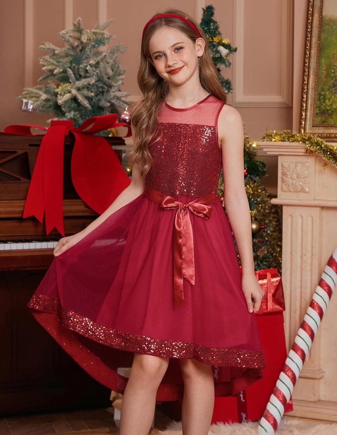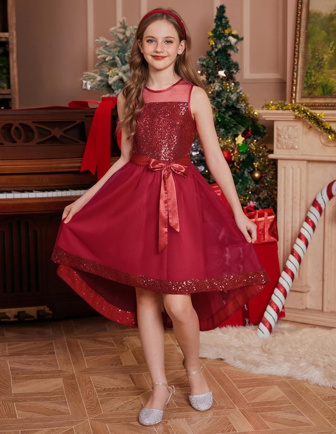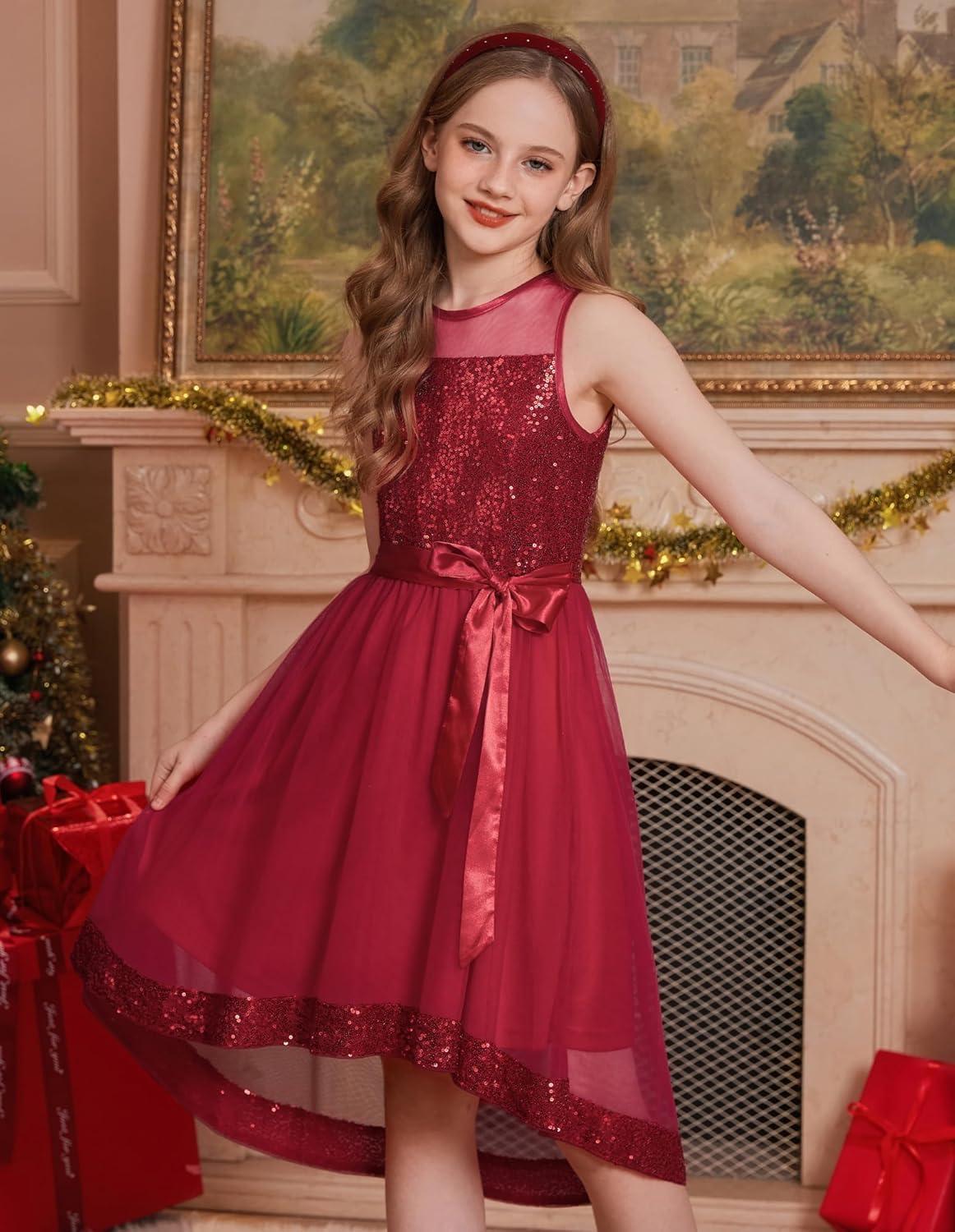 GRACE KARIN Girls Sequin Party Formal Dress Wedding Guest Sparkle Fancy Birthday Tulle High Low Prom Dresses 6-14 Years(Red)