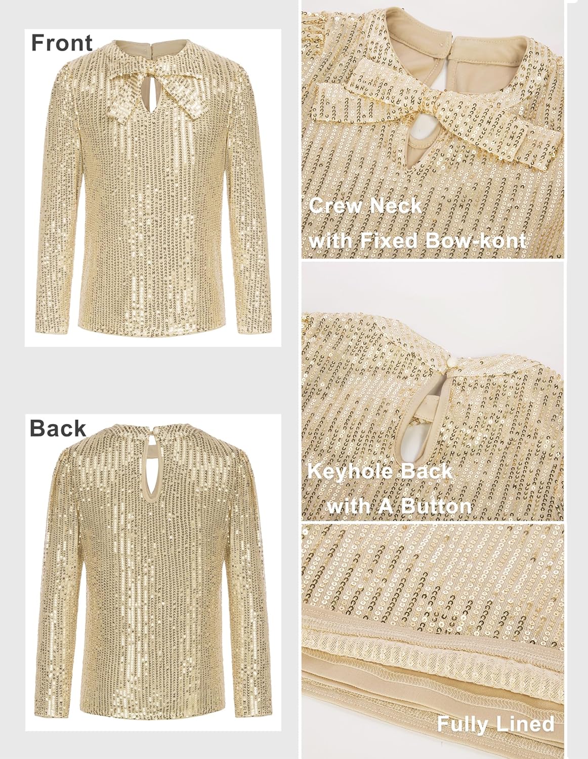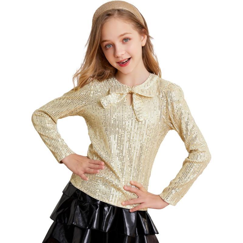 GRACE KARIN Girls Sparkly Sequin Tops Long Sleeve Crew Neck Glitter Blouse Shirt with Fixed Bowknot for PartyGold