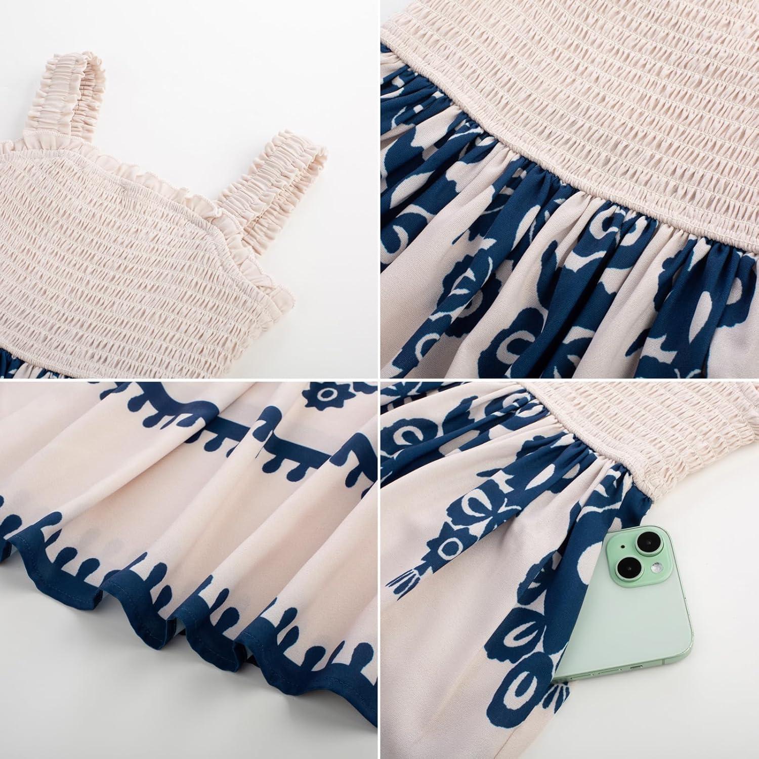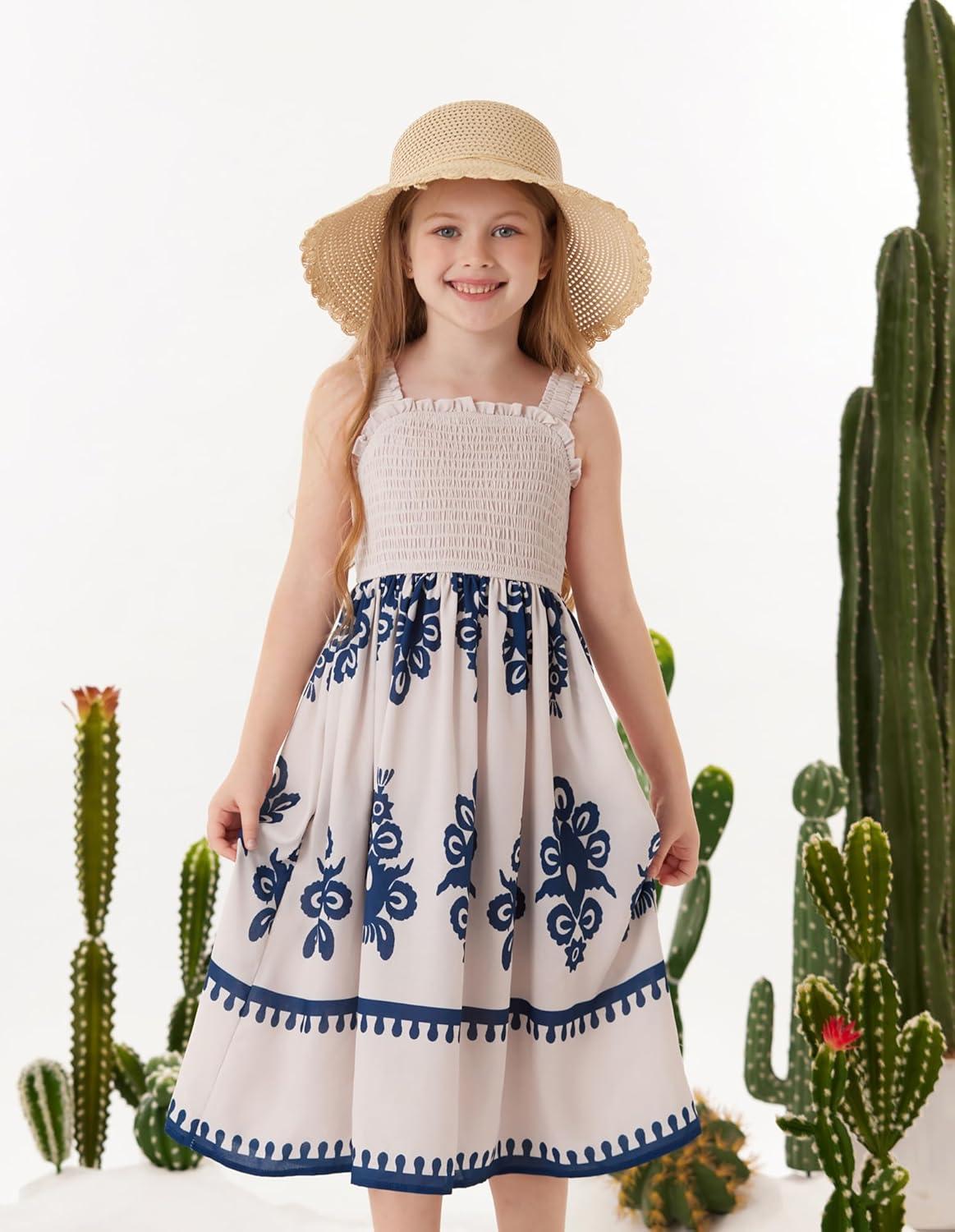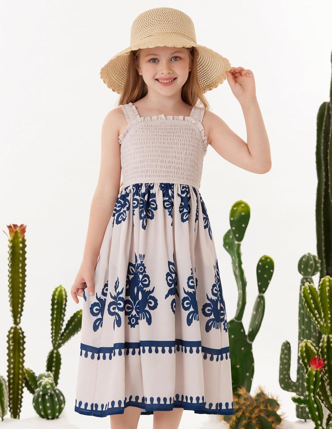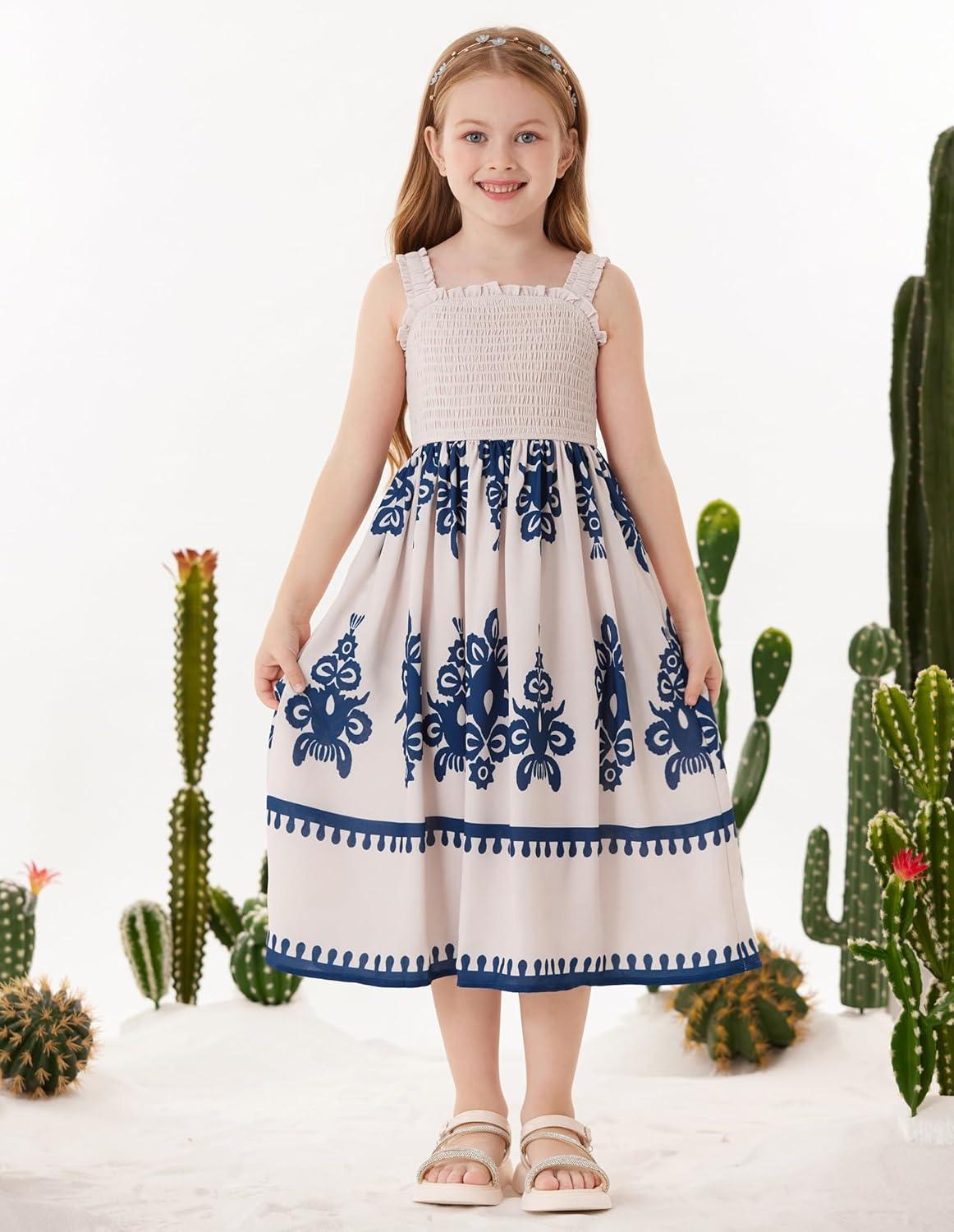 GRACE KARIN Girls Summer Boho Dresses Square Neck Smocked Sundresses Casual Sleeveless Maxi Dress for Girls 5-12Y(Beige)