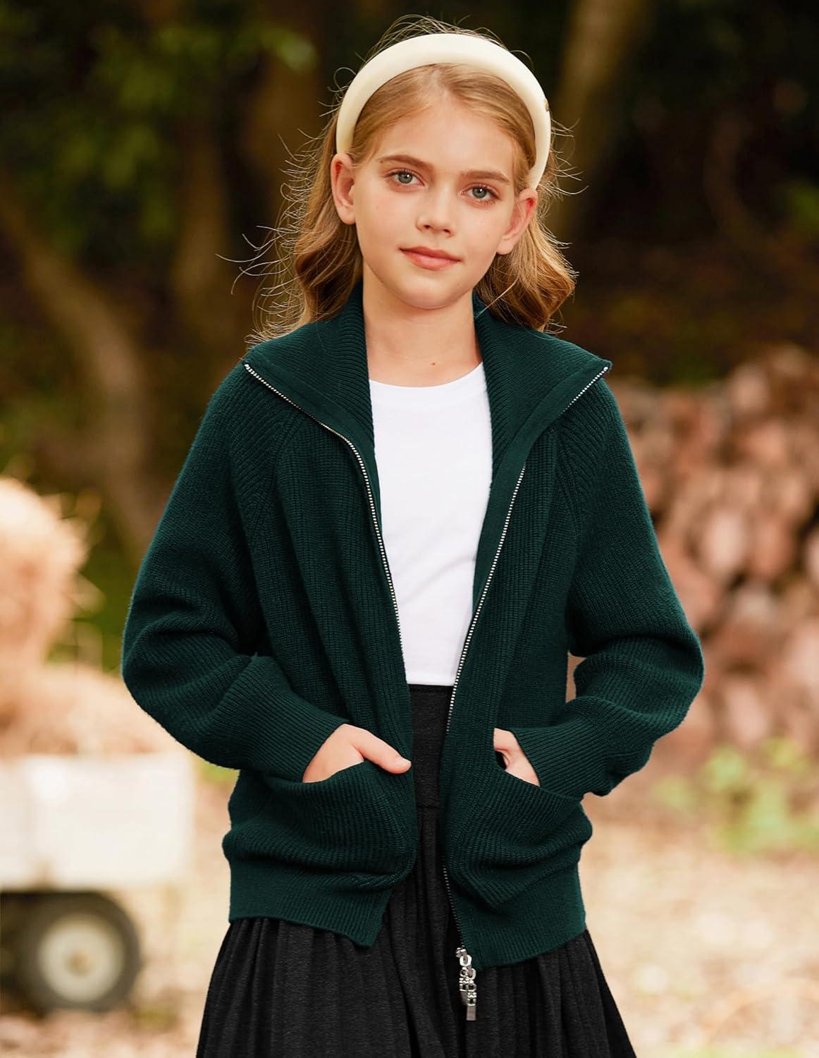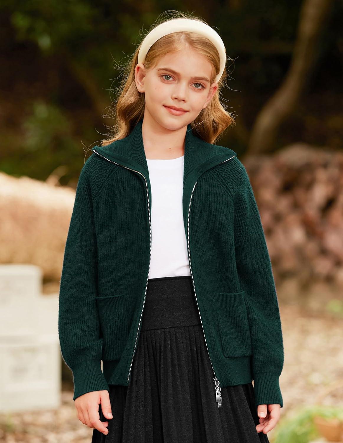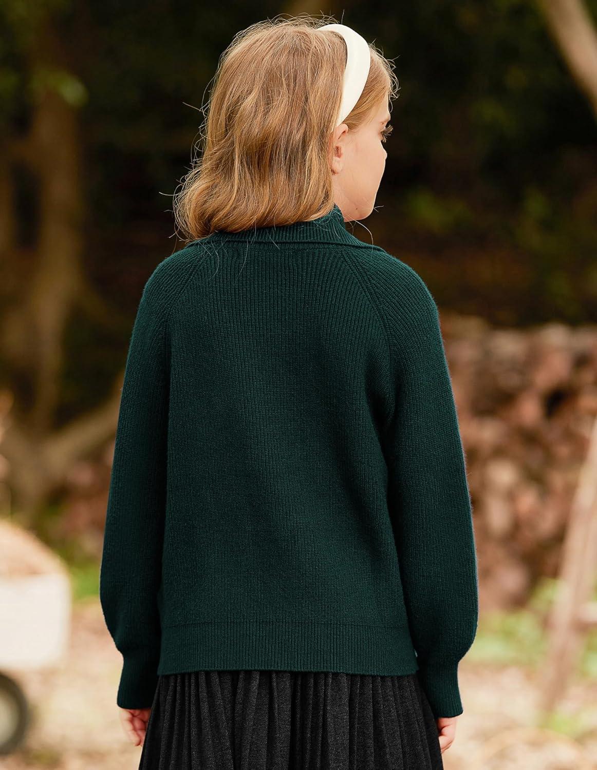 GRACE KARIN Girls Sweater Cardigan Uniform Zip Up Knit Fall Kid Jacket Size 6-14(Dark Green)