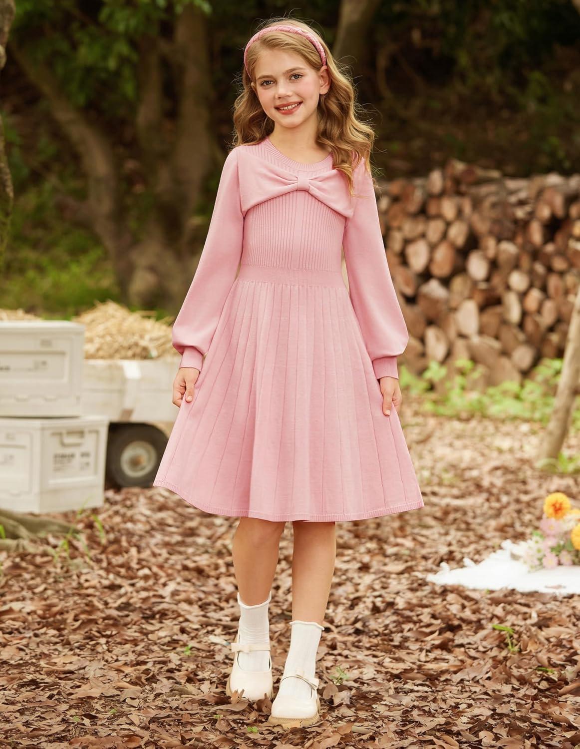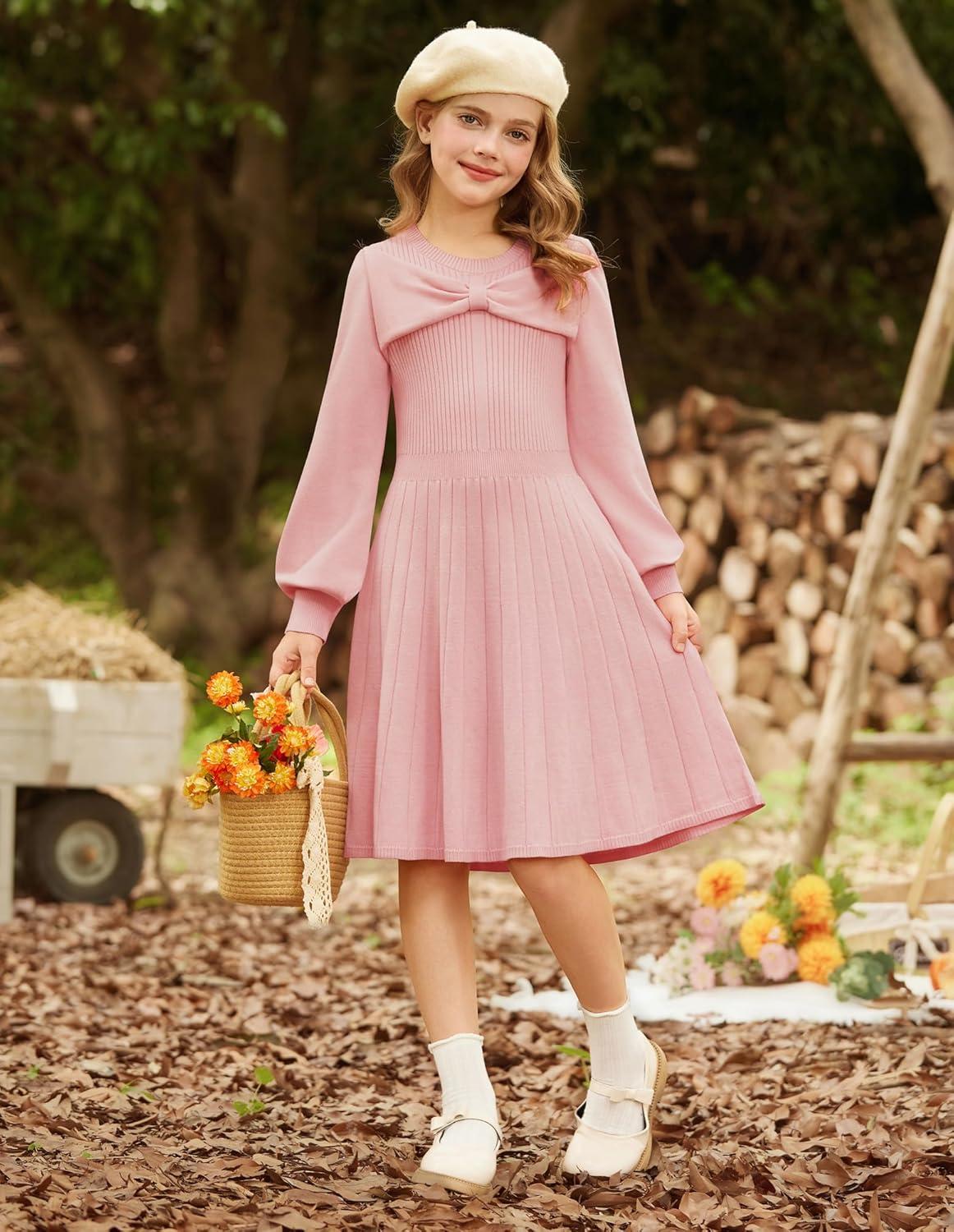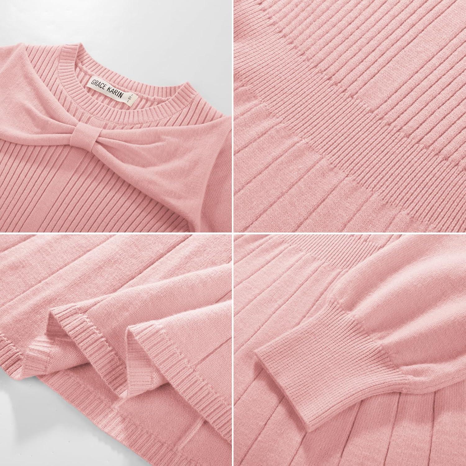 GRACE KARIN Girls Sweater Dress Bow Collar Pleated Skirt 6-14Y Back to School Outfit Knit Fall Winter Dress(Light Pink)