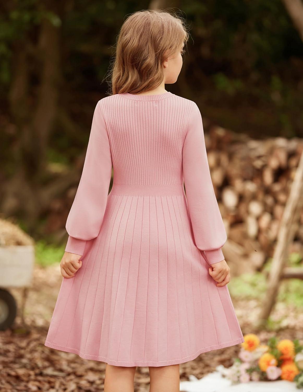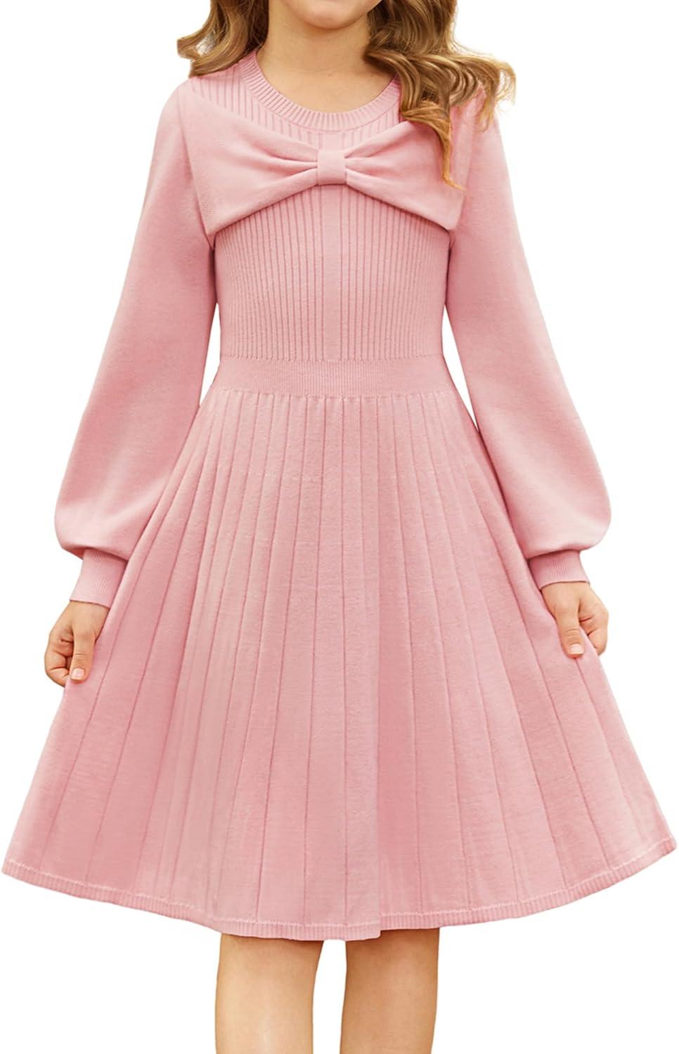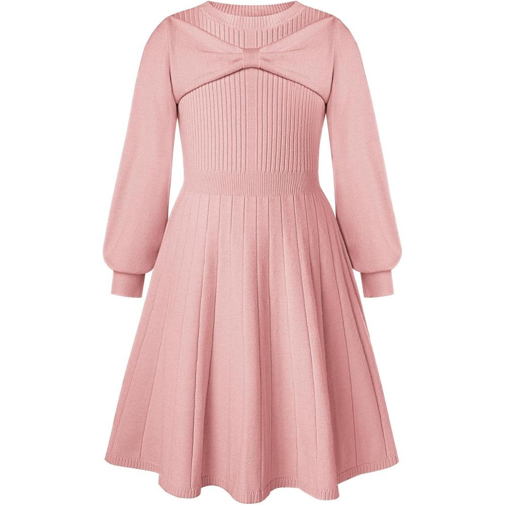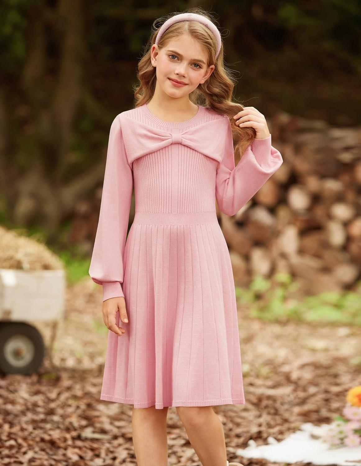 GRACE KARIN Girls Sweater Dress Bow Collar Pleated Skirt 6-14Y Back to School Outfit Knit Fall Winter Dress(Light Pink)