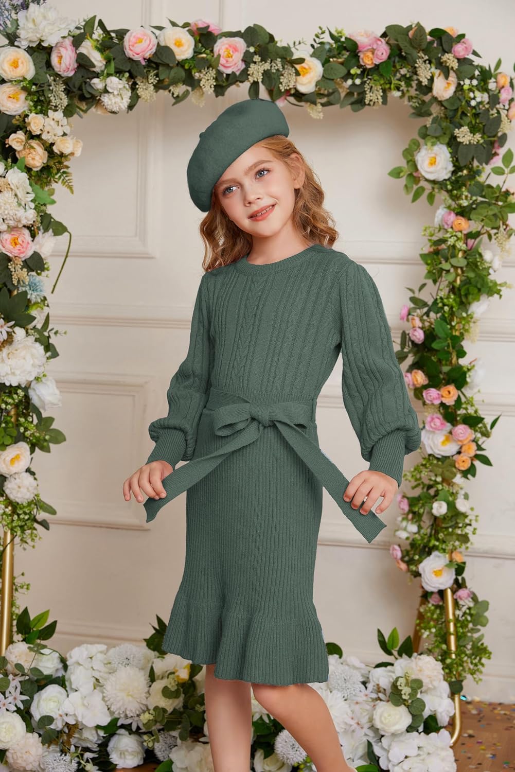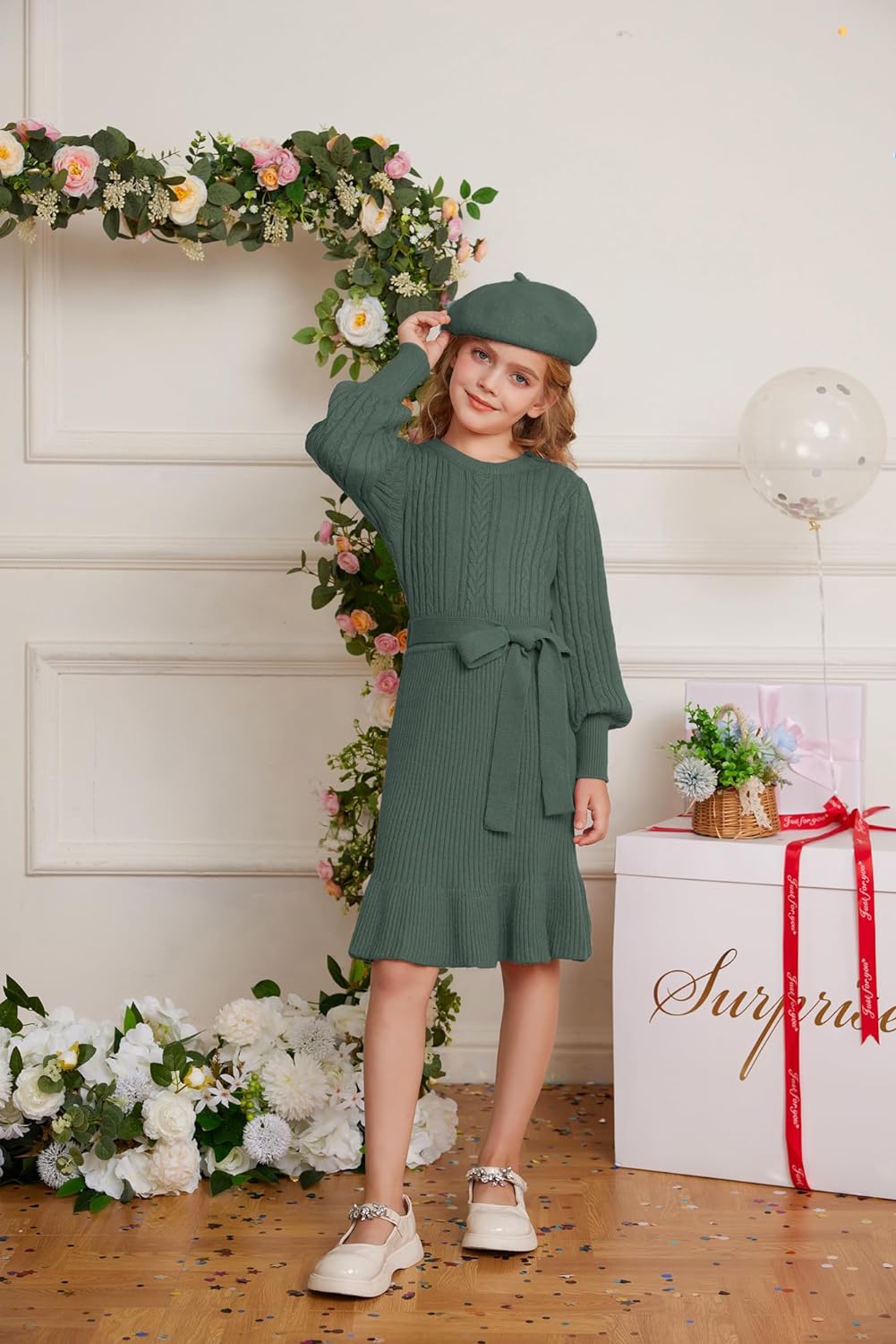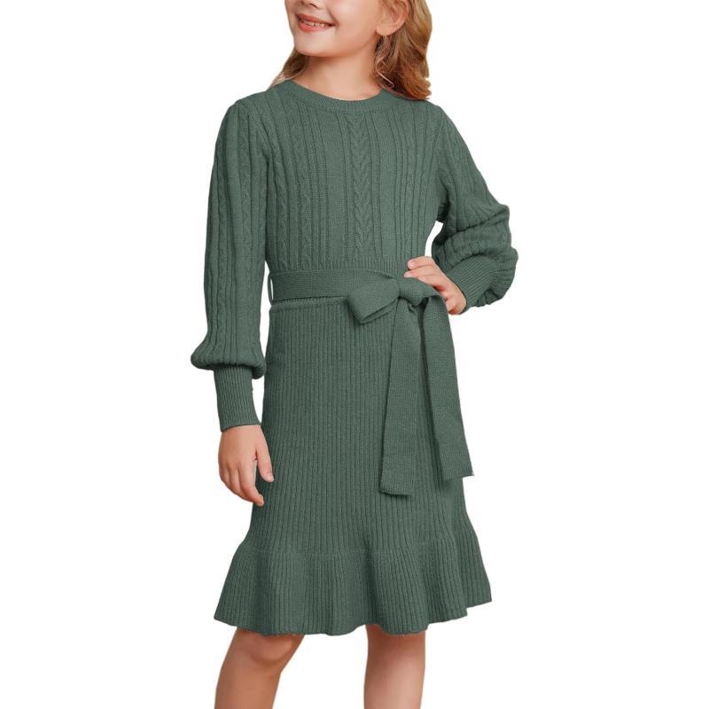 GRACE KARIN Girls Sweater Dress Cable Knit Long Sleeve Fall Winter Dress for Girl with Belt Sizes 614Tea Green