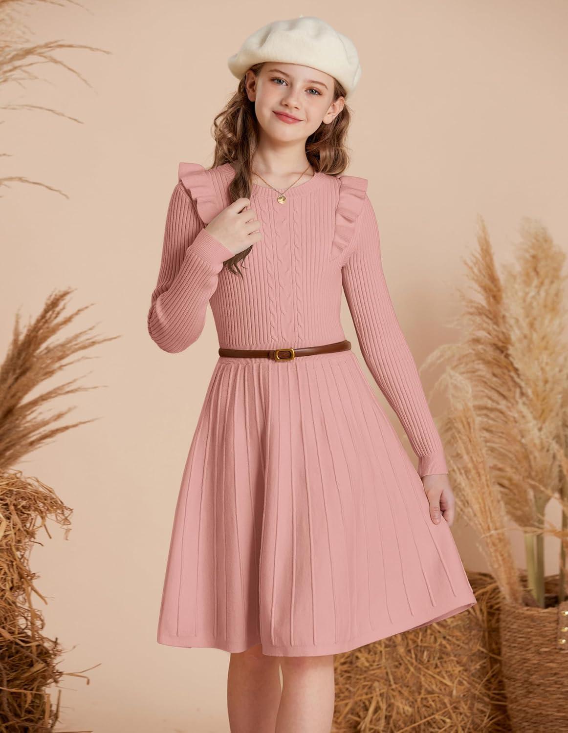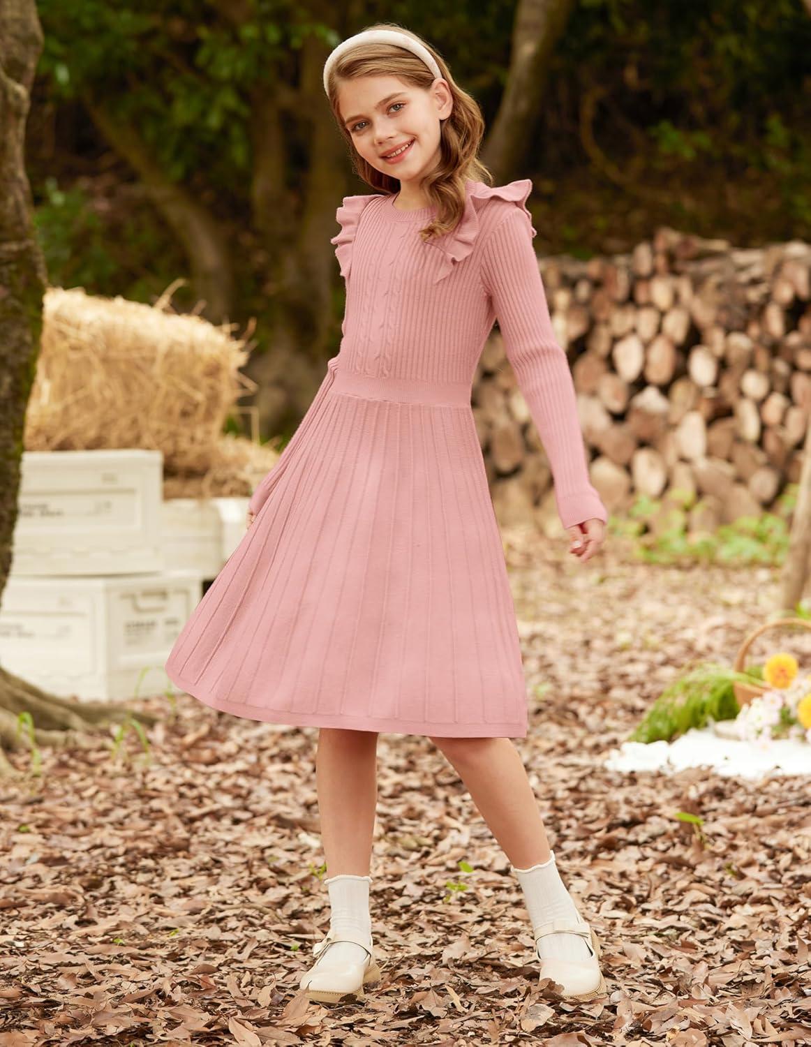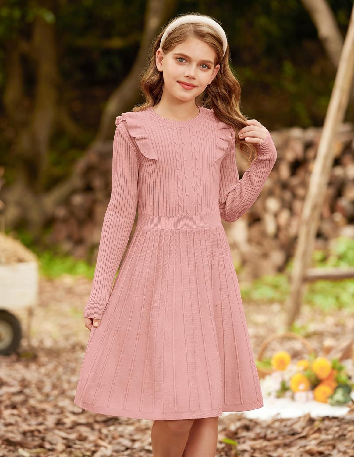 GRACE KARIN Girls Sweater Dress Fall Winter Long Sleeve Cable Knit Pullover Dresses for Girls 5-12Y(Pink)