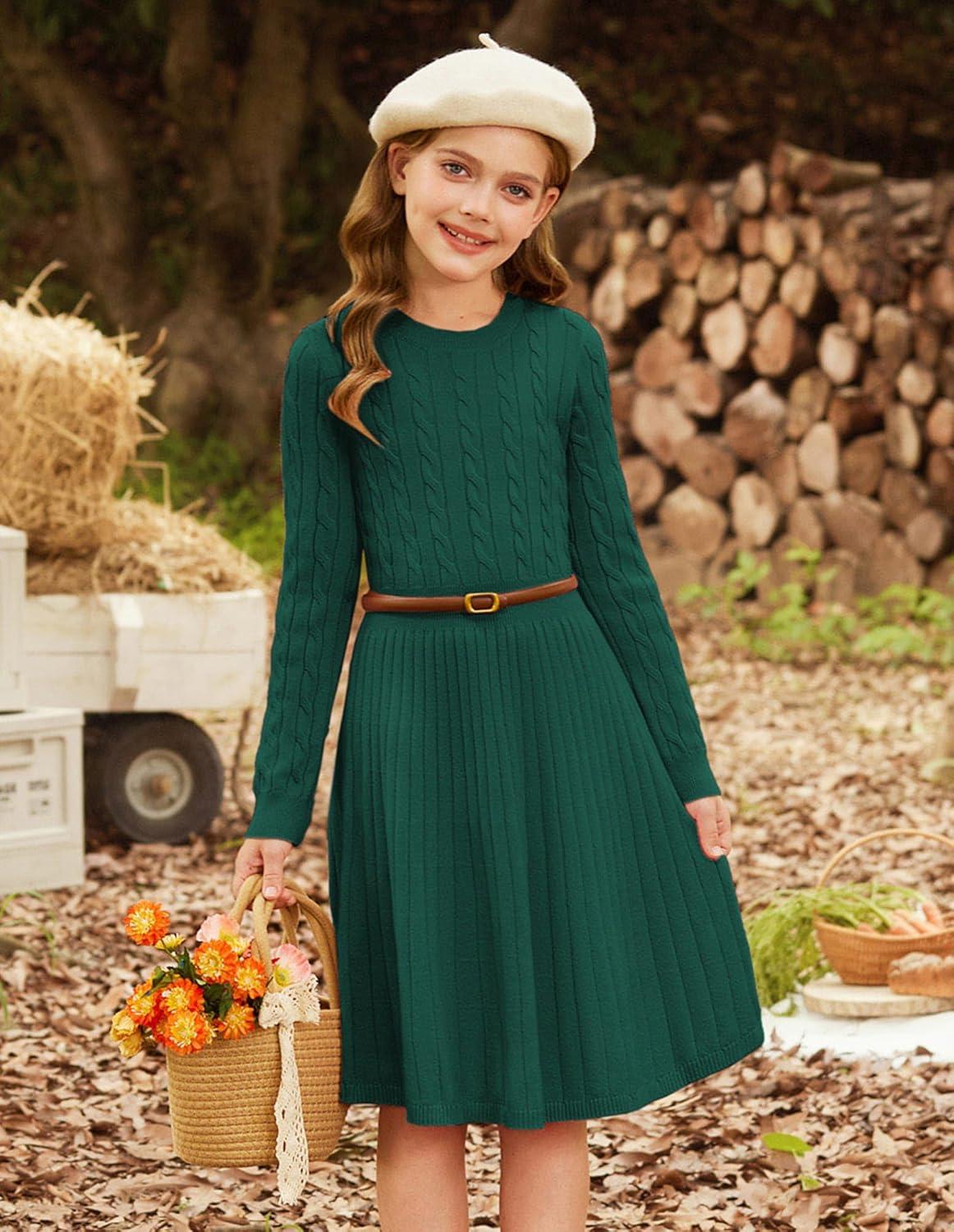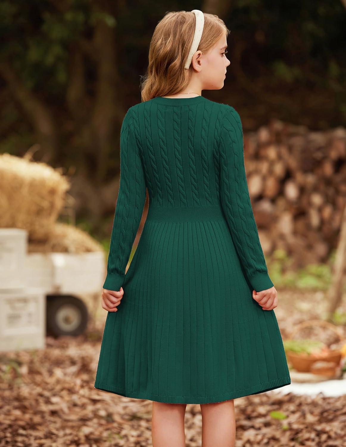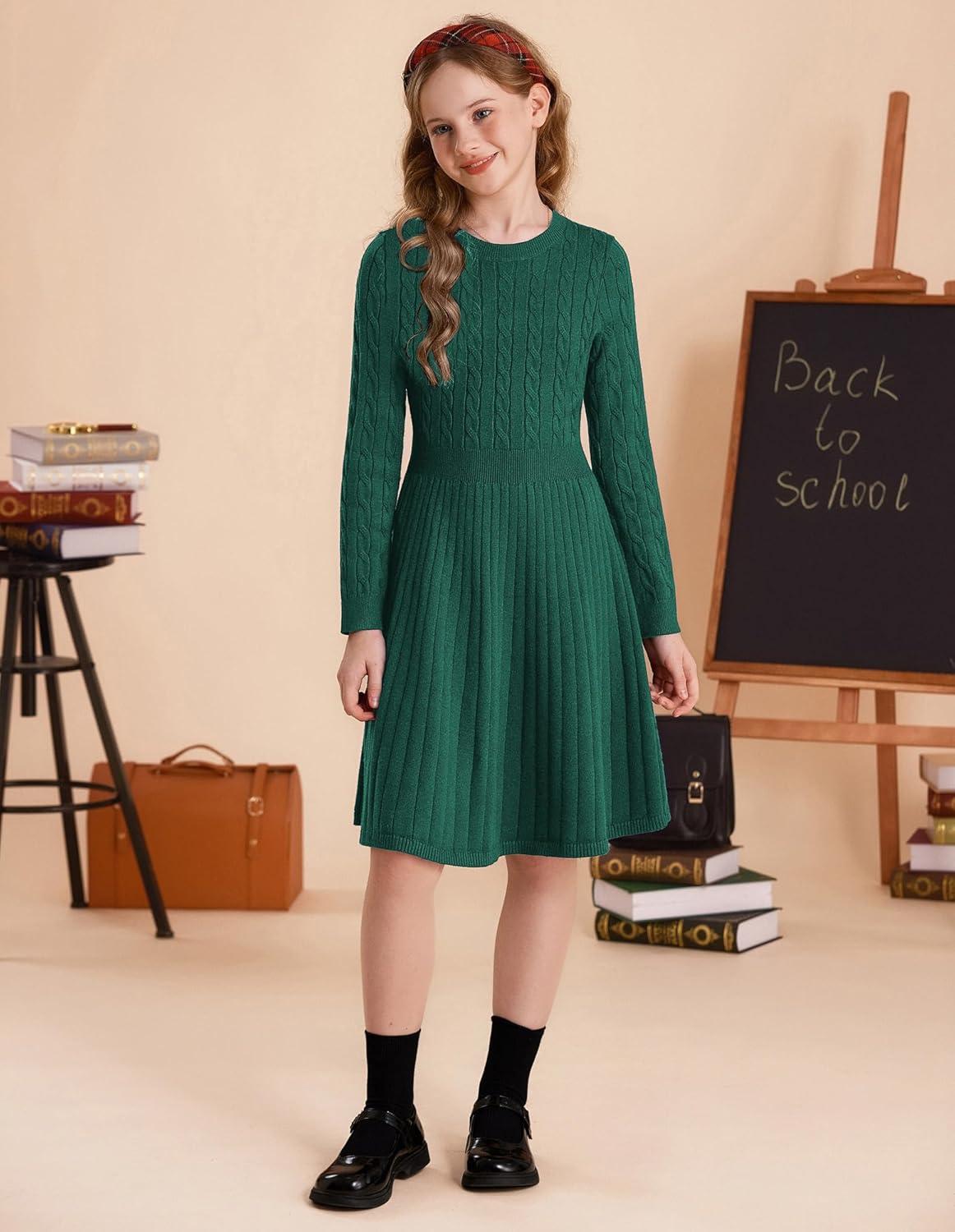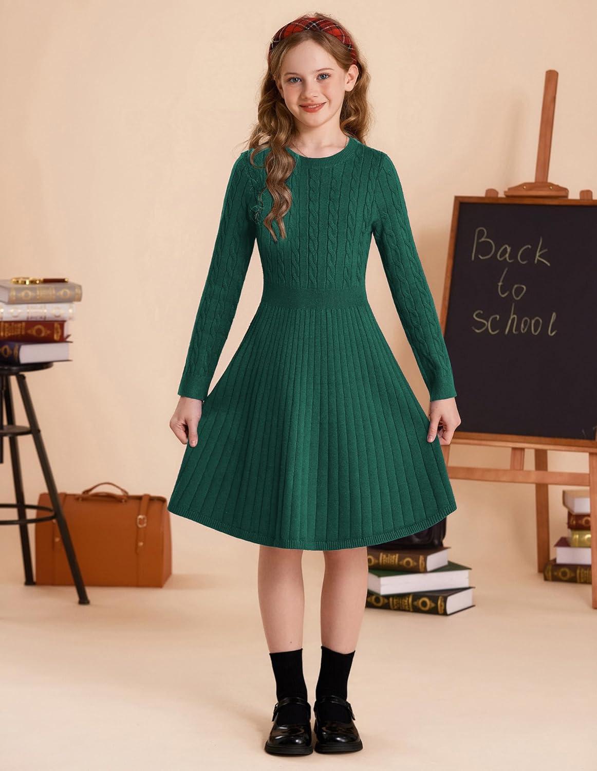 GRACE KARIN Girls Sweater Dress Long Sleeve Knit A Line Casual Midi Fall Winter Dresses 6-12 Years(Green)
