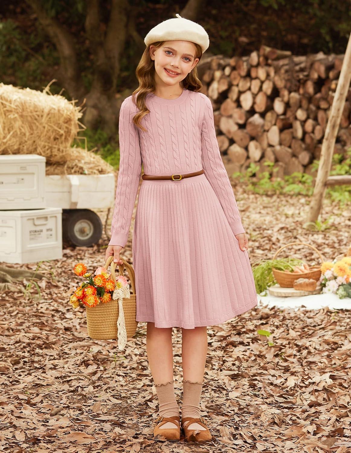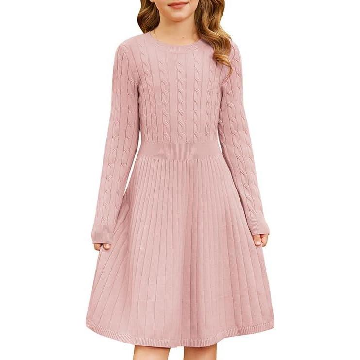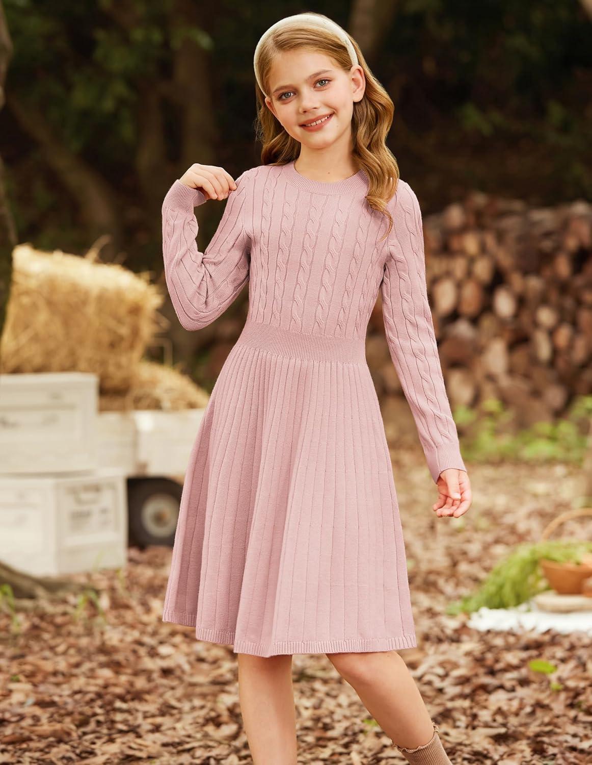GRACE KARIN Girls Sweater Dress Long Sleeve Knit A Line Casual Midi Fall Winter Dresses 6-12 Years(Pink)