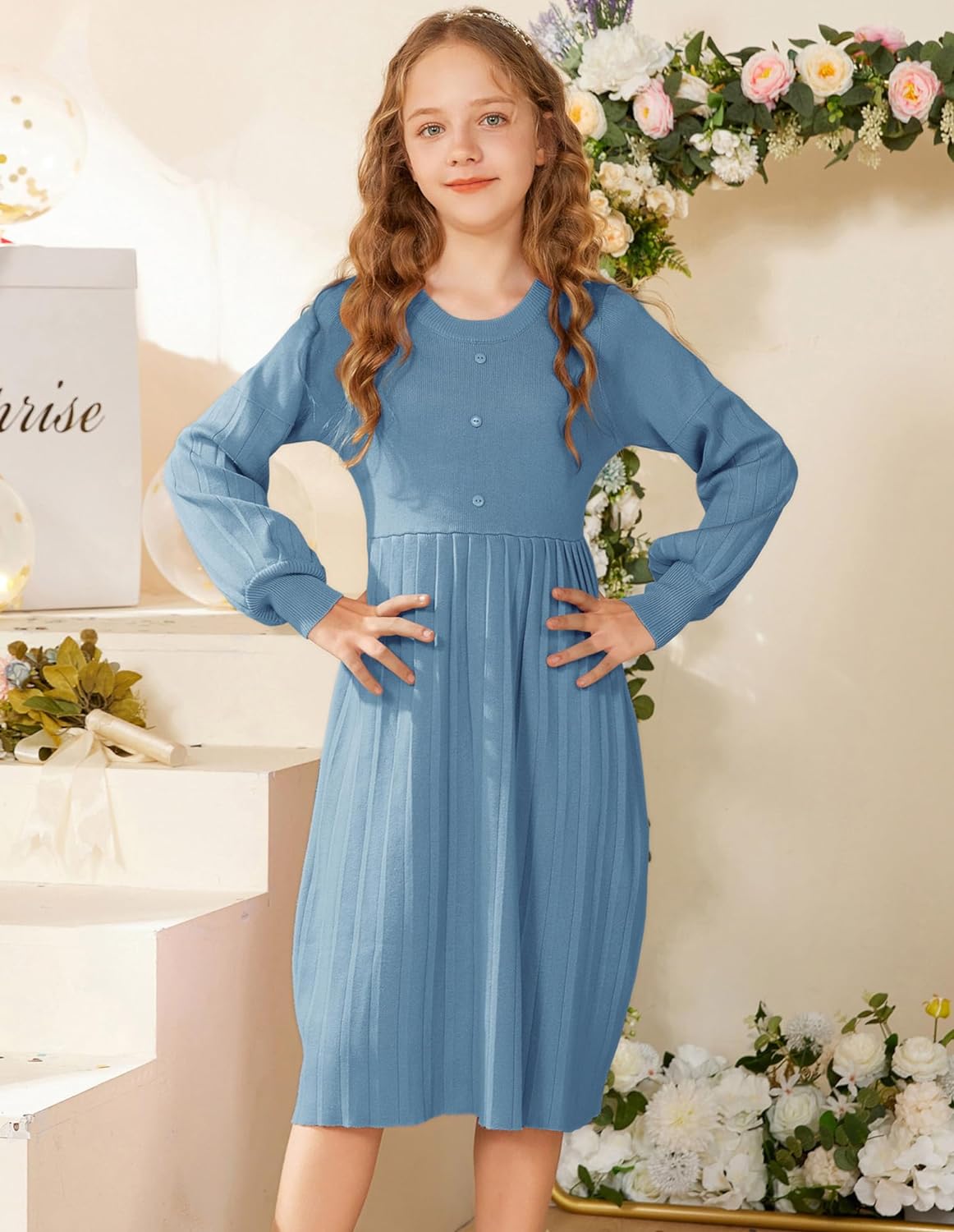 GRACE KARIN Girls Sweater Dress Long Sleeve Pleated ALine Fall Dress 512YDusty Blue