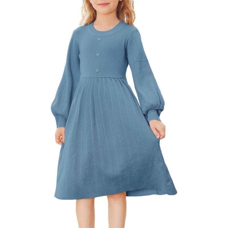 GRACE KARIN Girls Sweater Dress Long Sleeve Pleated A-Line Fall Dress 5-12Y(Dusty Blue)