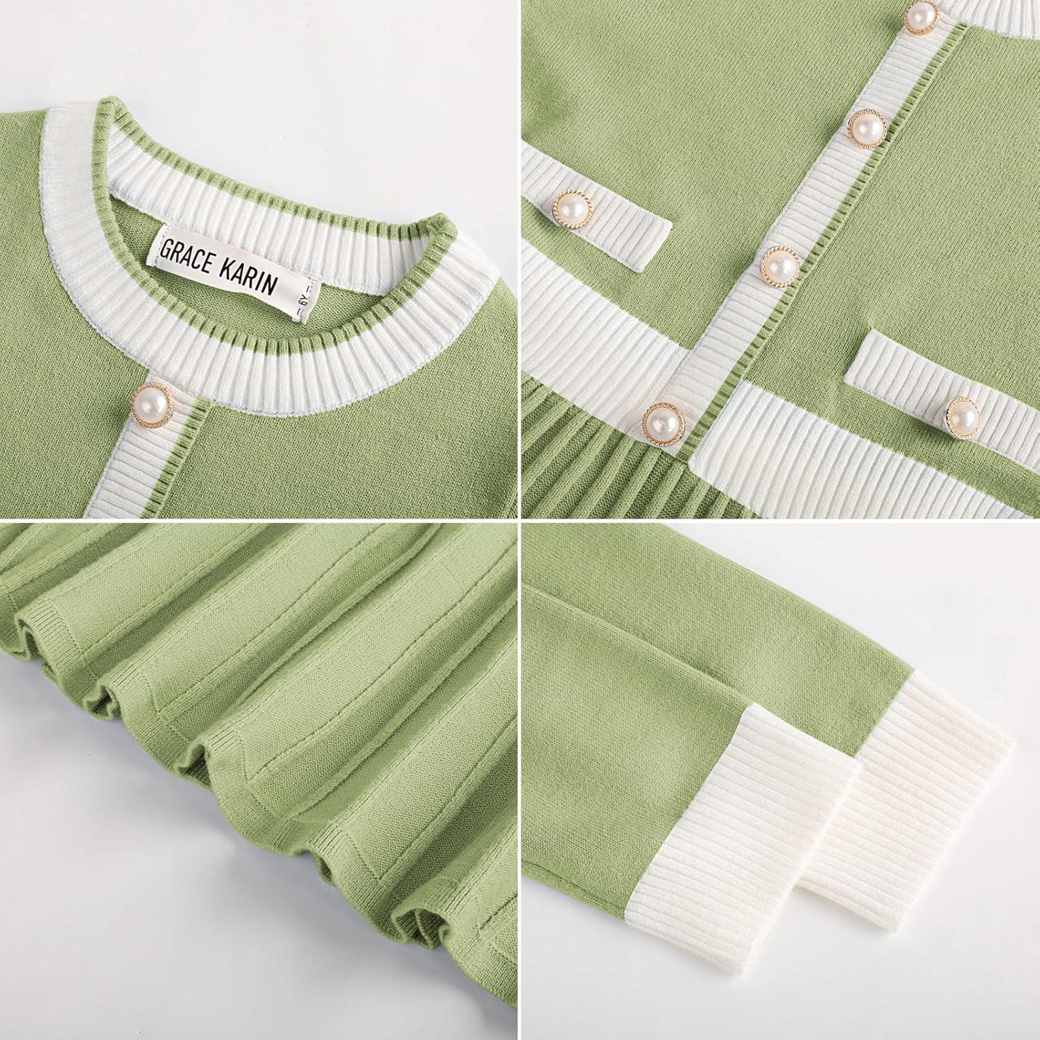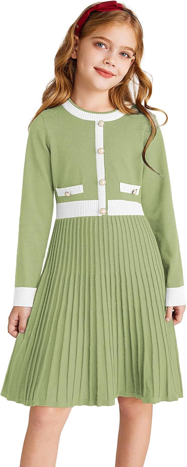GRACE KARIN Girls Sweater Fall Dress Long Sleeve Knit A Line Contrast Casual Winter Dresses 6-14Y(Light Green)