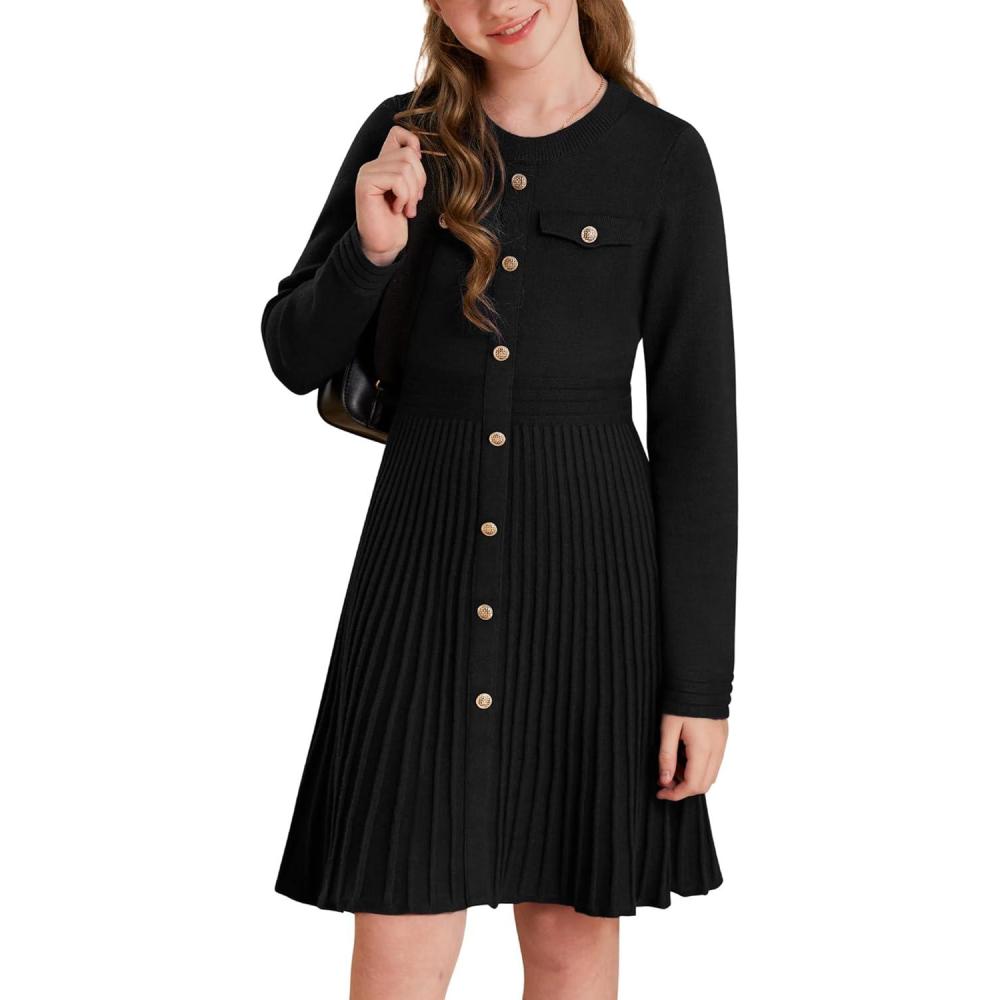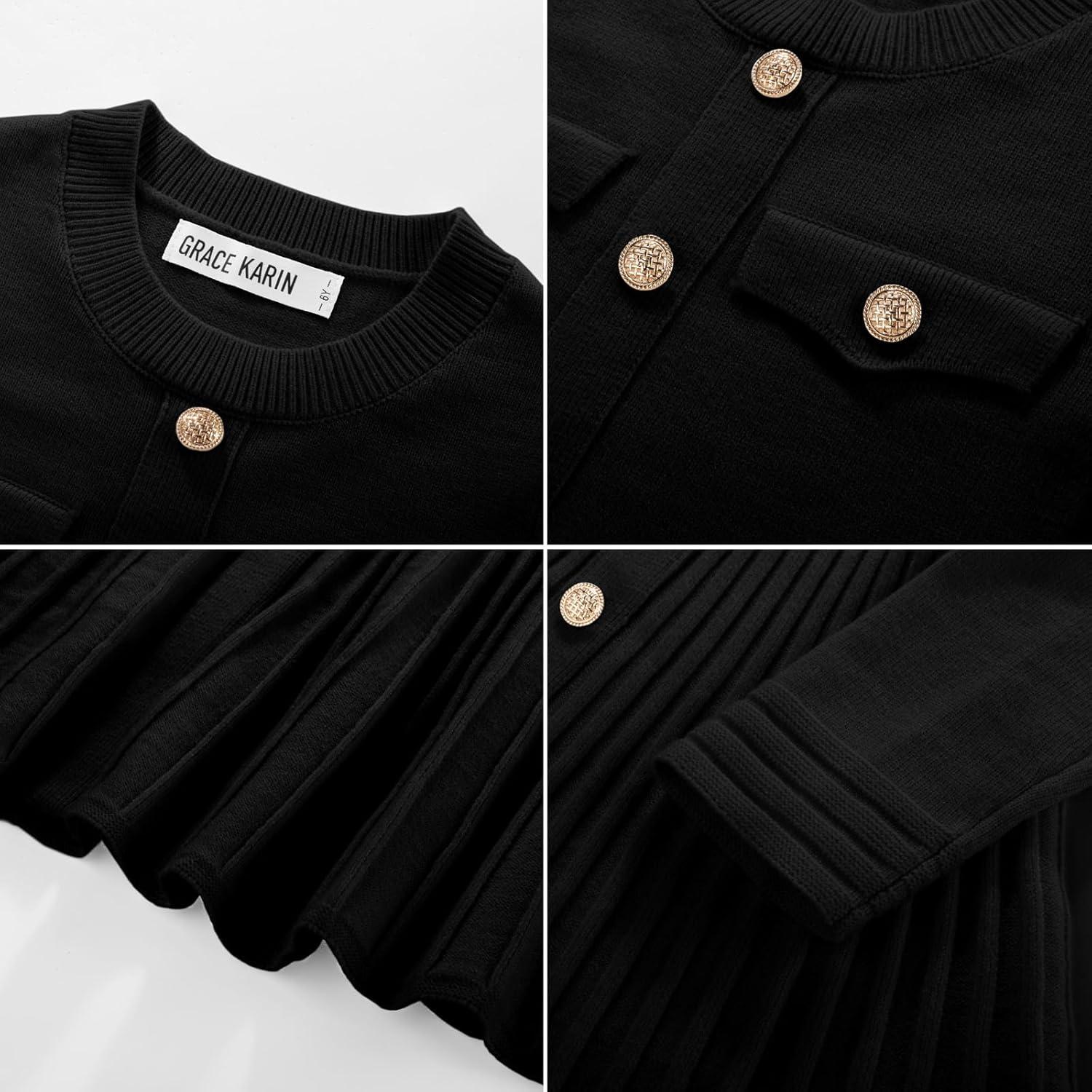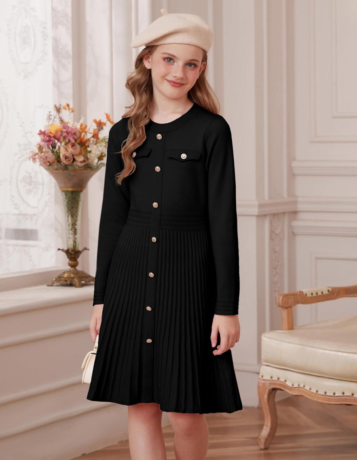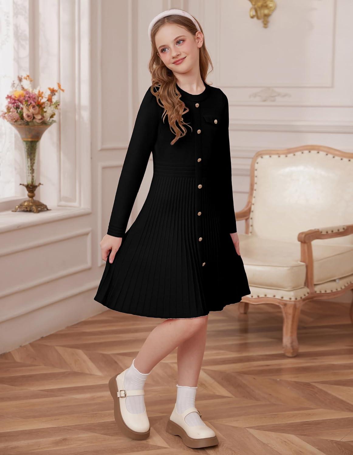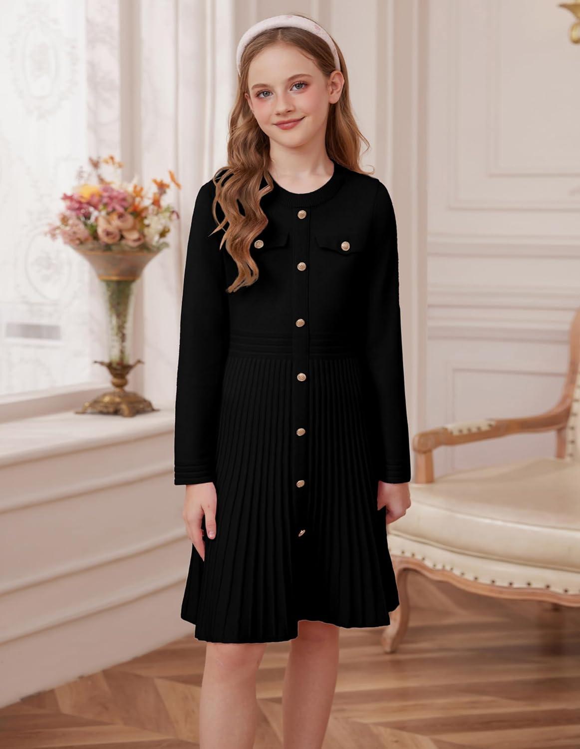 GRACE KARIN Girls Sweater Fall Dress Long Sleeve Knit Button Front Pleated A-Line Casual Winter Midi Dresses 5-14Y(Black)