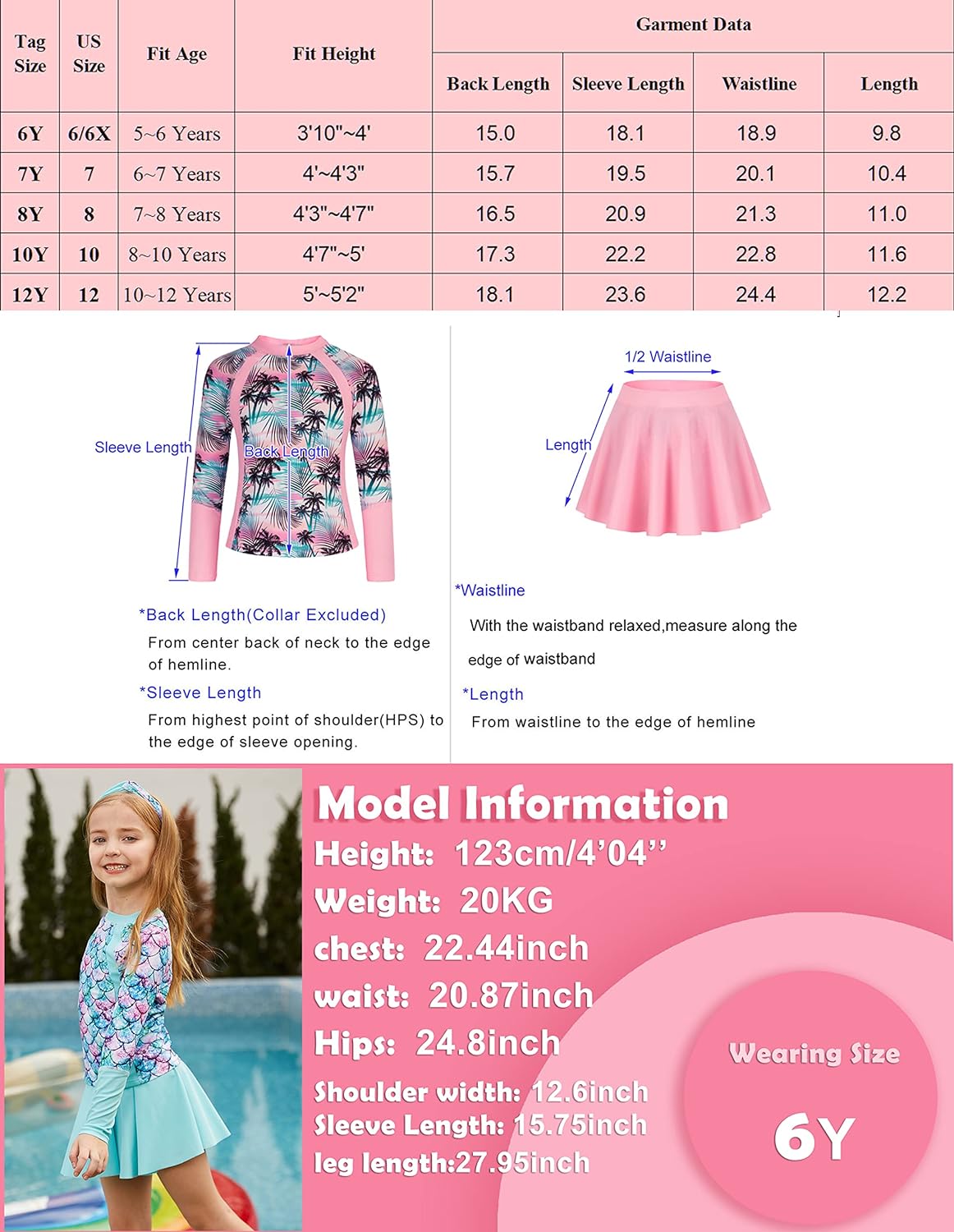 【Eye-Catching Design】Featuring cute and distinctive prints of coconut trees, mermaids, flowers, and leaves, our three-piece long sleeve kids swim suits for girls come with a flowy ruffle skirt that adds a touch of elegance to your child's beachwear.