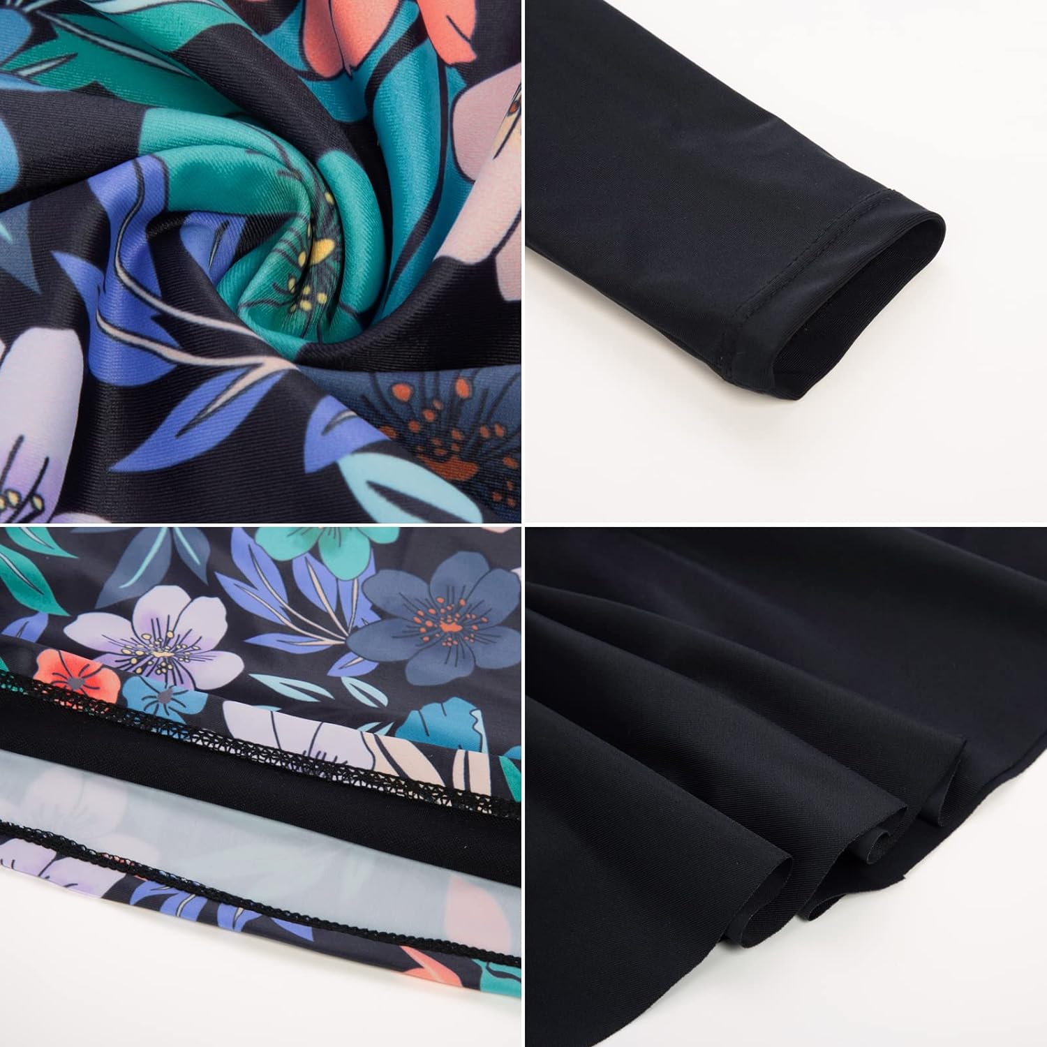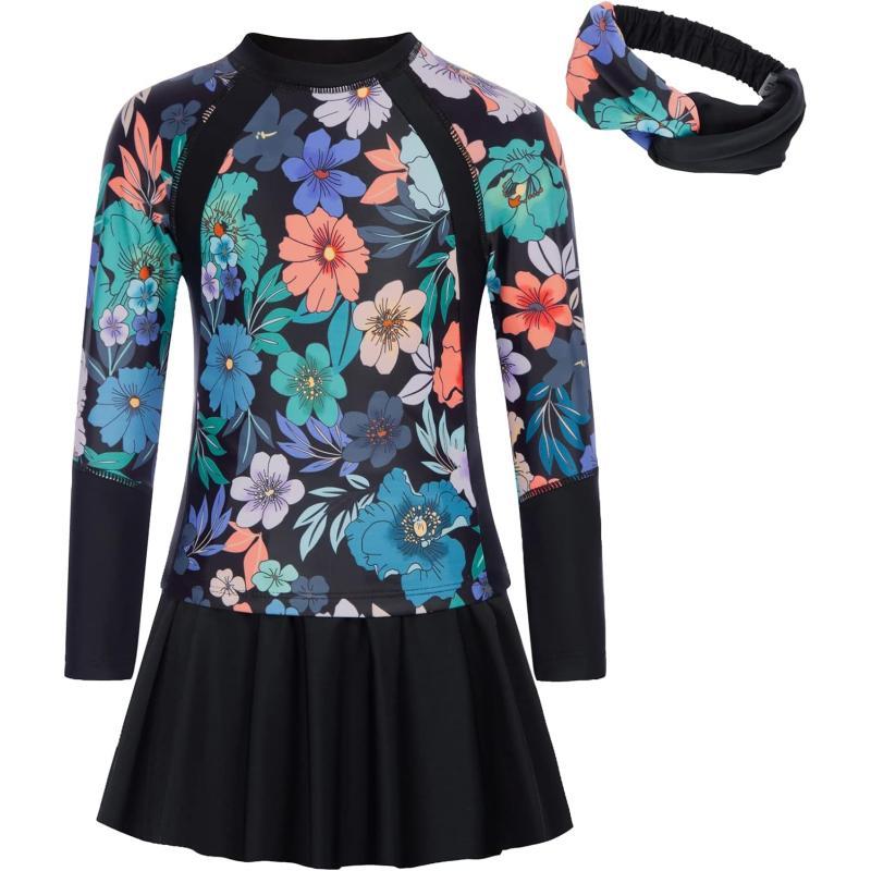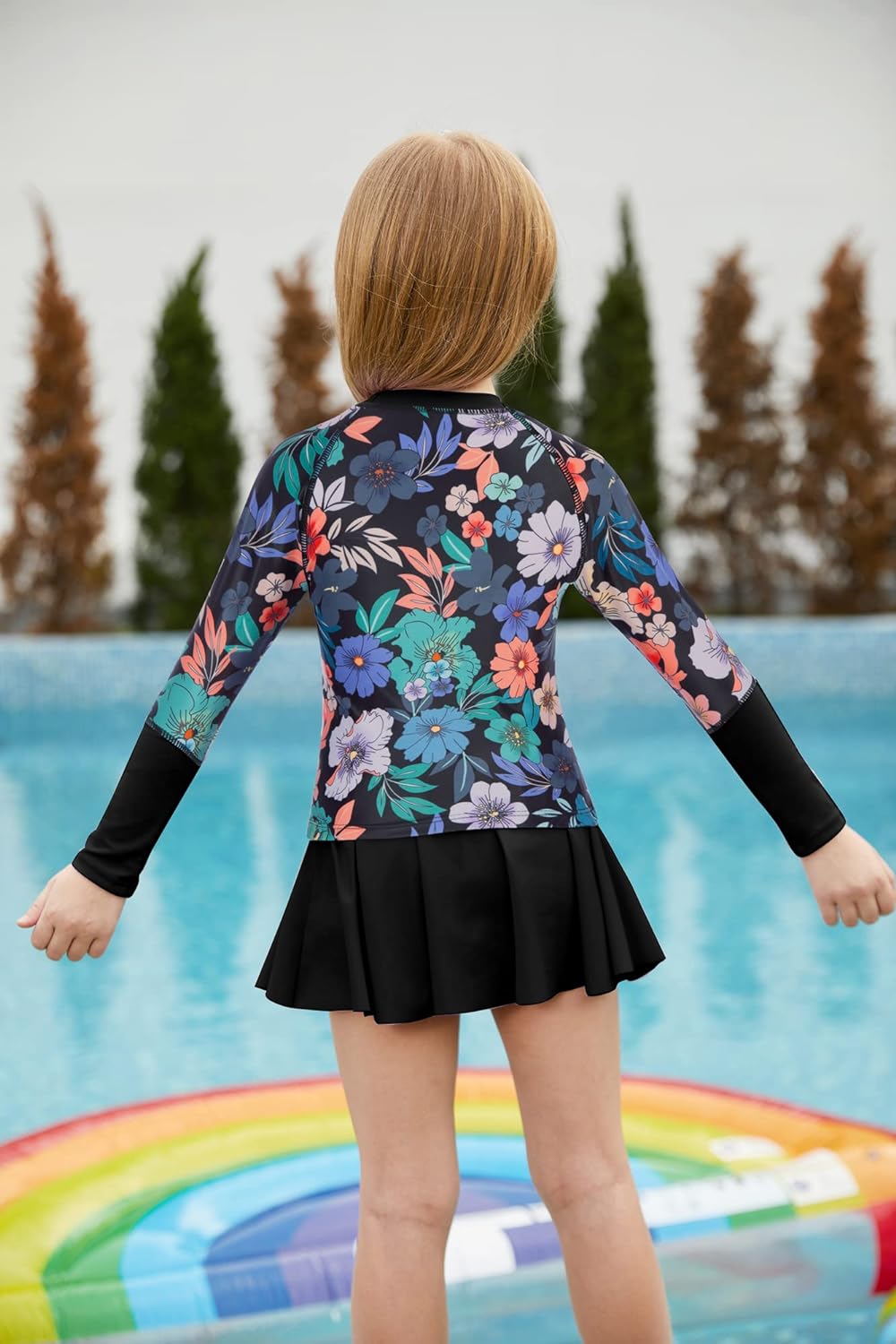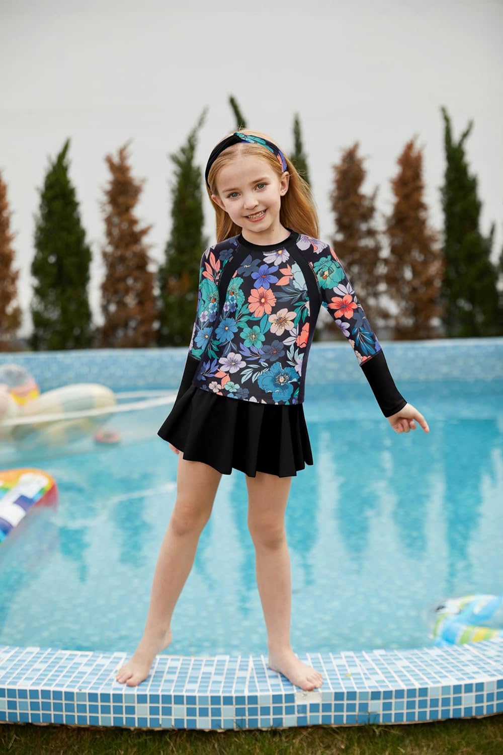 GRACE KARIN Girls Swimsuit Girls Long Sleeve Rash Guard 3-Pieces Bathing Suit 5-12Y(Black Floral)