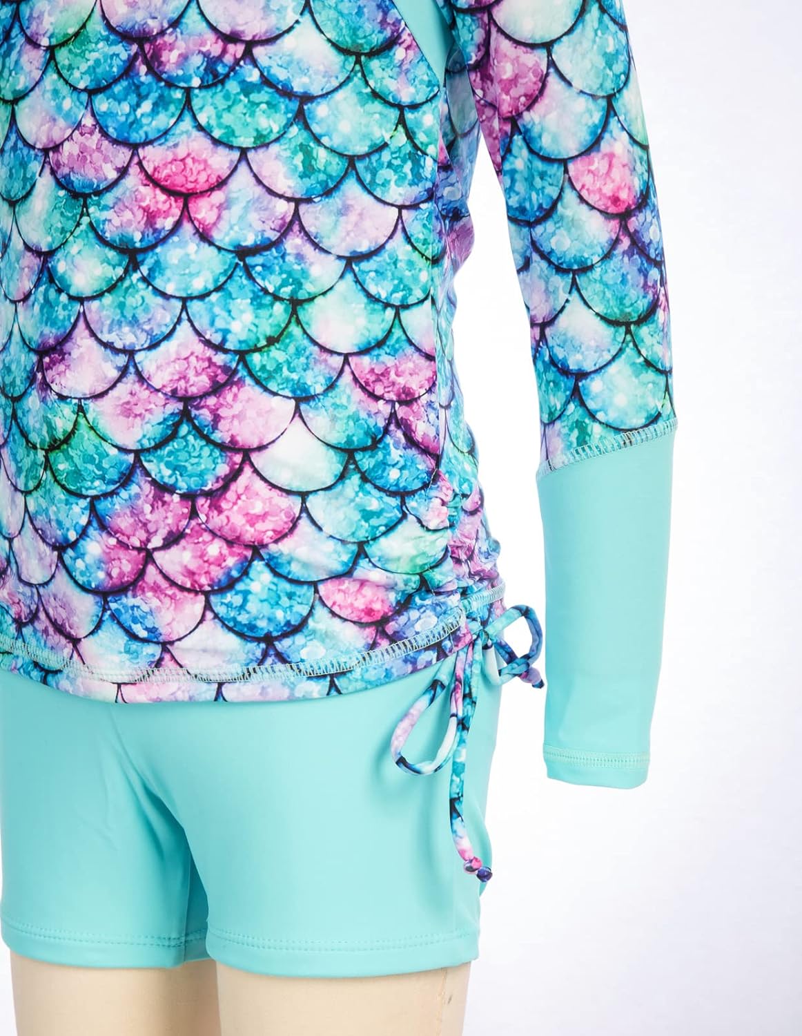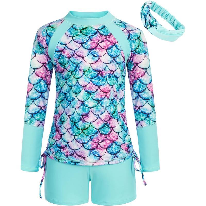 Design: Three piece girls swimsuit set, including long sleeve rash guard with adjustable drawstring, boyshorts and cute headband. 2Pcs provides more room for kids to grow, long sleeves and boyshorts offer great coverage, protect the skin from the sun and the damage it caused to the skin, and keep your girl from getting sunburned, high collar design for optimal sun protection.