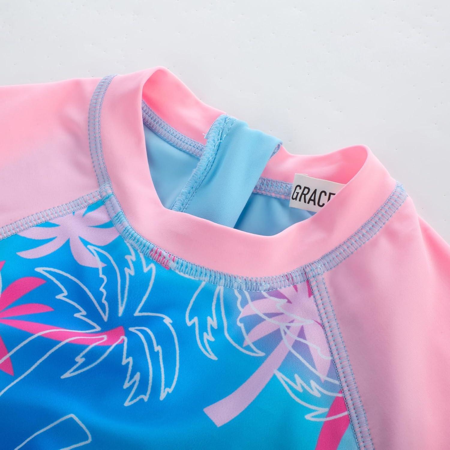 imageGRACE KARIN Girls Swimsuit Long Sleeve UV Protective Bathing Suit One Piece Swimwear for Kids 512 YearsPink and Blue Coconut Tree