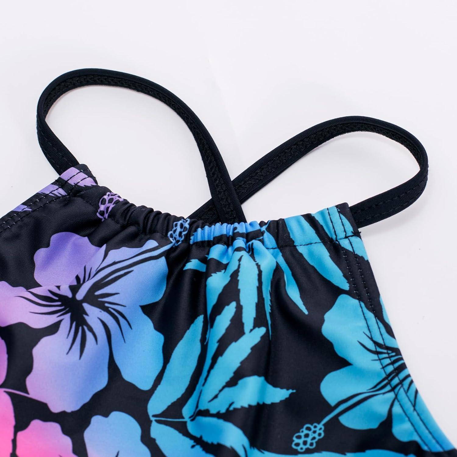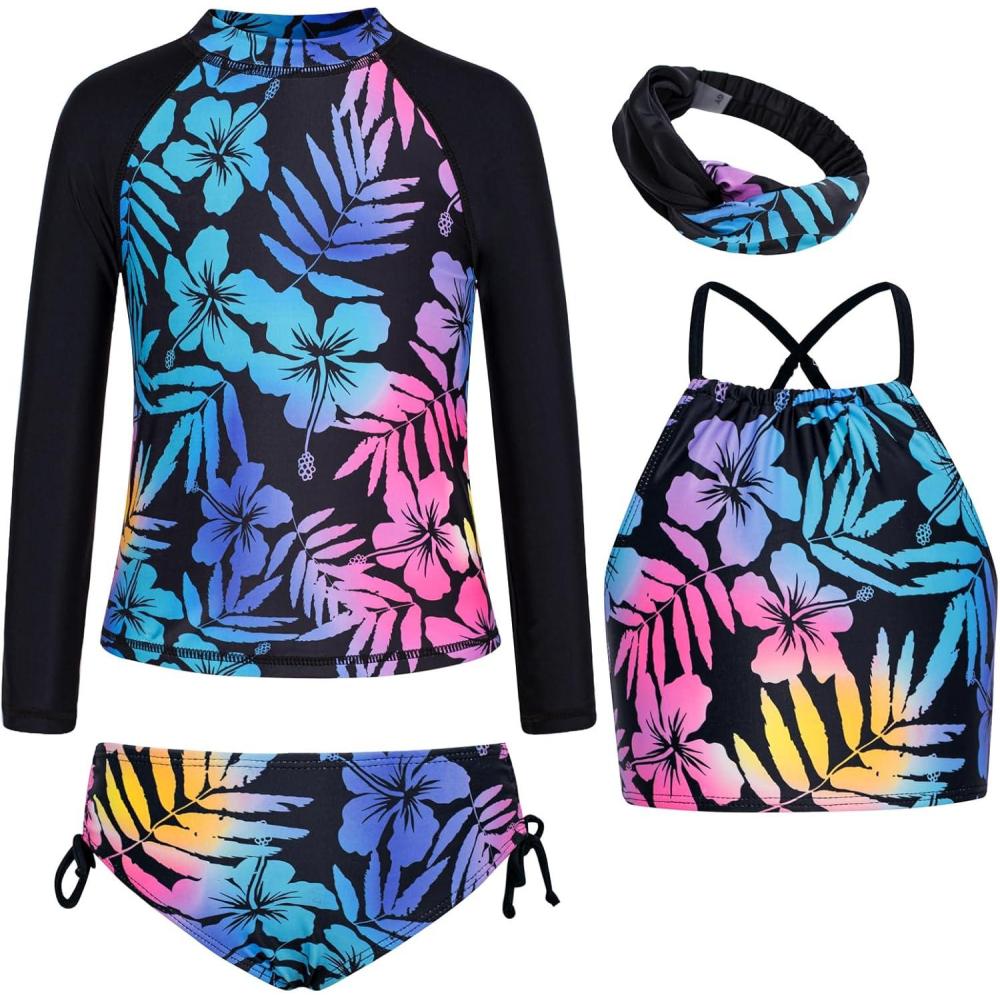 GRACE KARIN Girls Swimsuit Tankini Set Rash Guard Long Sleeve Swimsuit 4 Piece Bathing Suit Swimwear 5-14Y(Black Floral)