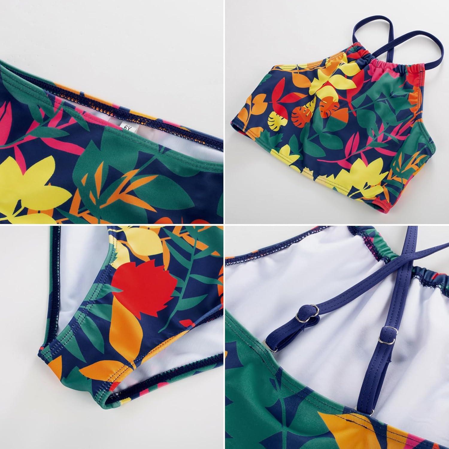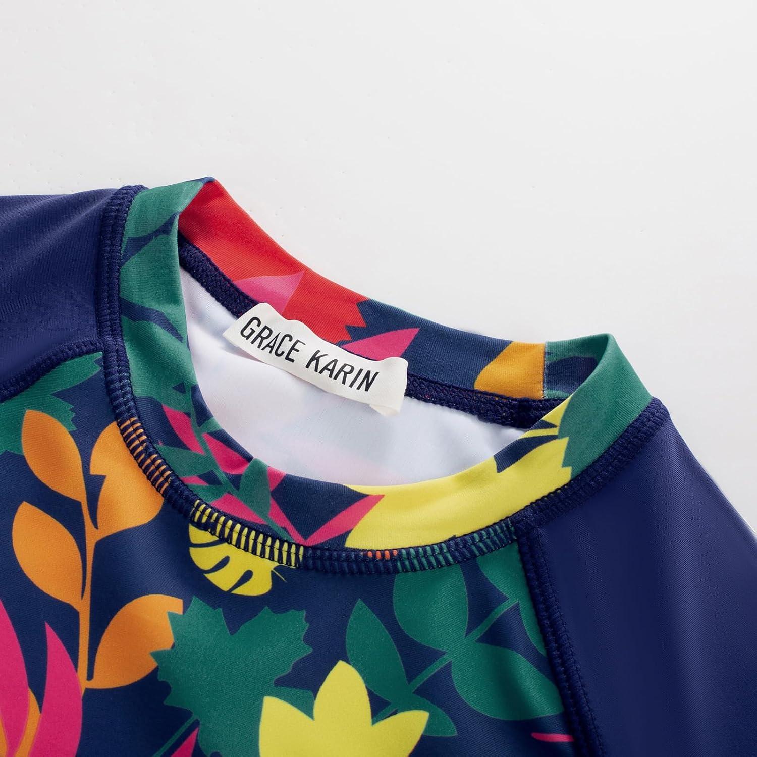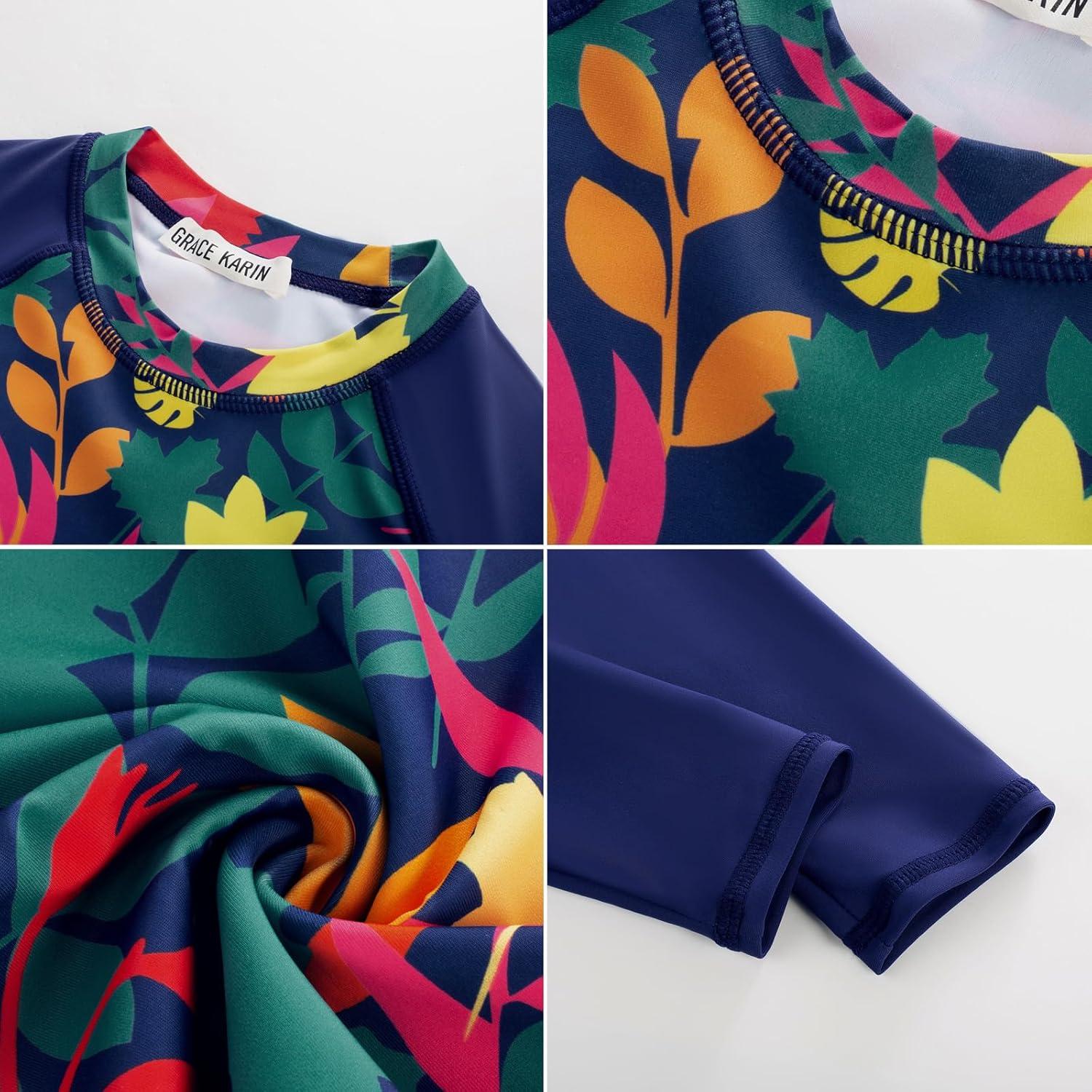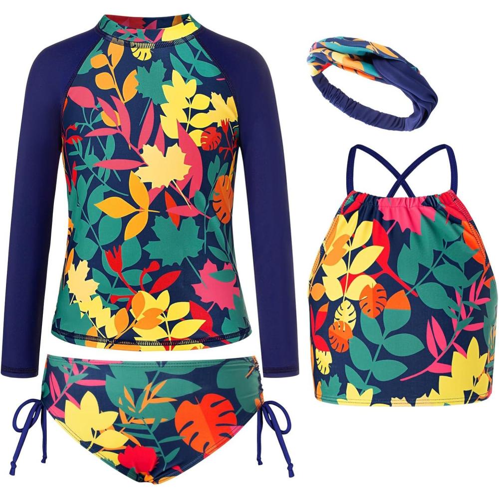 GRACE KARIN Girls Swimsuit Tankini Set Rash Guard Long Sleeve Swimsuit 4 Piece Bathing Suit Swimwear 5-14Y(Blue Purple Leaves)