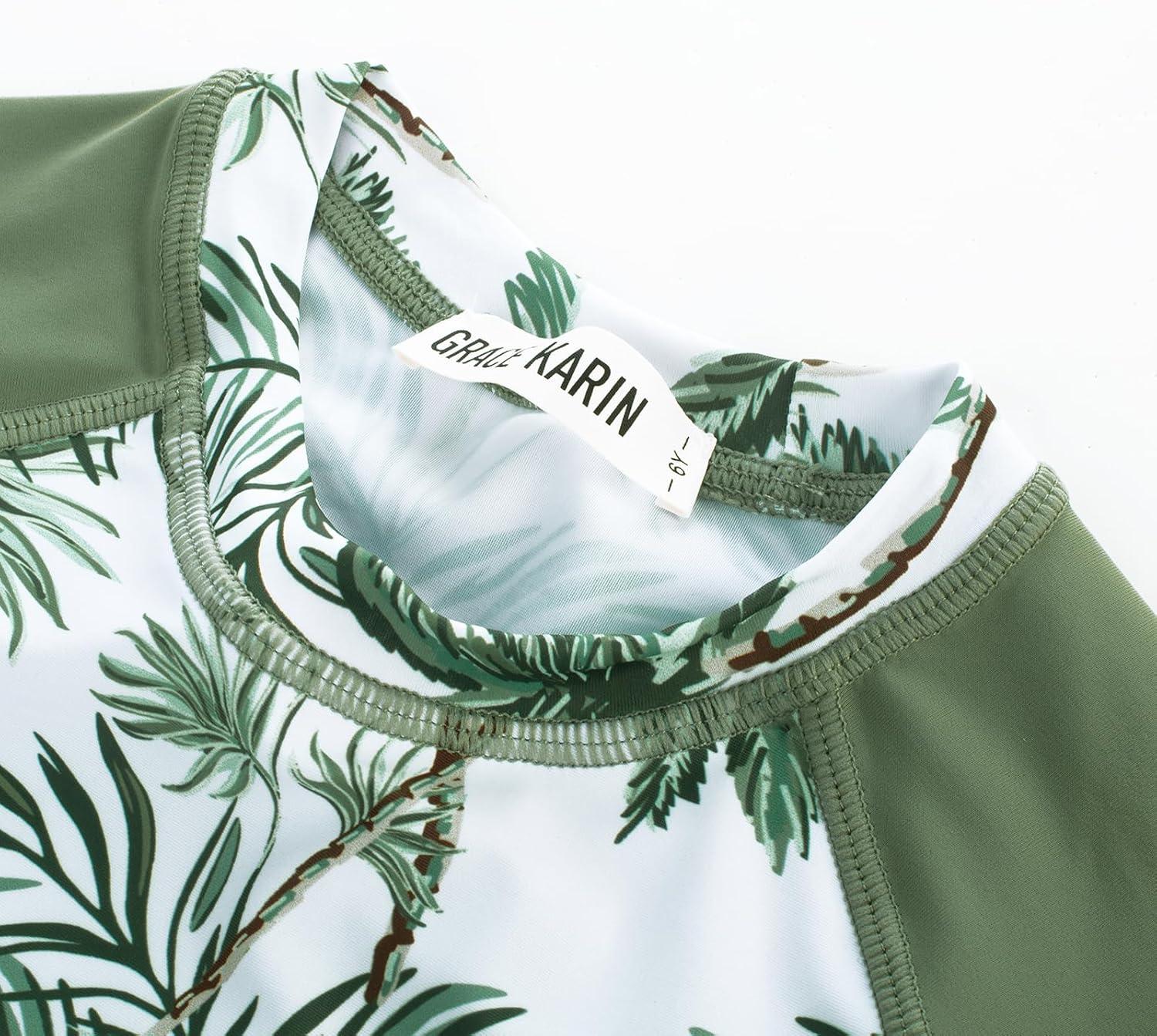 GRACE KARIN Girls Swimsuit Tankini Set Rash Guard Long Sleeve Swimsuit 4 Piece Bathing Suit Swimwear 5-14Y(Green Coconut Tree)