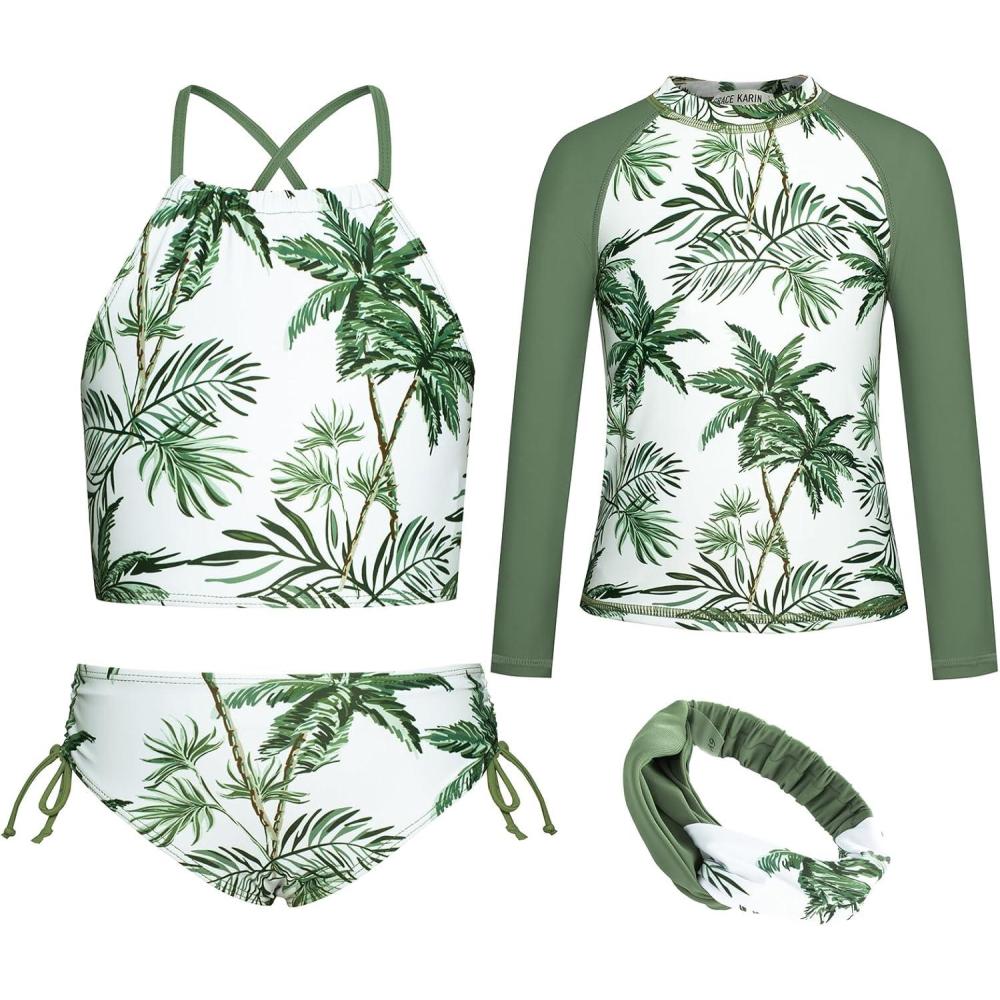 imageGRACE KARIN Girls Swimsuit Tankini Set Rash Guard Long Sleeve Swimsuit 4 Piece Bathing Suit Swimwear 514YGreen Coconut Tree