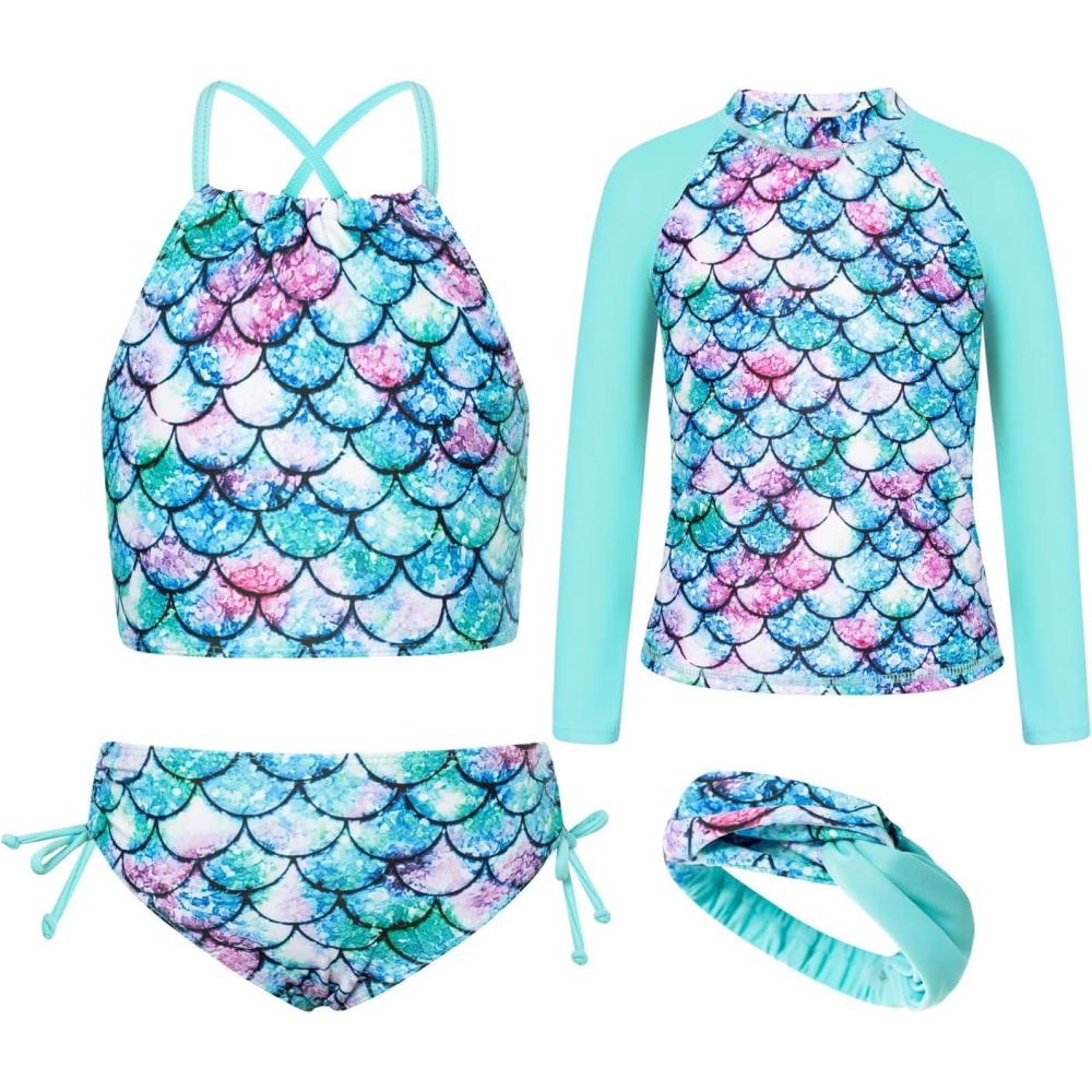 GRACE KARIN Girls Swimsuit Tankini Set Rash Guard Long Sleeve Swimsuit 4 Piece Bathing Suit Swimwear 5-14Y(Light Green Memaid)