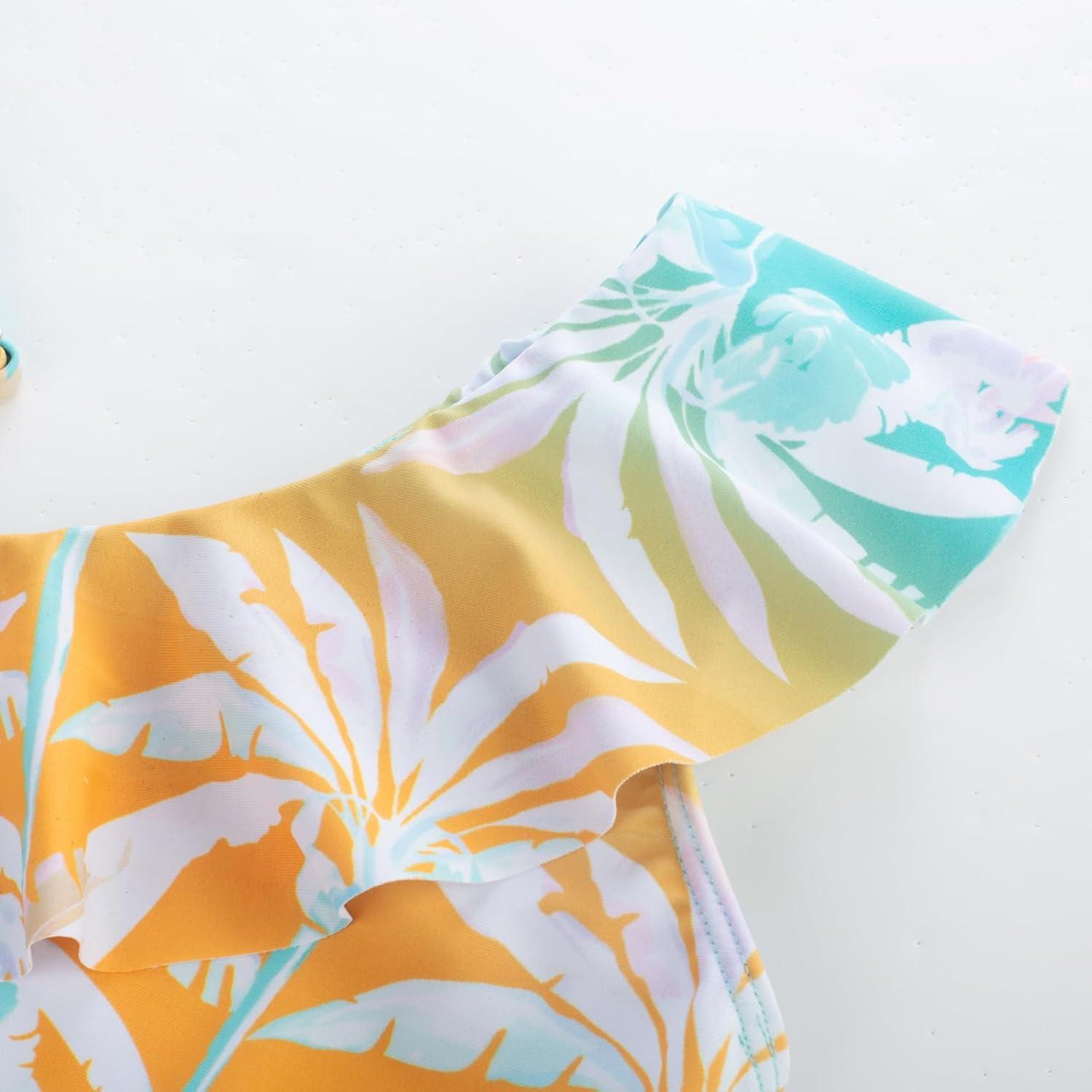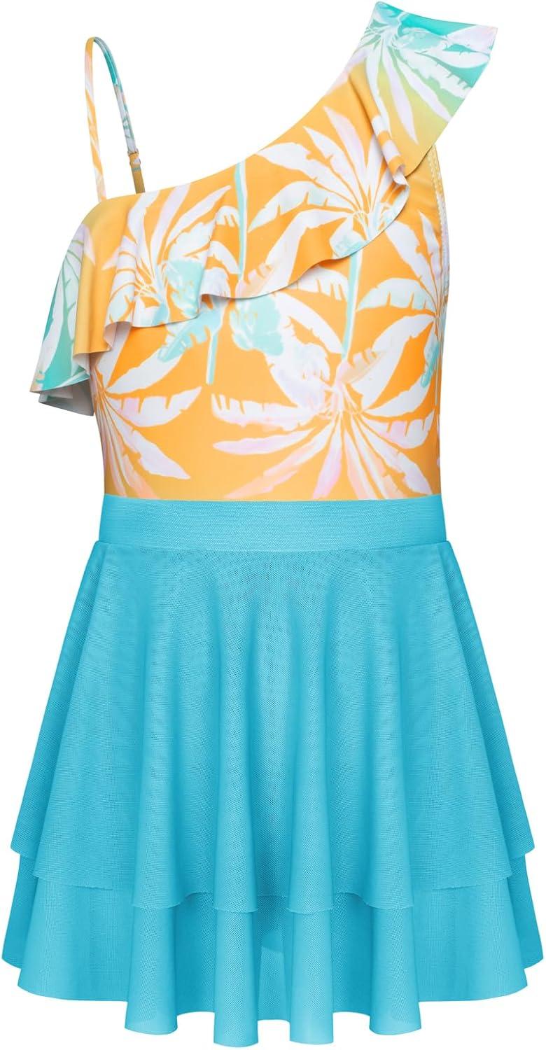 GRACE KARIN Girls Swimsuit with Skirt One Piece Bathing Suit Swimwear 6-14Y(Yellow Green Coconut Tree)