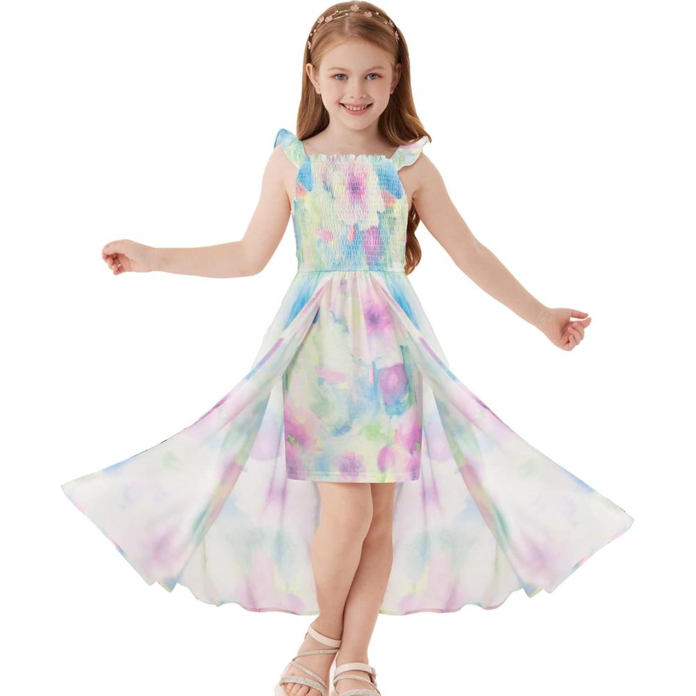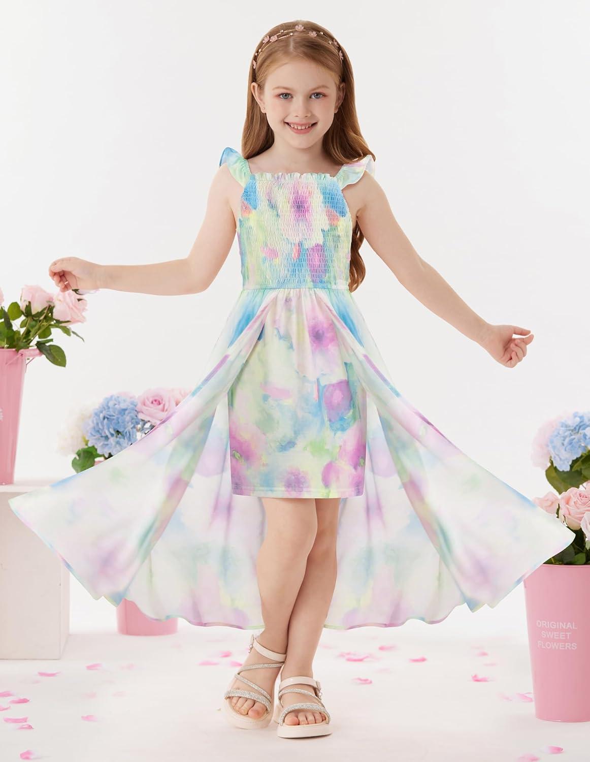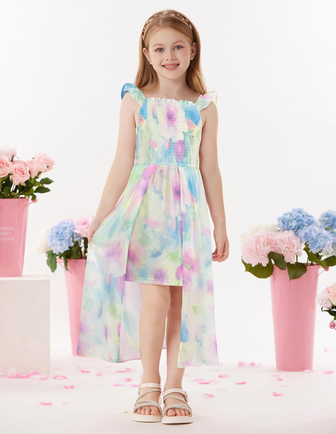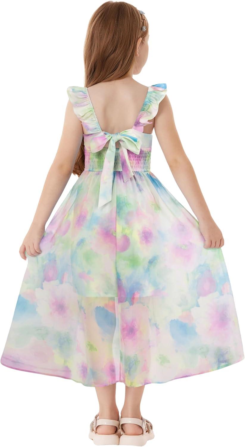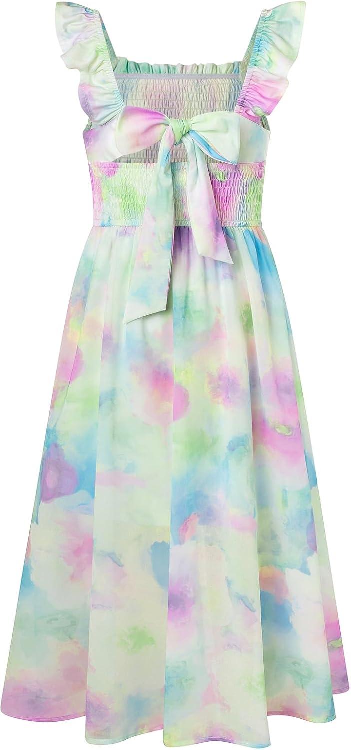 GRACE KARIN Girls Tie Back Floral Dress Flutter Sleeves Casual Spring Summer Maxi Dresses for 5-14Y(Green Tie-dye)