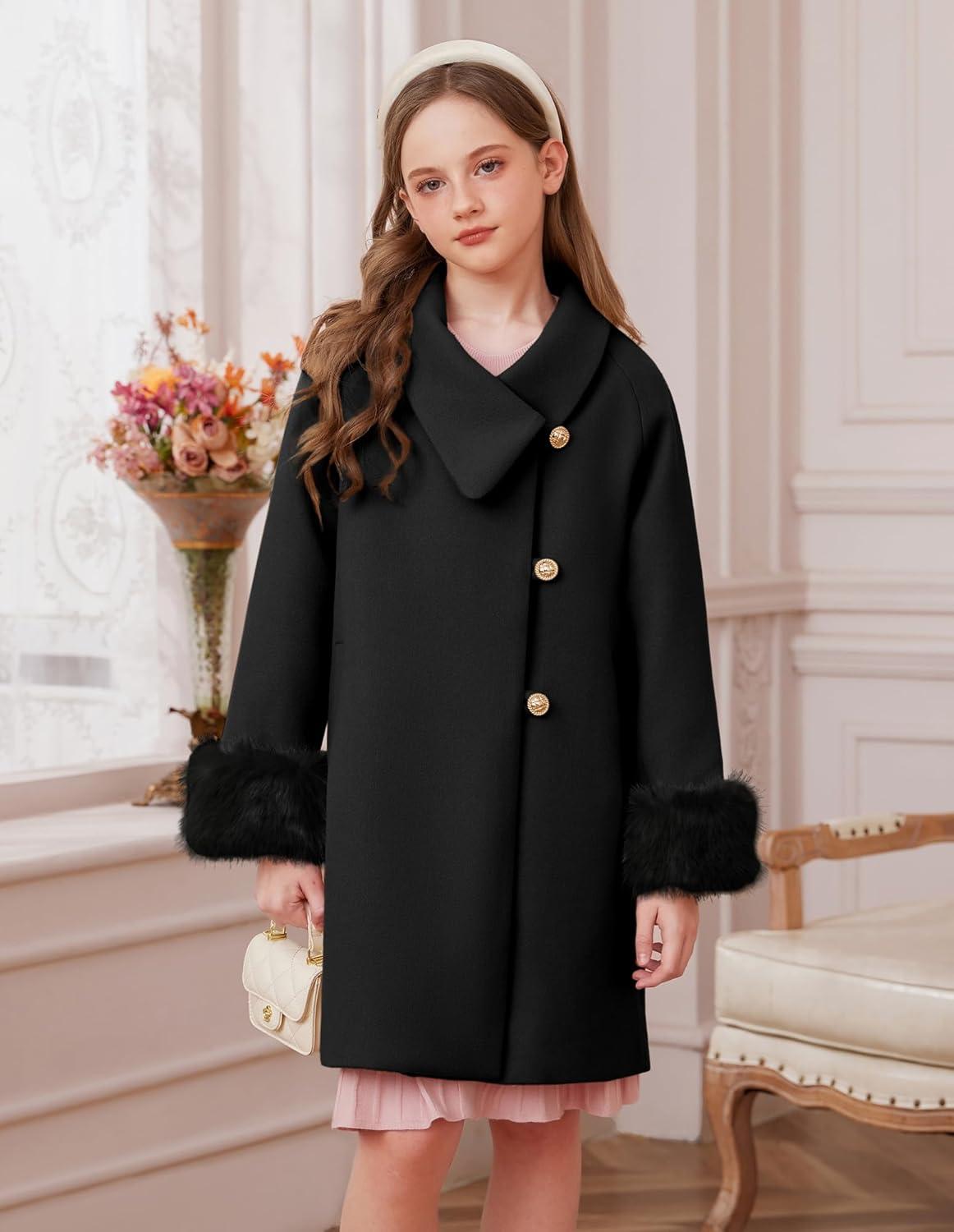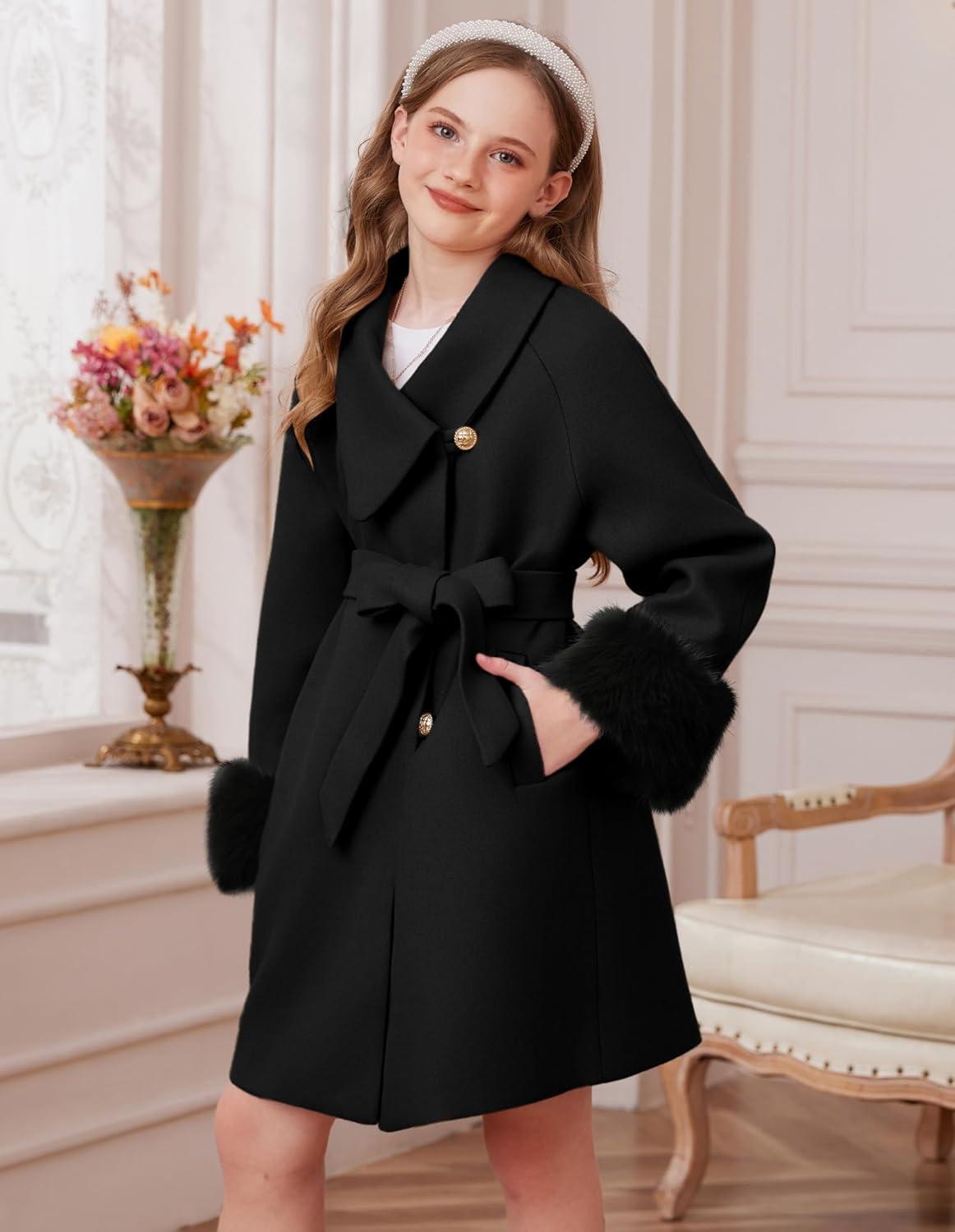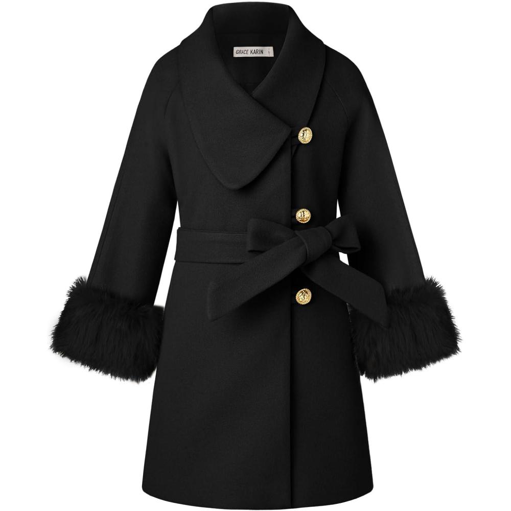 GRACE KARIN Girls Winter Dress Coat Girl Faux Fur Long Sleeve Jacket Kids Long Lined Outerwear with Pockets Belt(Black)