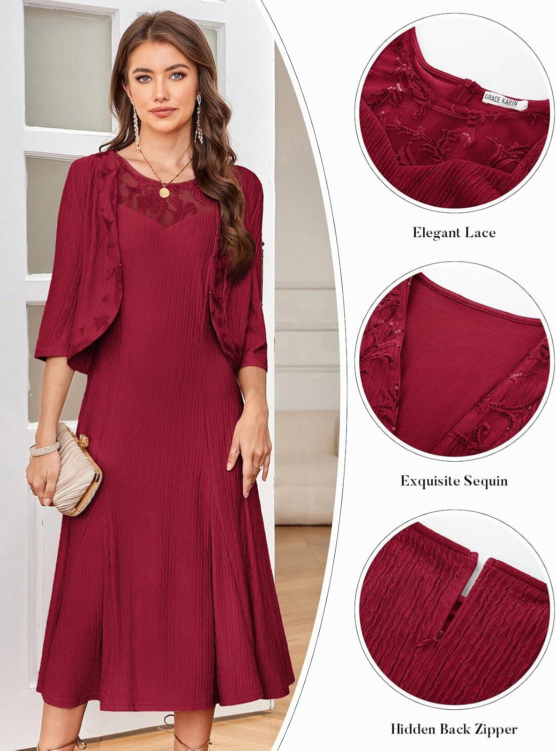 GRACE KARIN Grandma of The Bridal Dress,Weddings Cocktail Evening Dresse for Women, Lace Sequins Midi Dresses with Jackets(Bright Red)