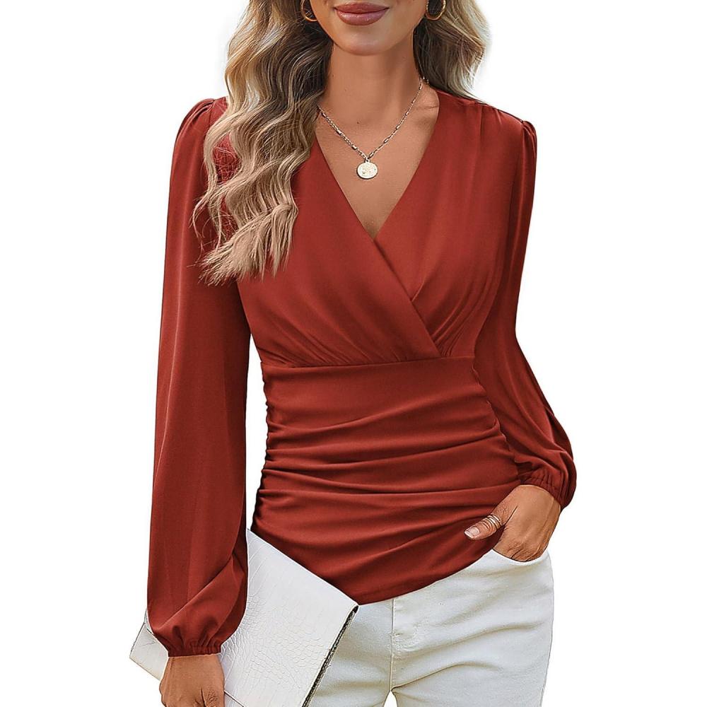 GRACE KARIN Long Sleeve Blouses for Women Dressy Casual, Elegant Wrap Tops V Neck Work Shirts, 2025 Fall Business Outfits(Coffee)