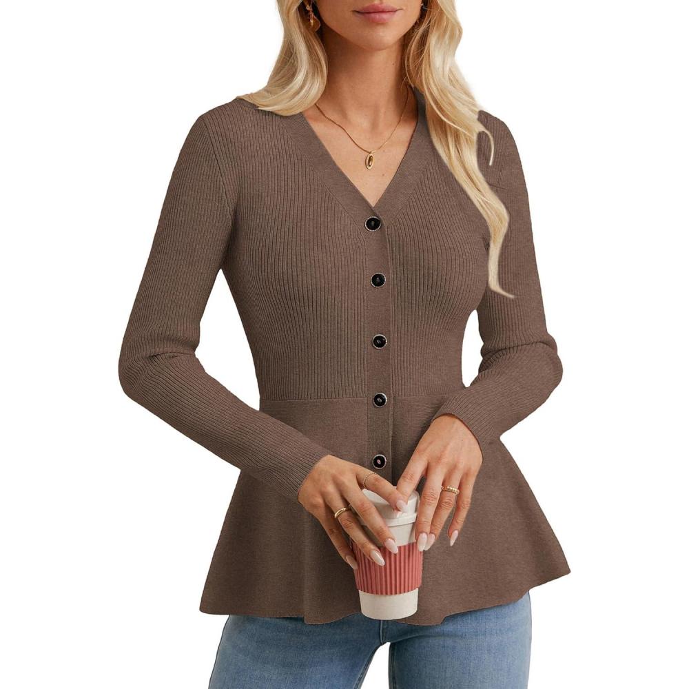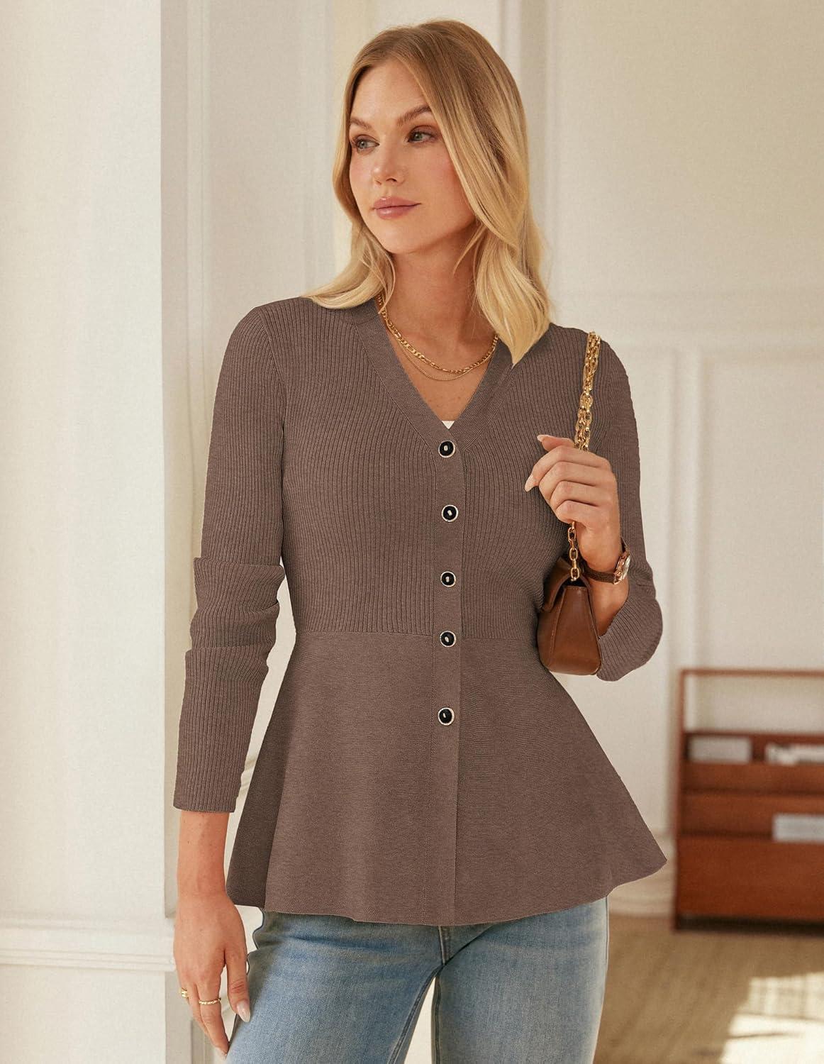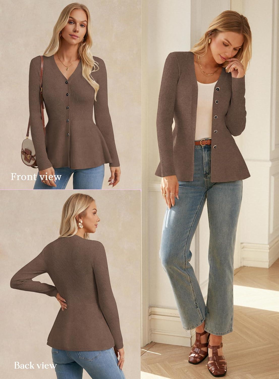 GRACE KARIN Long Sleeve Cardigan Sweaters for Women, Button Up Knit Blazer, Lightweight Business Casual Peplum Tops(Brown)