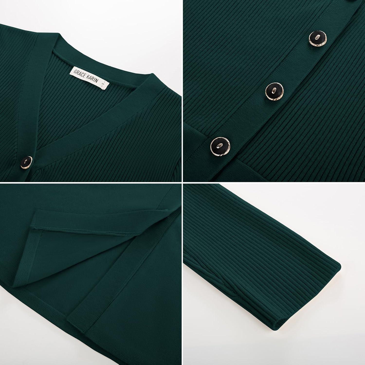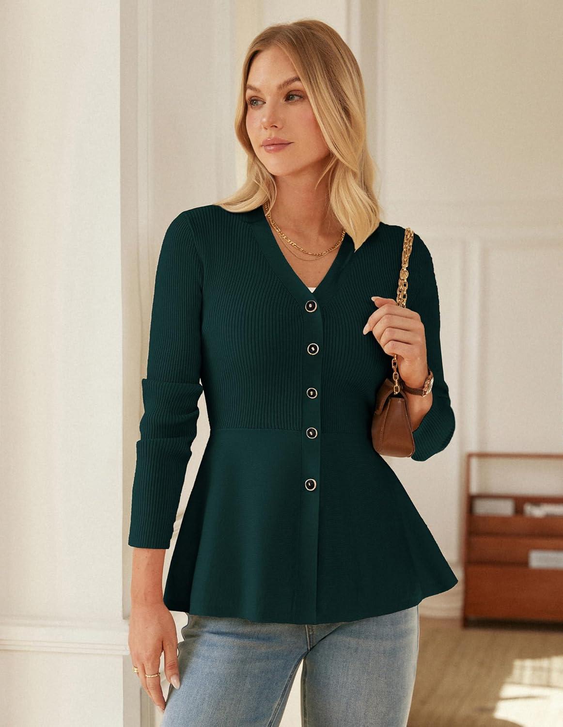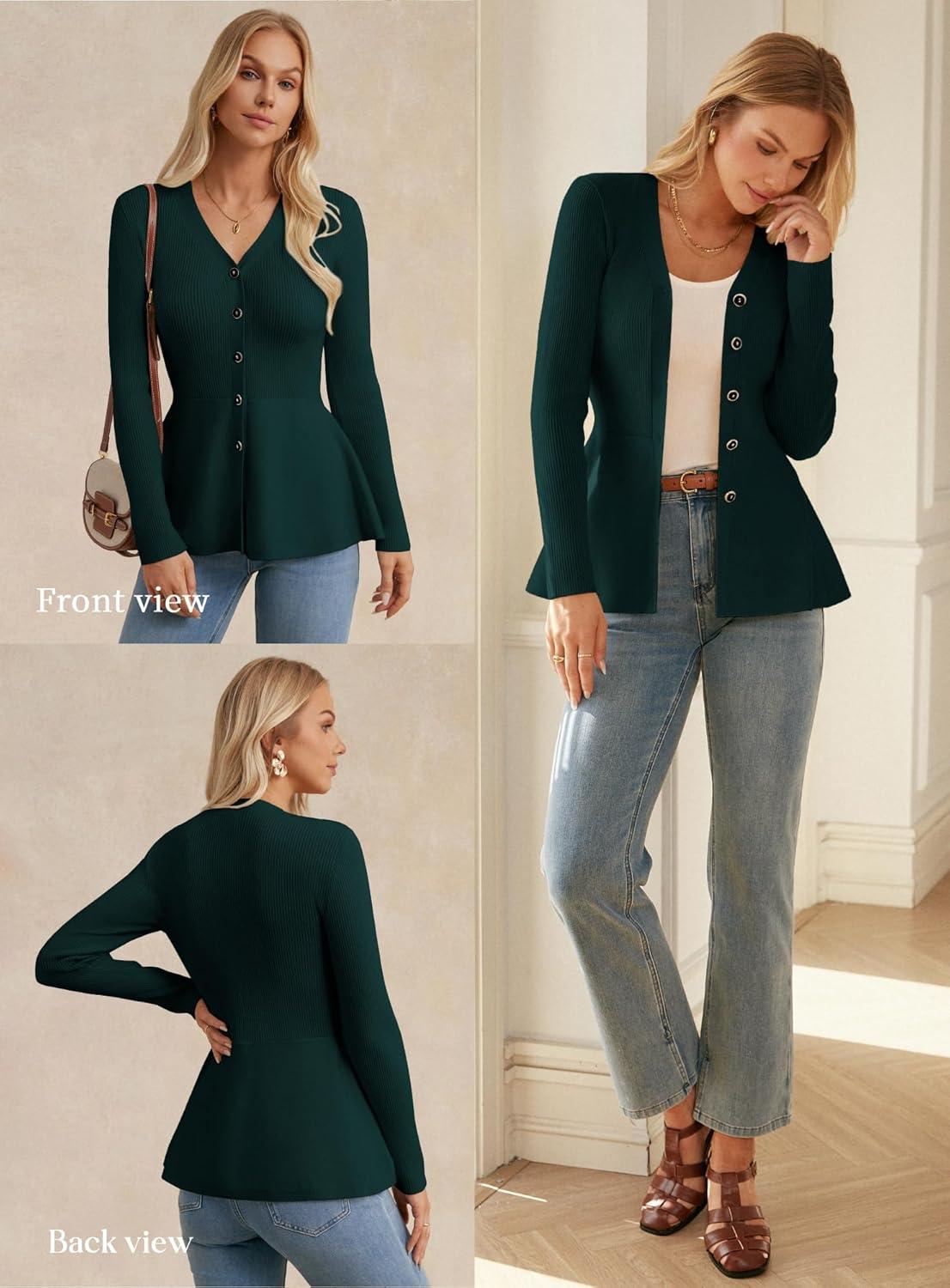 GRACE KARIN Long Sleeve Cardigan Sweaters for Women, Button Up Knit Blazer, Lightweight Business Casual Peplum Tops(Dark Green)