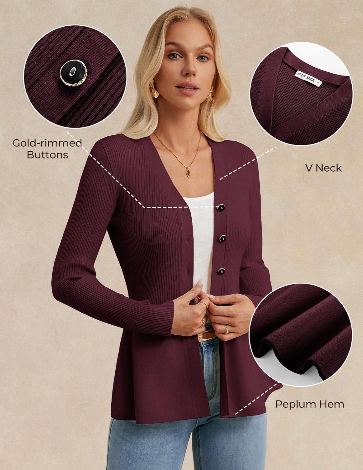 GRACE KARIN Long Sleeve Cardigan Sweaters for Women, Button Up Knit Blazer, Lightweight Business Casual Peplum Tops(Wine Red)