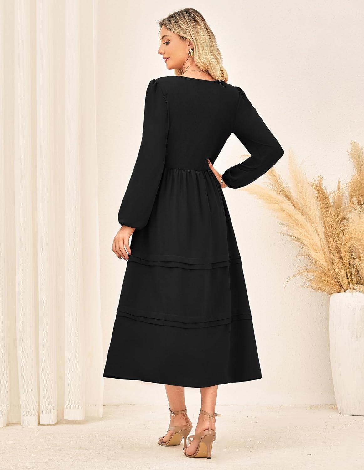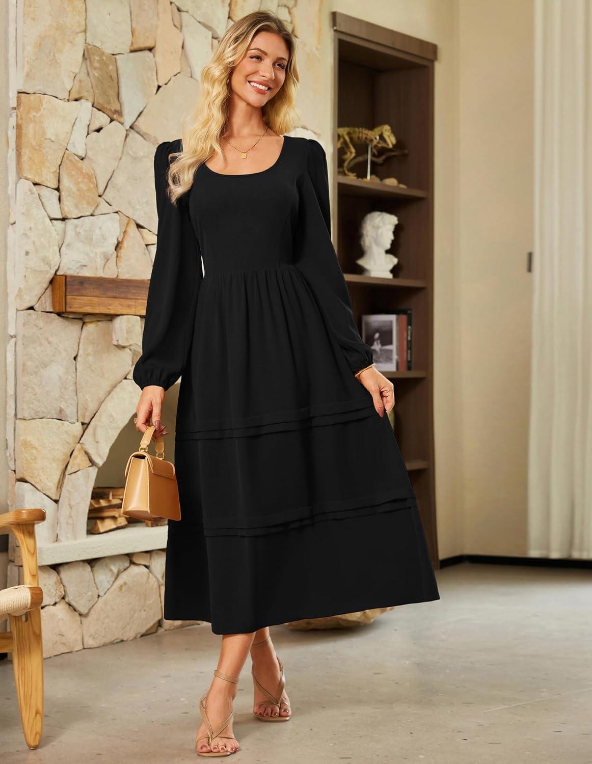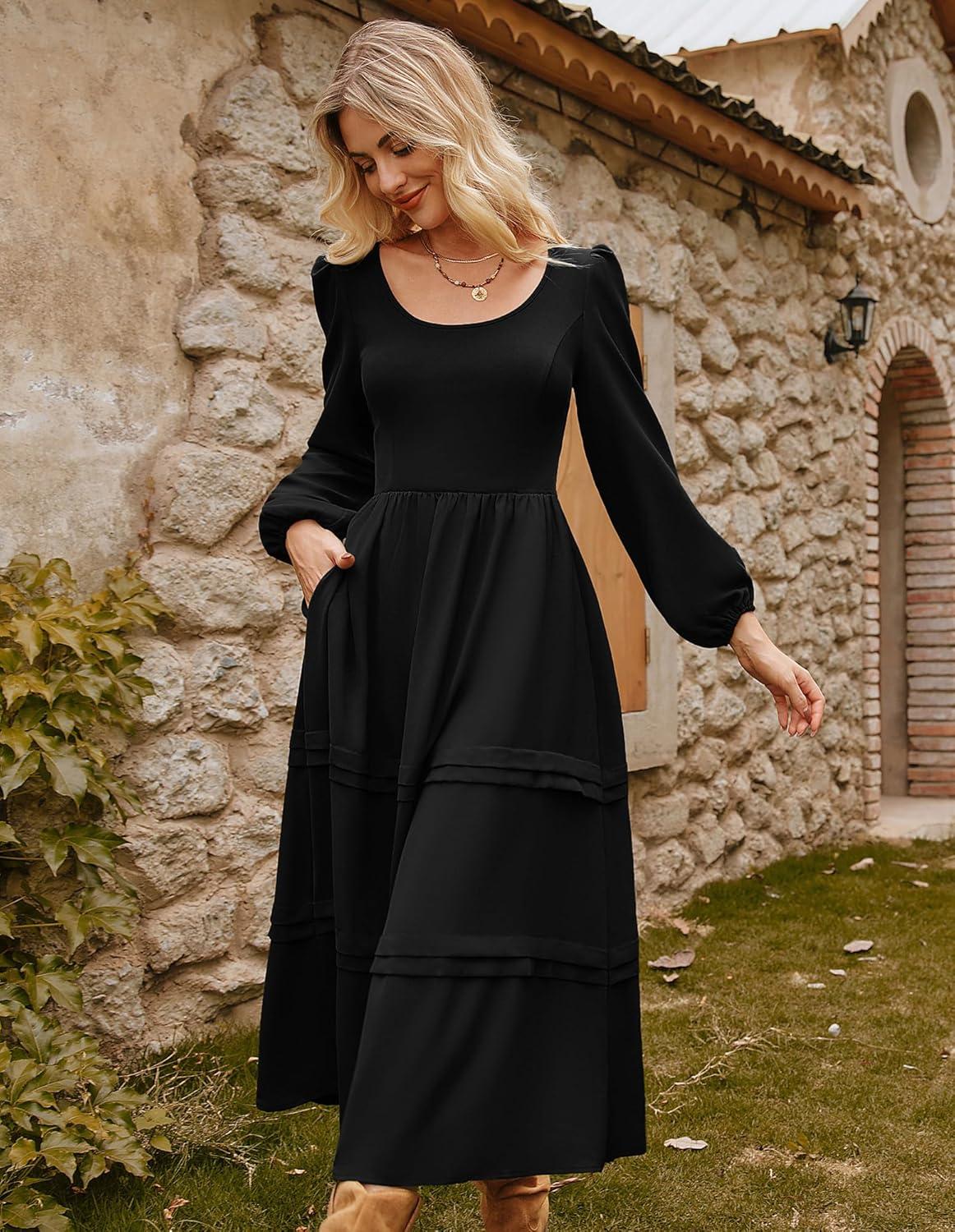 GRACE KARIN Long Sleeve Dresses for Women 2025 Fall Outfits Puff Crewneck Wedding Guest Casual Dresses with Pockets(Black)