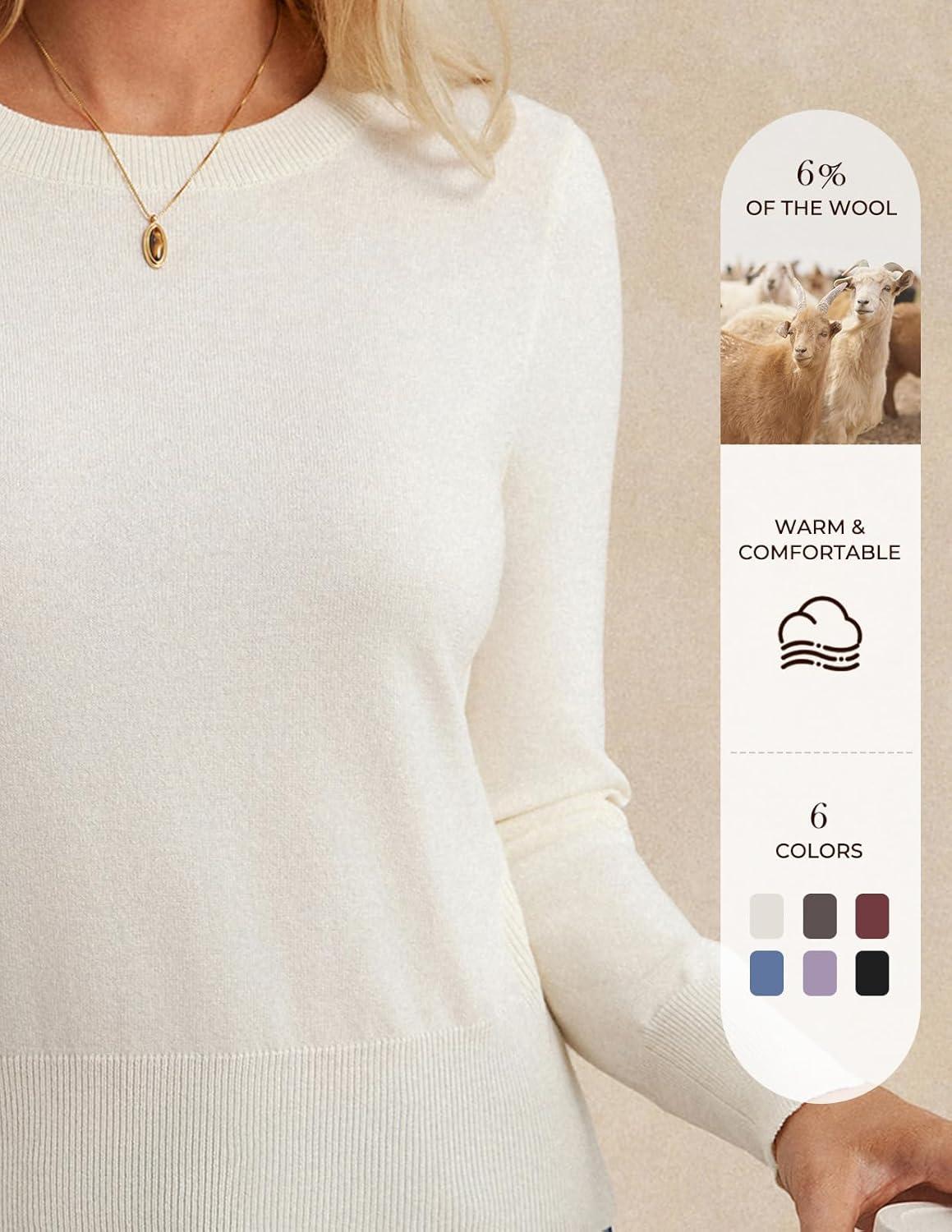 GRACE KARIN Long Sleeve Sweaters Merino Wool Blend, Lightweight Crewneck Sweater 2025 Fall, Fashion Pullover Knit Tops(White)