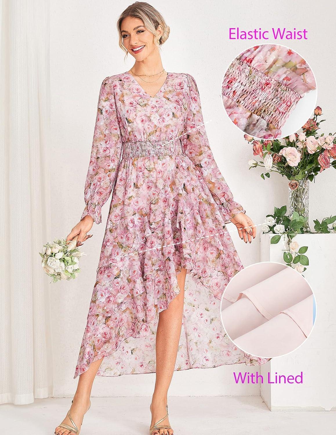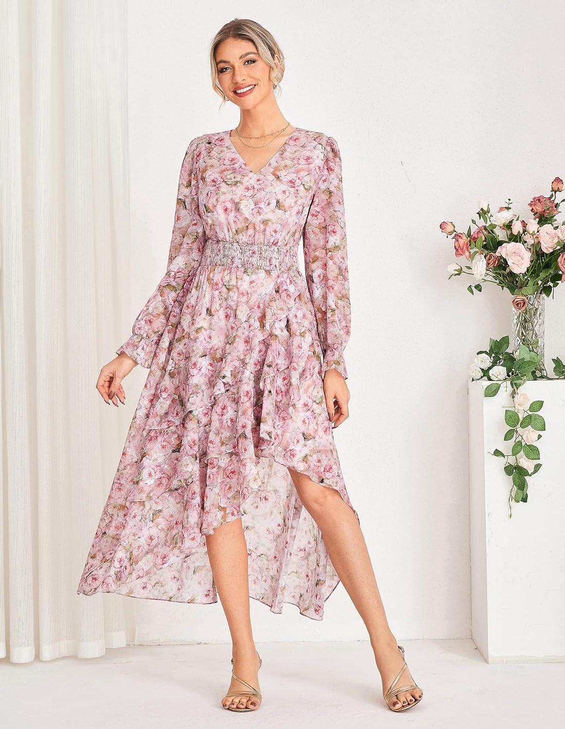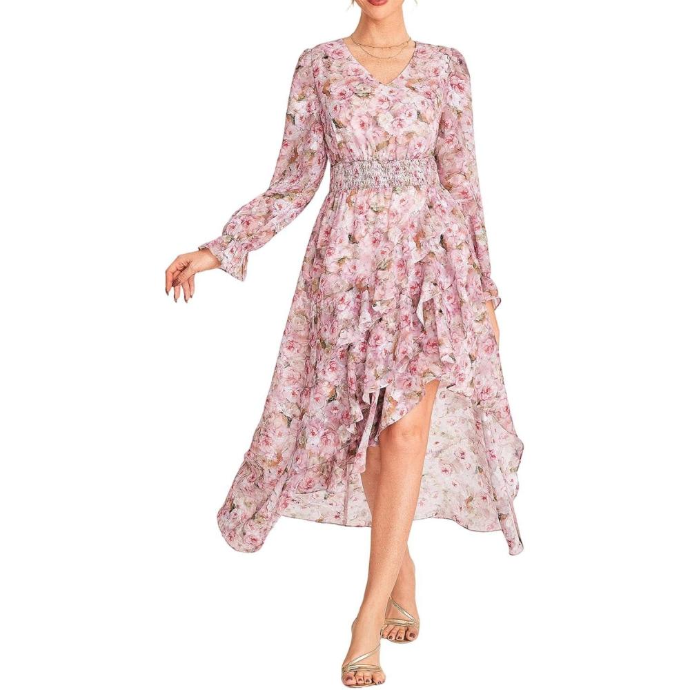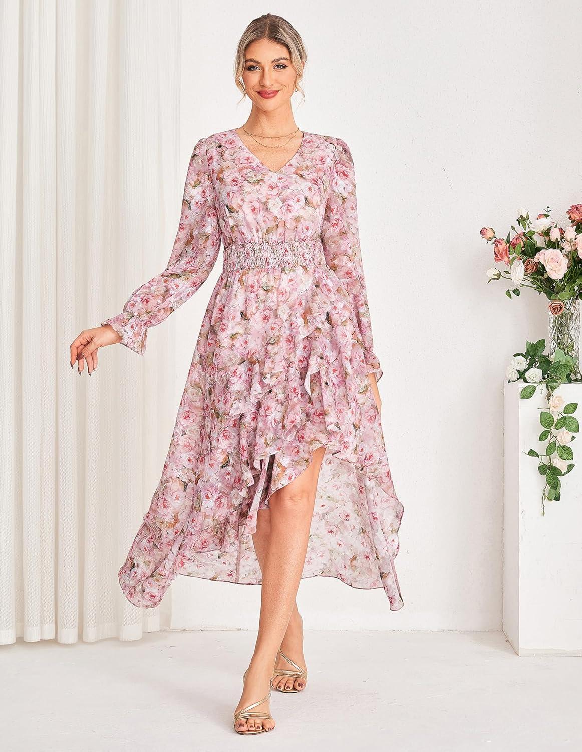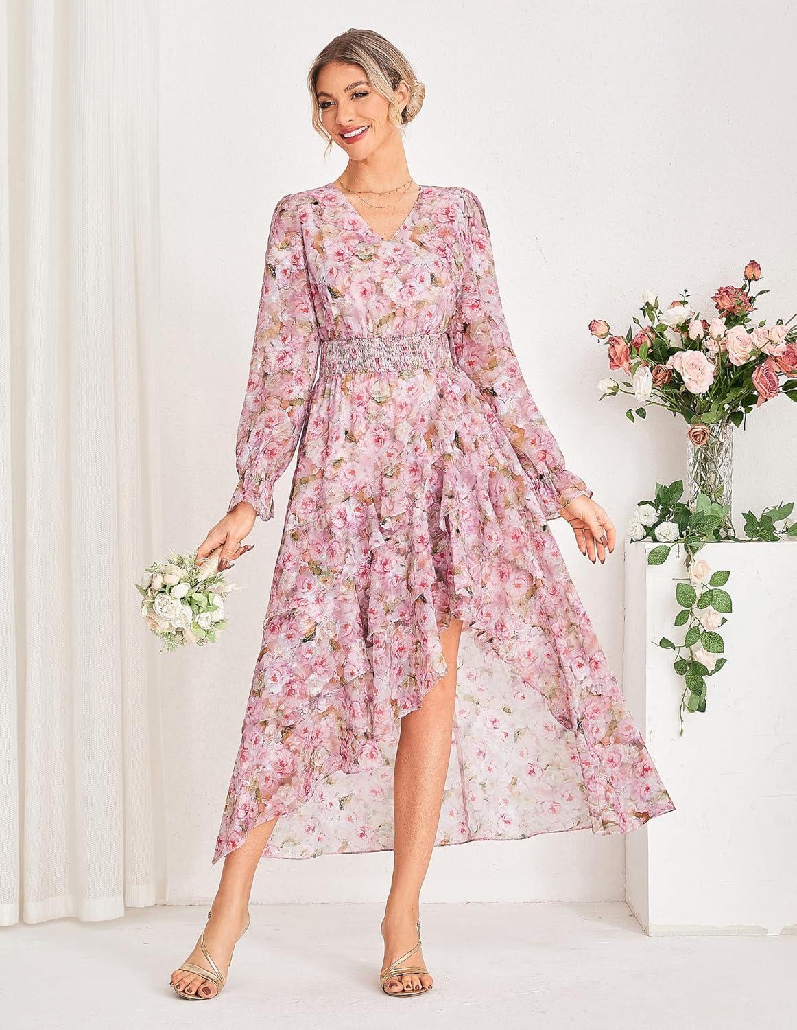 GRACE KARIN Long Sleeve Wedding Guest Dress 2025, Boho Maxi Fall Dresses, Chiffon Flowy Floral Dress Formal Cocktail Party(Pink Floral)