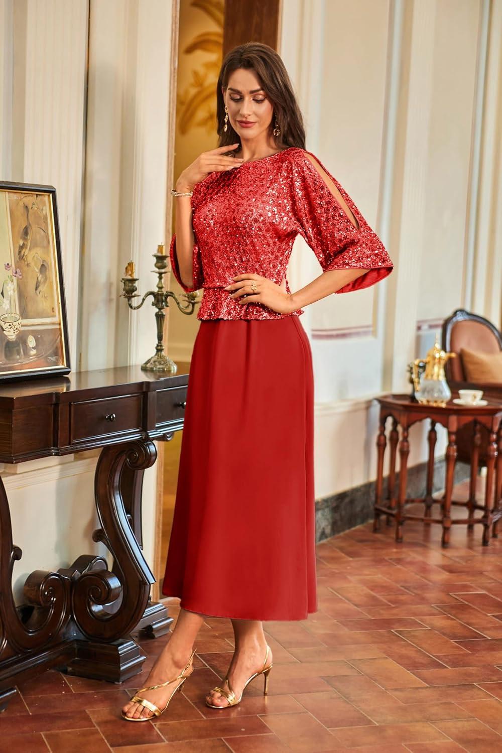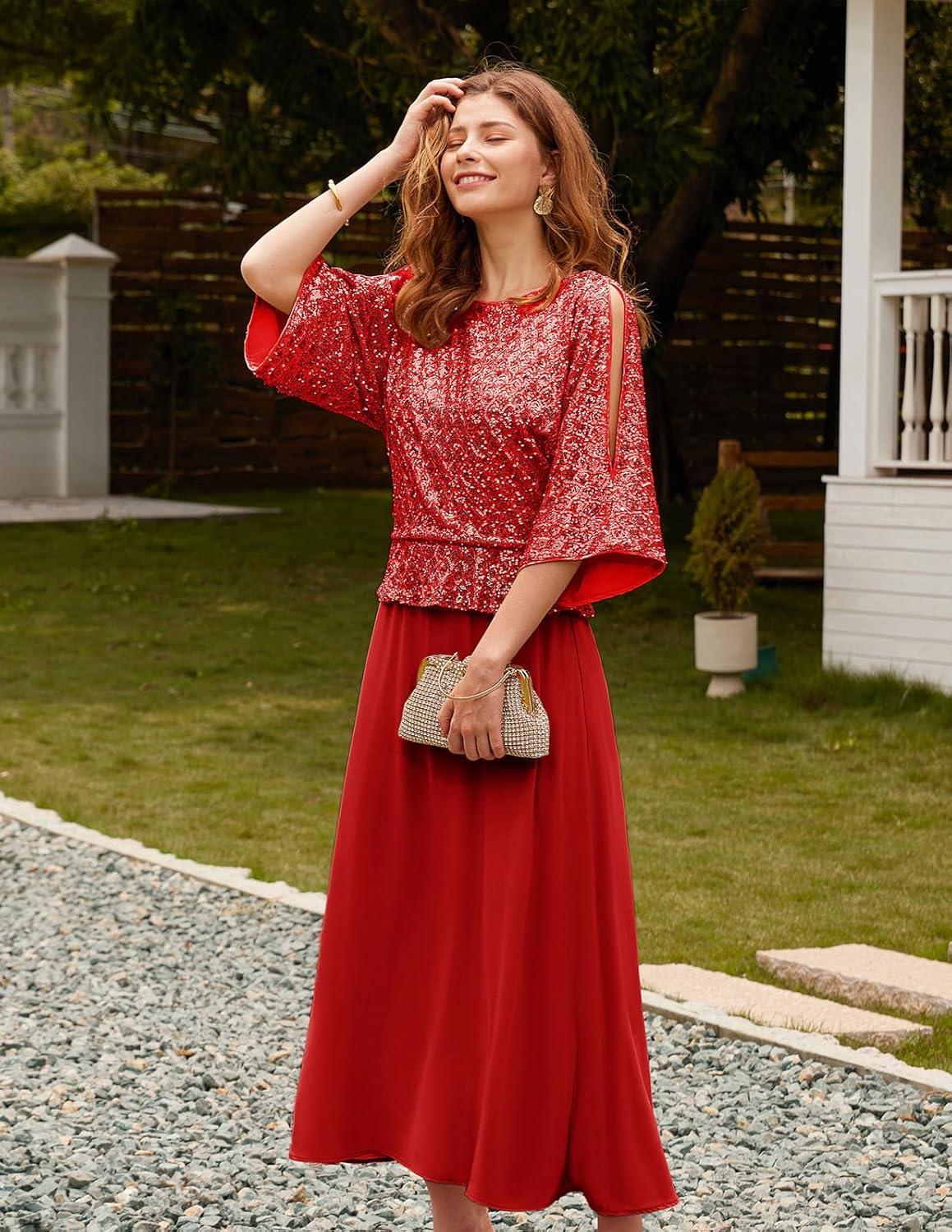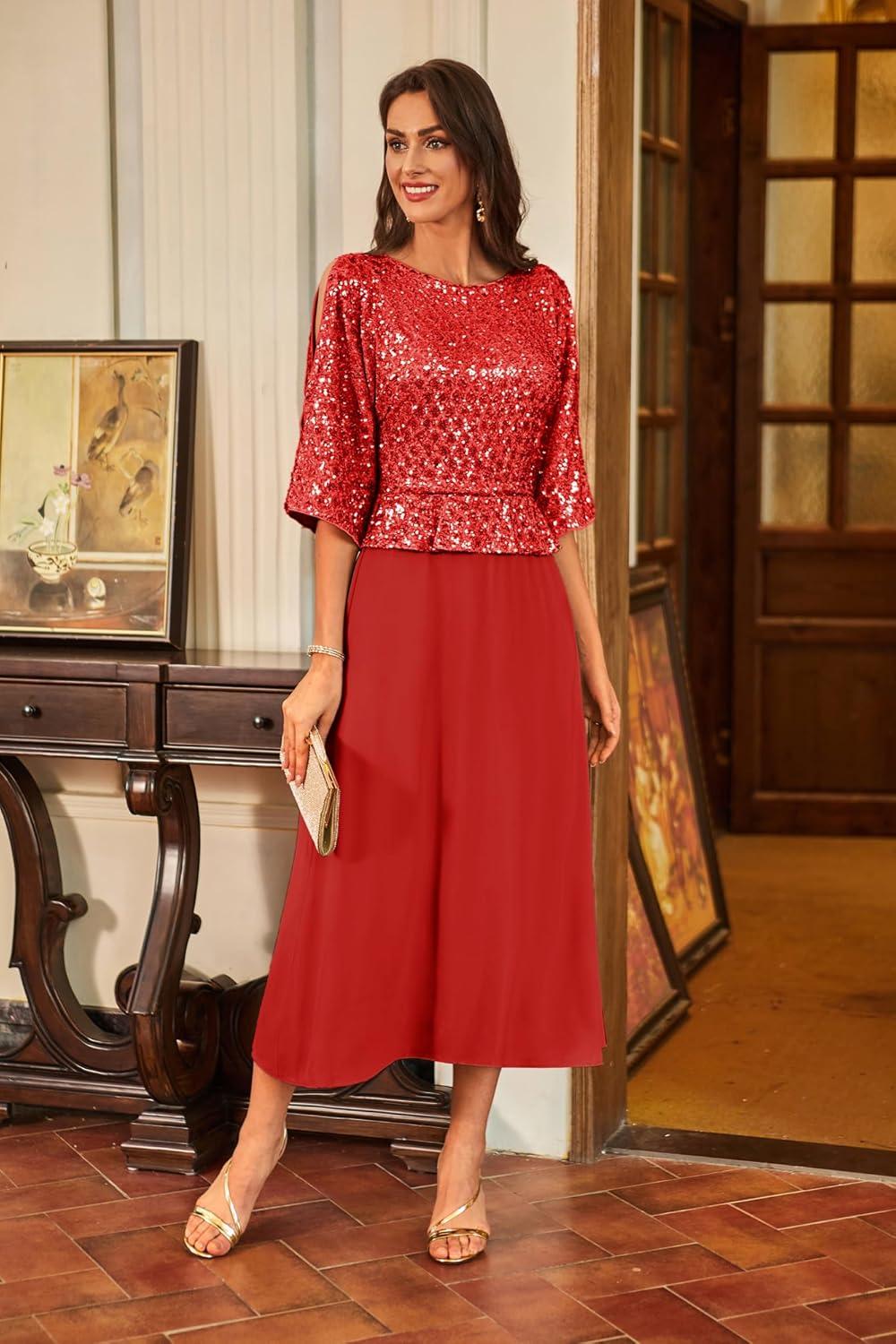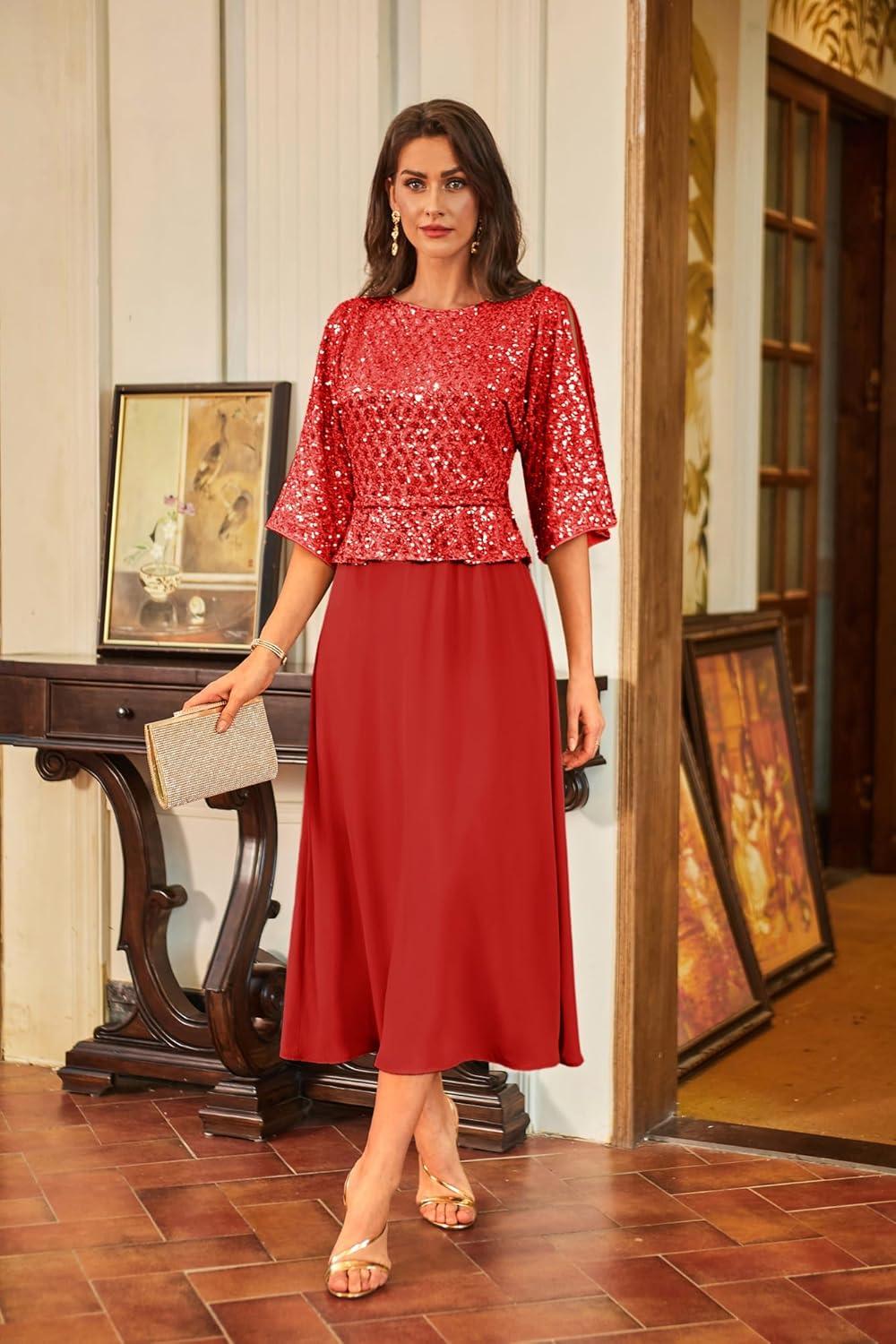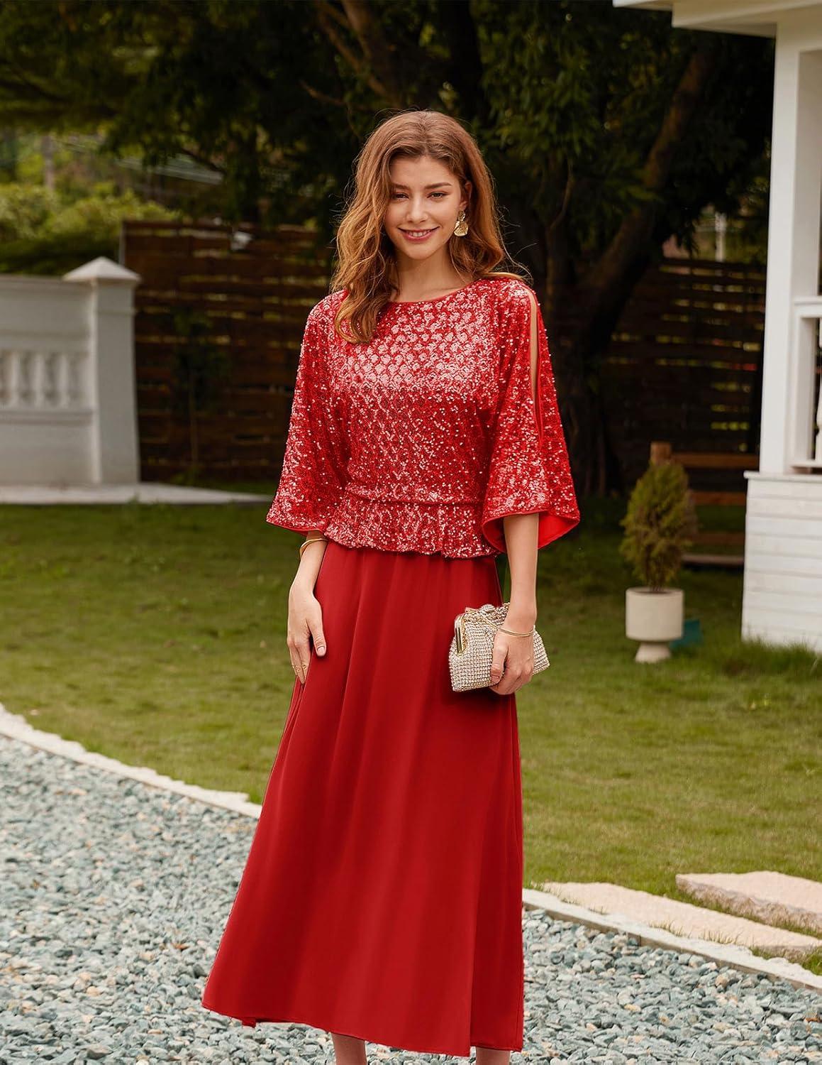 GRACE KARIN Mother of Bride Dresses 2025, 3/4 Sleeve Sequin Dress Maxi, Elegant Wedding Guest Dress Formal Cocktail(Red)