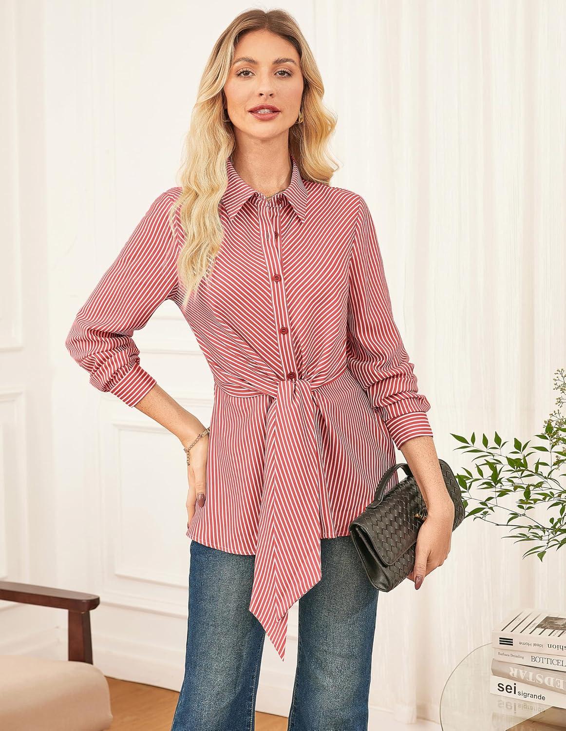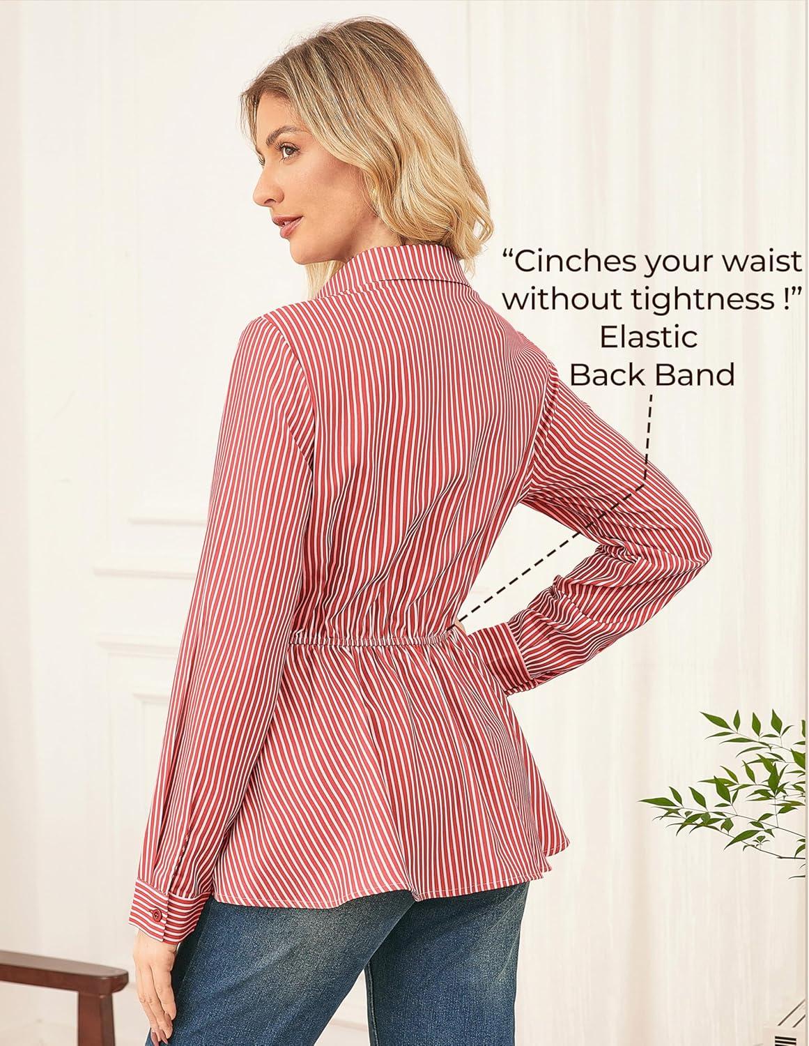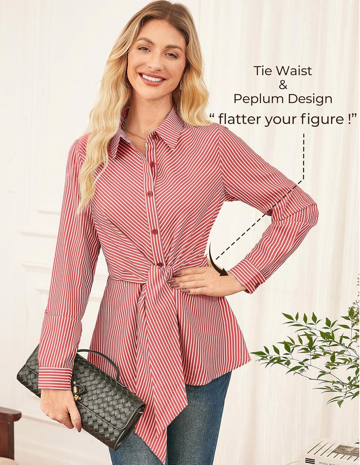 GRACE KARIN Peplum Tops for Women Tie Front Striped Button Down Shirt Collared Long Sleeve Business Casual Work Office Blouse(Red)